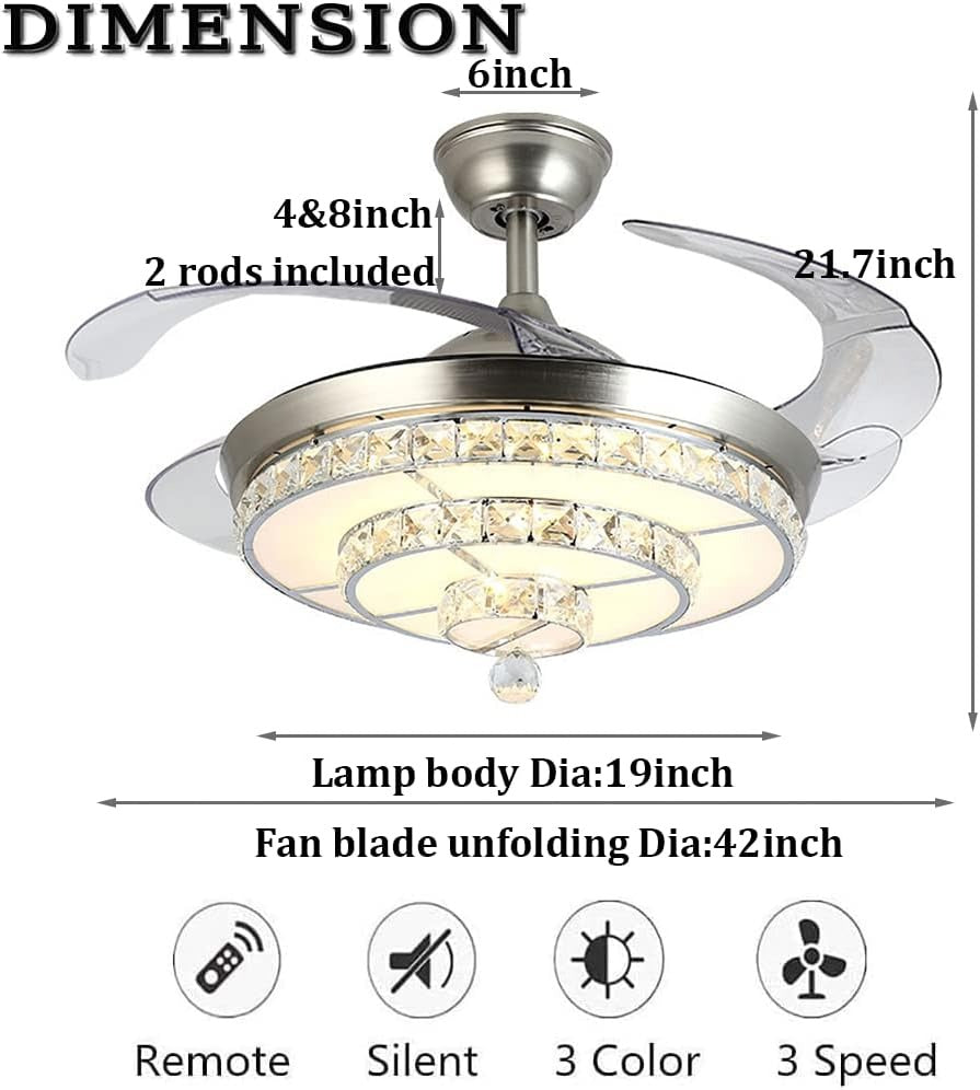 - 【Fandelier Size】: Crystal ceiling fan with light size 42*42*17inch / 107*107*43cm / L*W*H, Package comes with 2 rods 4" / 7.8" to fit different ceiling height, downrod can be customized if request.