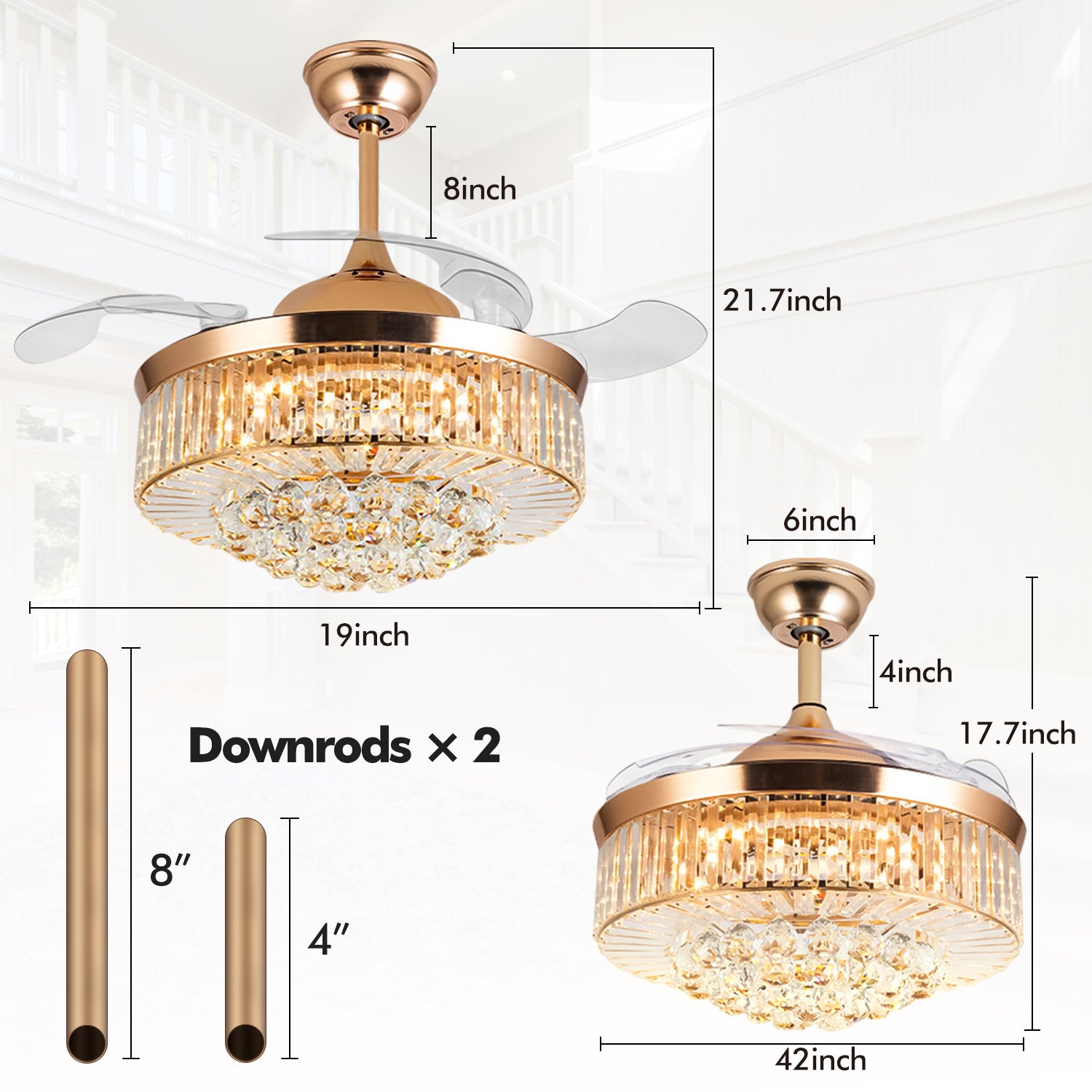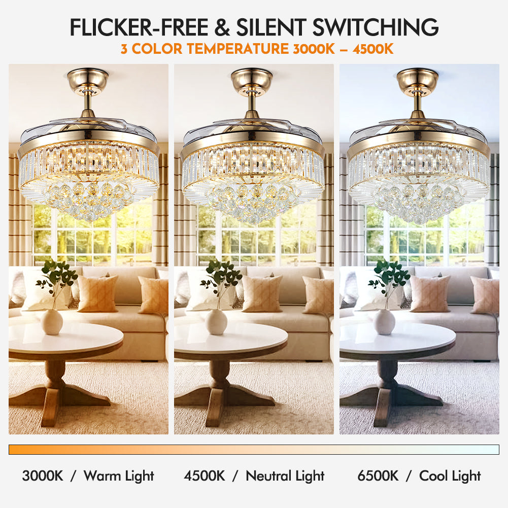 The fandelier features 4 invisible acrylic blades that extend to a full 42" diameter when in use and effortlessly retract to just 20" when not needed. This innovative feature allows you to customize the airflow and visual aesthetics to your preferences.
