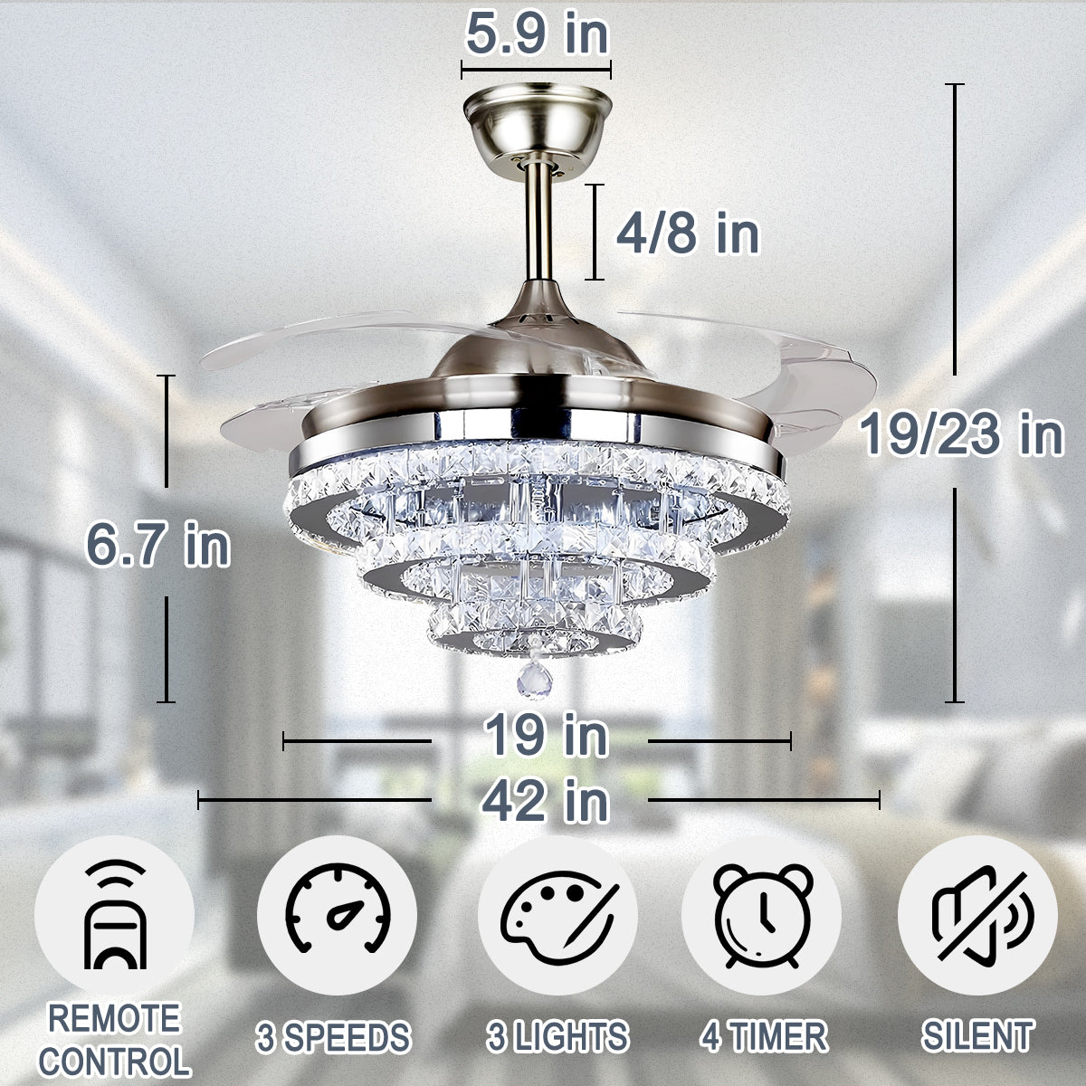 Lamp body size: 19" (diameter) * 7" (height) (when the fan blade shrinks)