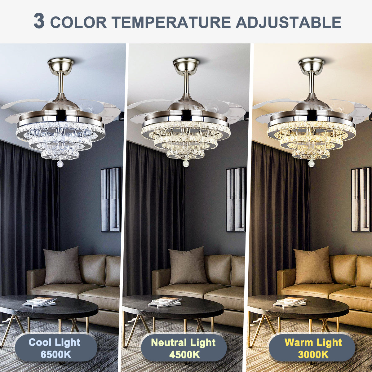 Control mode: With remote control, LED lamp three-tone light (white light, neutral light, warm light) LED lamp wattage (36W), lumen (3500K), air flow (CFM) wind flow in 5000CFM