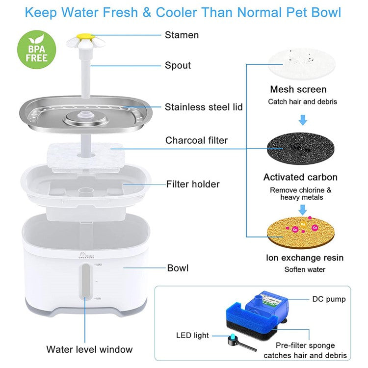 2. For the health of your pet, it is suggested to change the water and clean the fountain once a week.
