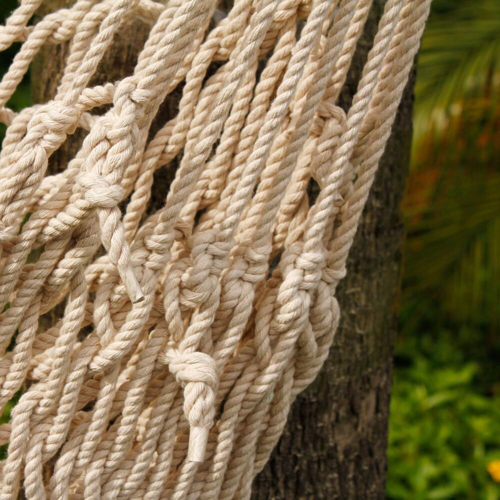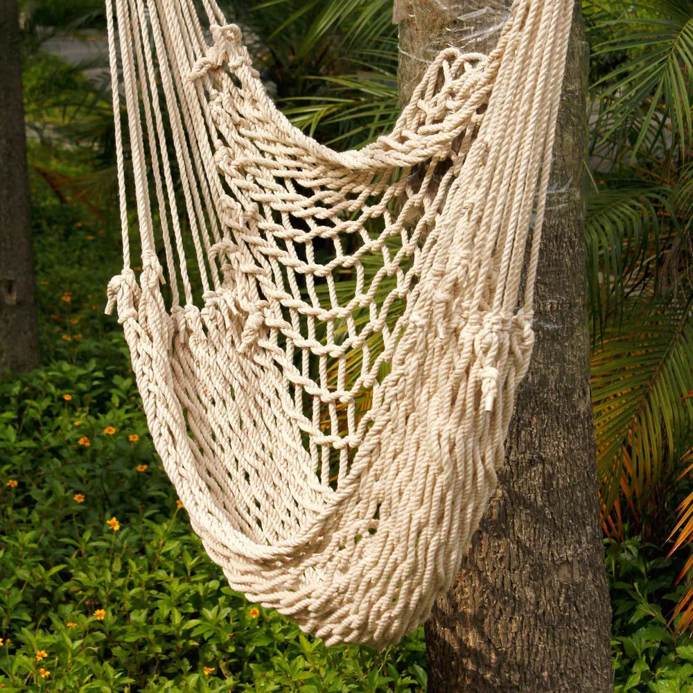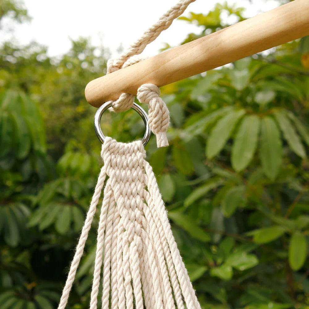 Experience a tranquil escape with our Beige Cotton Rope Hanging Air/Sky Chair Swing. Made from premium quality cotton rope and a sturdy wooden bar, this netted swing offers superior comfort and style. Lightweight and easy to set up, it can be hung indoors or outdoors, making it perfect for backyard lounging, camping trips, or any outdoor adventure. Its tropical beige color adds a touch of paradise to any space, while the wood stretcher provides extra support for a relaxing experience.