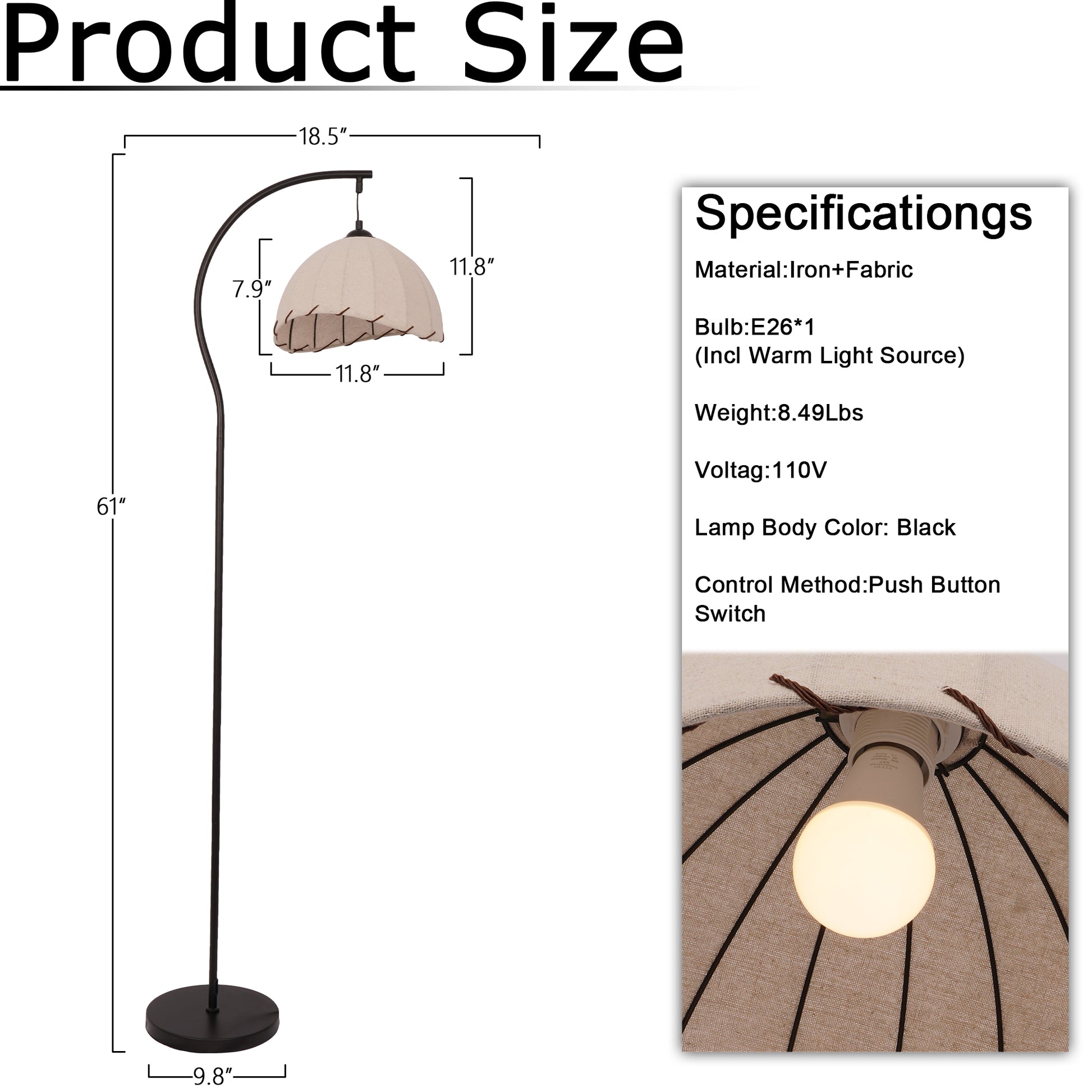 - Vintage Fabric Dome & Curved Frame Design: The lamp is topped with a beige fabric dome lampshade, adorned with wavy edges and hand-stitched brown details, diffusing light into a soft, warm glow that mimics the cozy ambiance of old-fashioned lanterns. The black curved metal arc frame adds a sleek, functional touch, directing light exactly where you need it (e.g., over a sofa, bed, or desk).