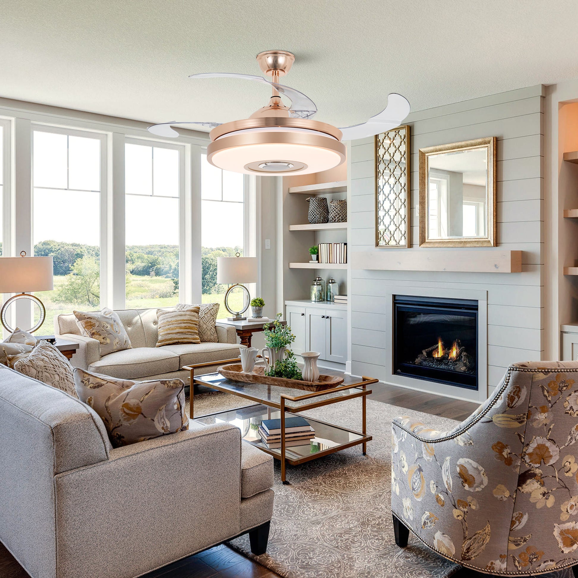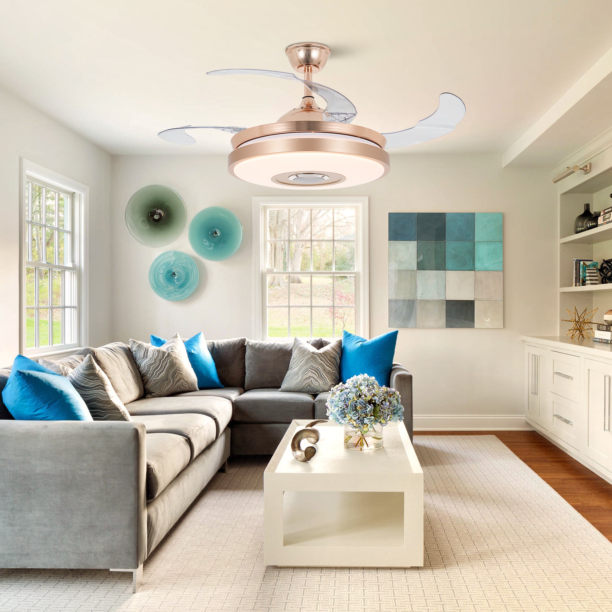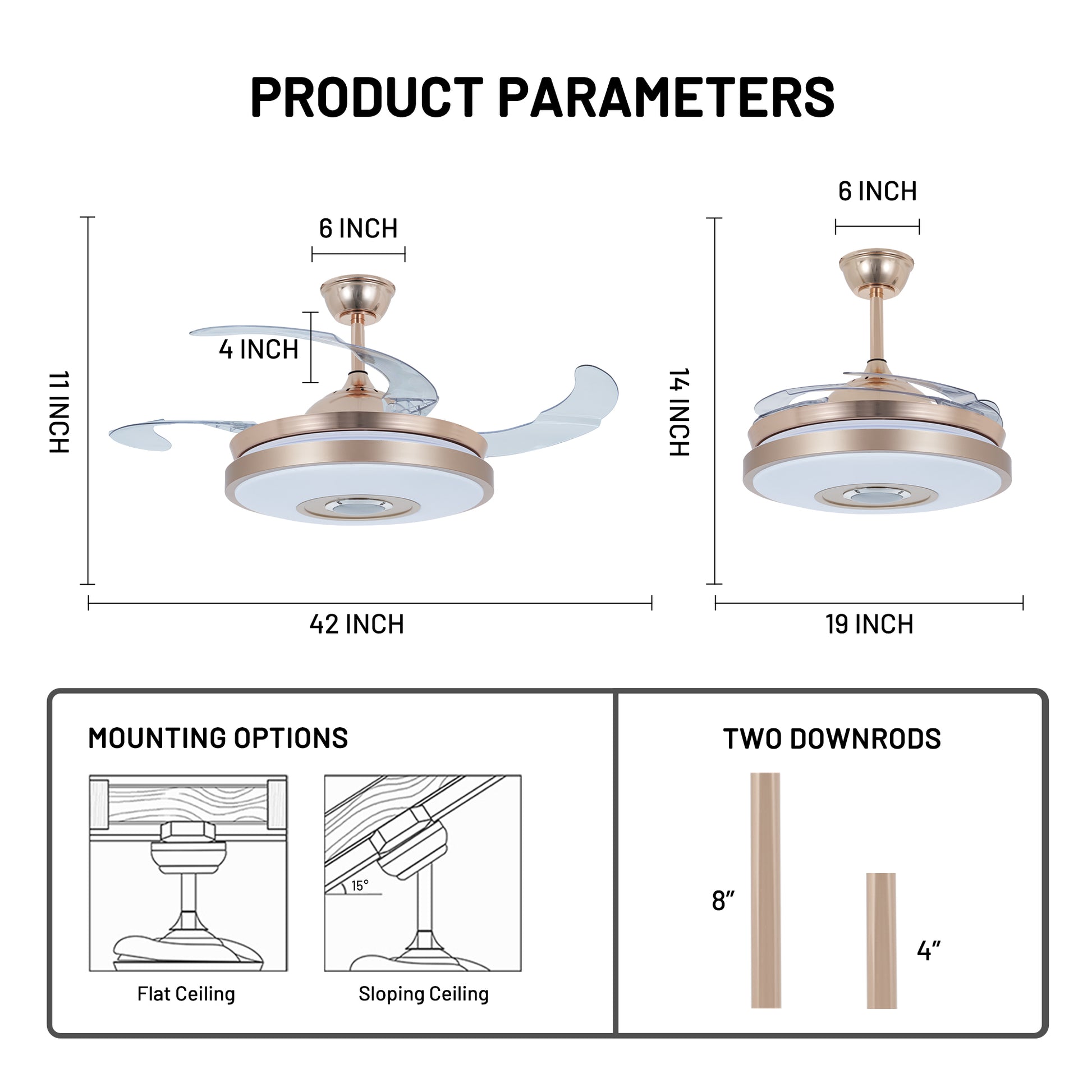 After installation, dimensions: 42" (diameter of fan blade after expansion) *15" (height) or so, the "two-dimensional code" on the Bluetooth installation manual in the mobile phone scan code package can download the APP, and the mobile phone can play music and control the light