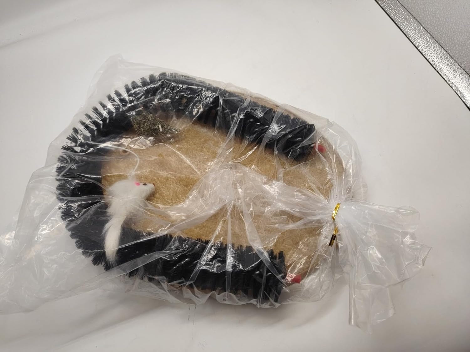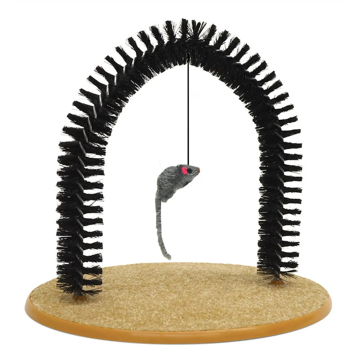 Cats can groom, scratch and play with this self-serve, well-deserved Playtime cat arch. Each time kitty passes under the cat grooming arch, its soft bristles help loosen shedding hair, keeping coat sleek and shiny. The soft, carpeted base provides “authorized” space to satisfy scratching needs, keeping claws conditioned while helping redirect cat from off-limit surfaces like furniture. Hanging toy mouse provides bat-and-swat play, and a secret compartment lets you add a little catnip to keep her coming back. Cat groomer measures 14" long x 11" wide x 13" high. Easy assembly.Features