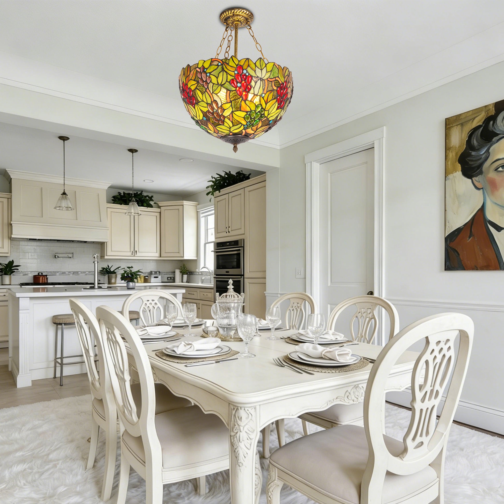 Elevate the visual appeal of your home with this stained glass chandelier, where vivid grape & leaf patterns meet artistic hand-spliced craftsmanship—turning a functional light fixture into a eye-catching decor piece.