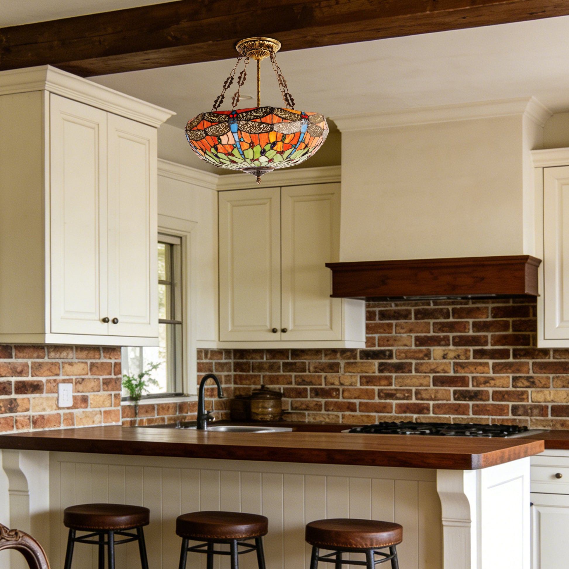 Vintage Antique Bronze Hardware: The fixture is suspended by ornate metal chains and a decorative ceiling plate, finished in a rich antique bronze that complements the stained glass perfectly. The semi-flush mount design allows for adjustable height, making it suitable for rooms with standard or low ceilings.