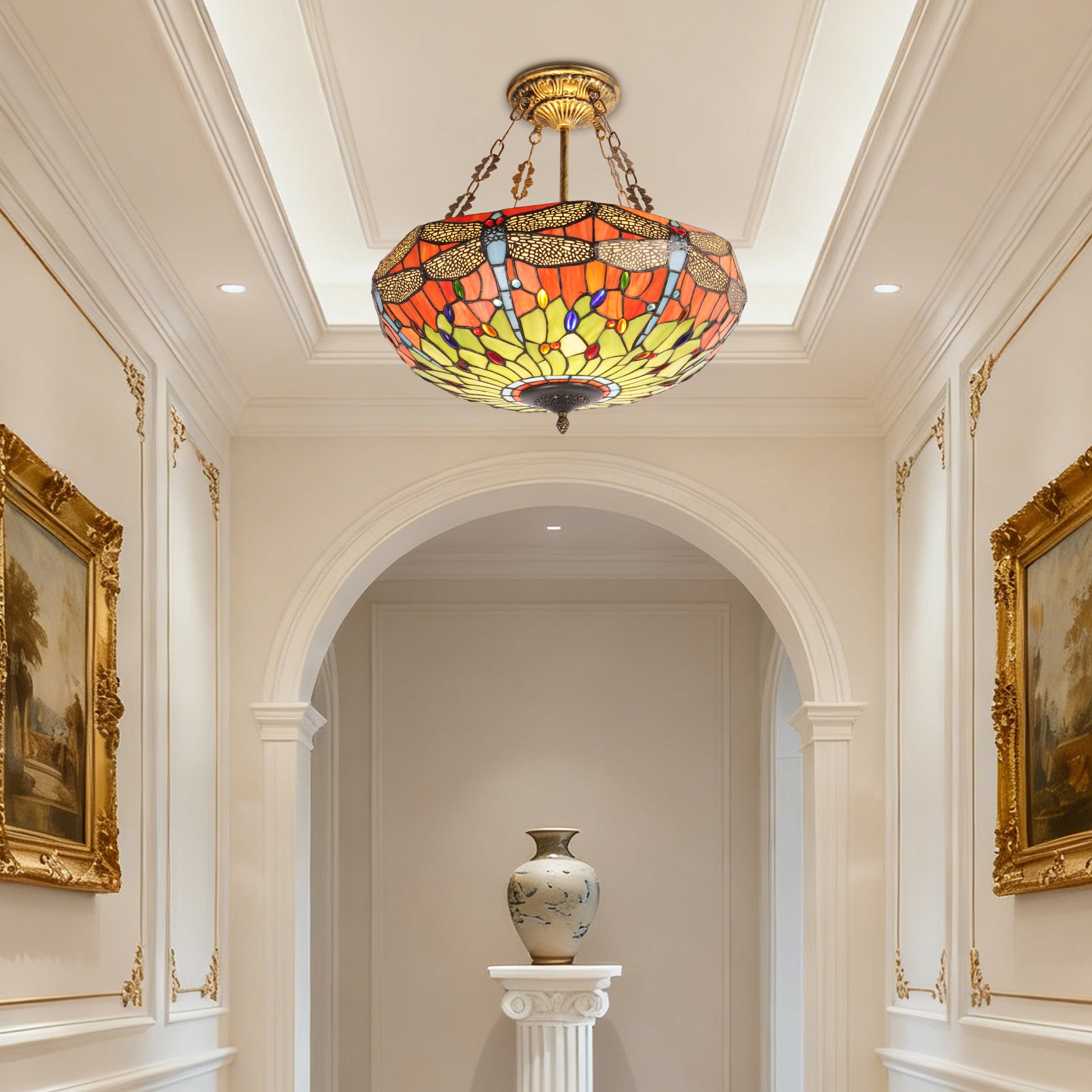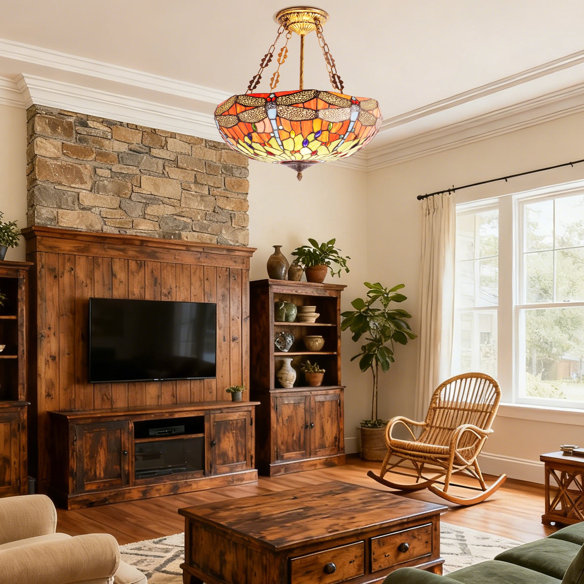 Elevate your home with the timeless artistry of our Style Dragonfly Stained Glass Pendant Light. This striking fixture features a handcrafted stained glass shade, adorned with intricate dragonfly motifs in vibrant hues of orange, blue, and green, framed by an antique bronze metal frame and chains, creating a luminous focal point that evokes the iconic craftsmanship of glasswork.