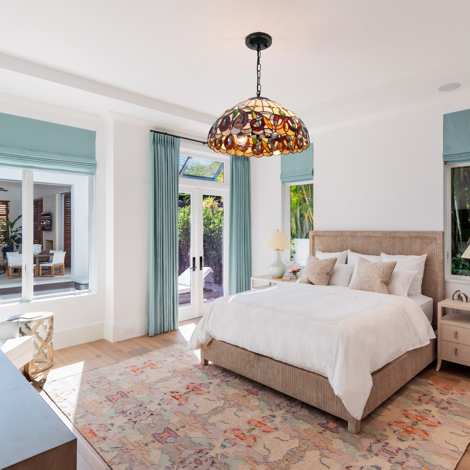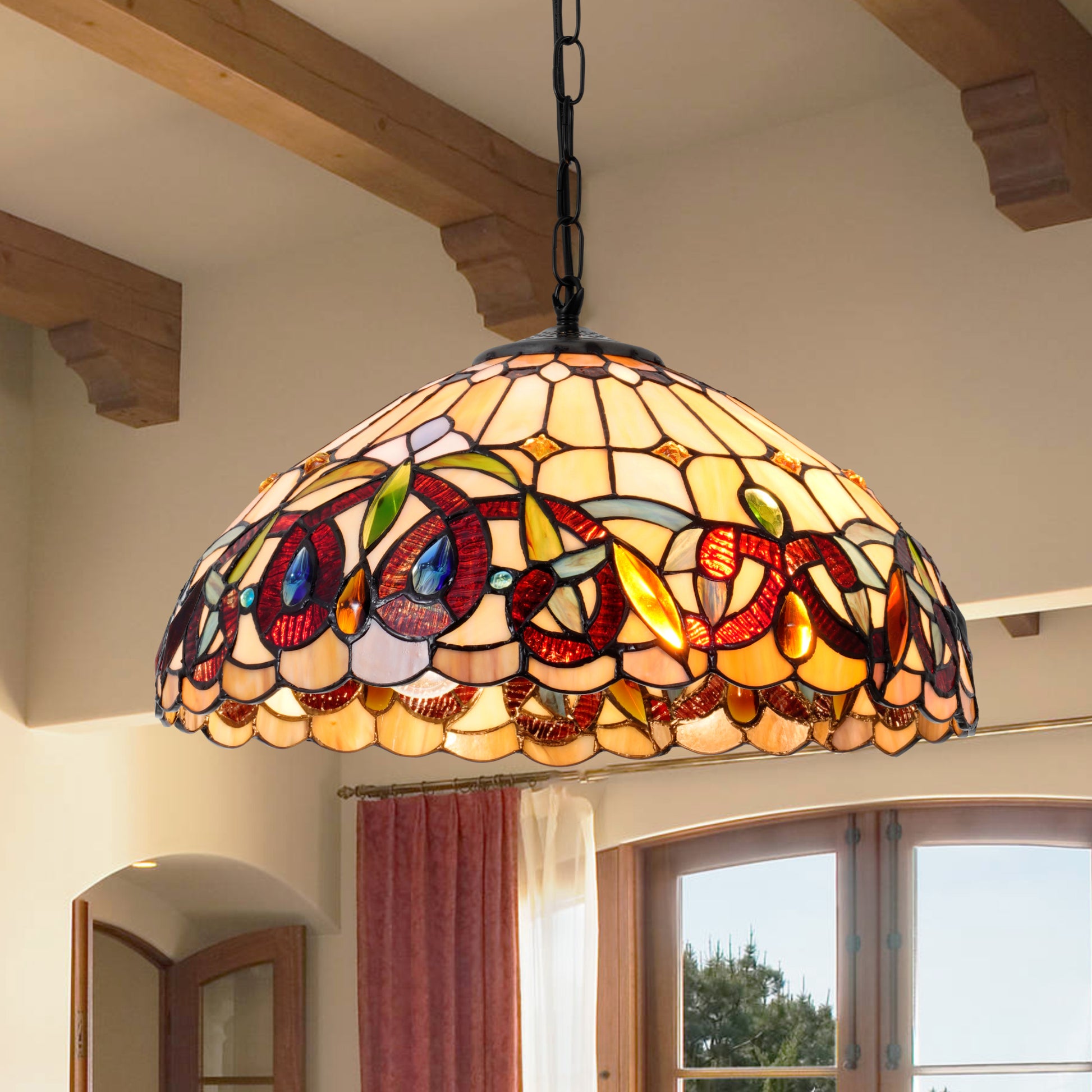 This exquisite Tiffany-style pendant light fixture, features a hand-crafted, multi-colored stained glass shade that creates a warm, inviting ambiance in any room. The black metal canopy, accents, and ornamental chains lend a touch of rustic elegance to the overall Victorian-inspired aesthetic.