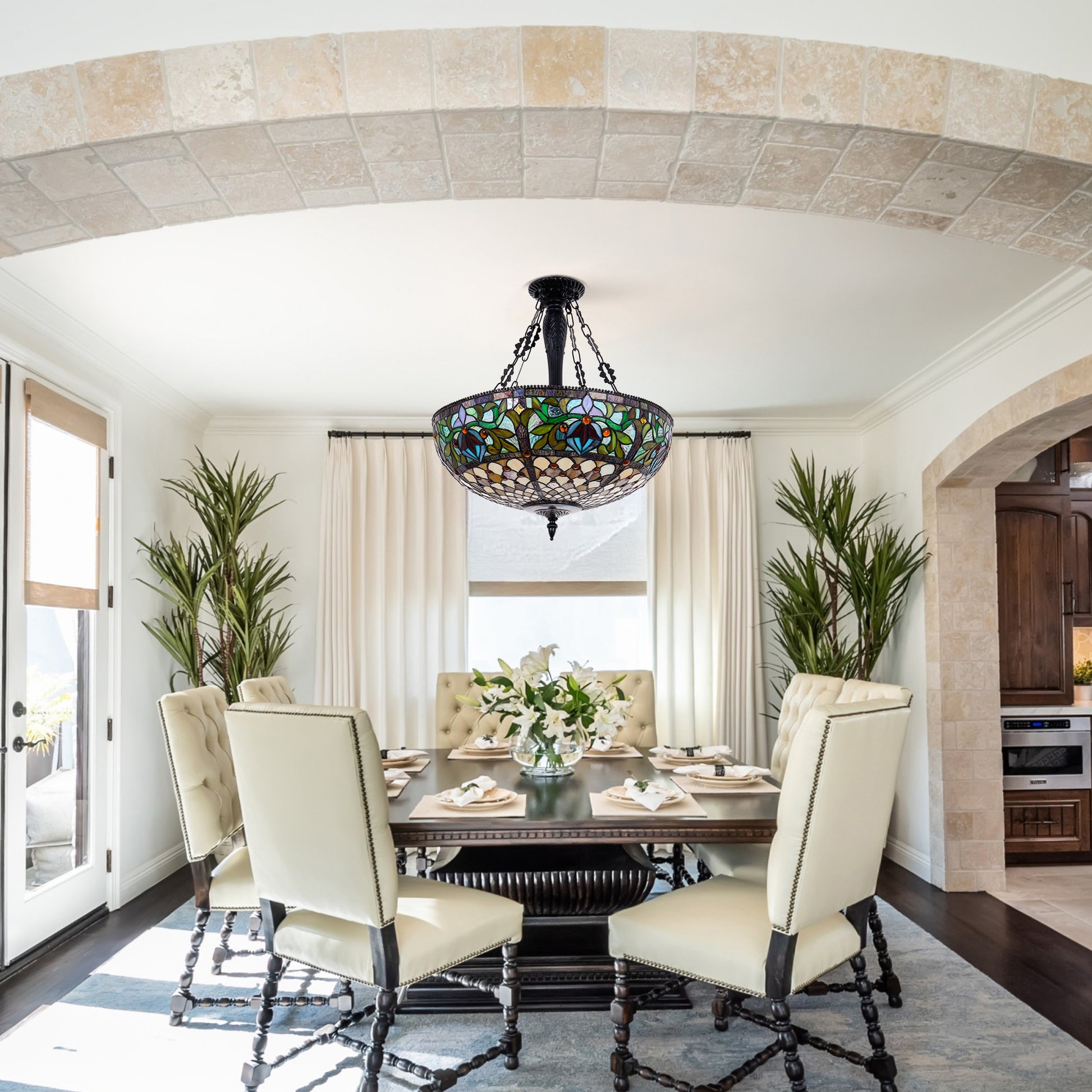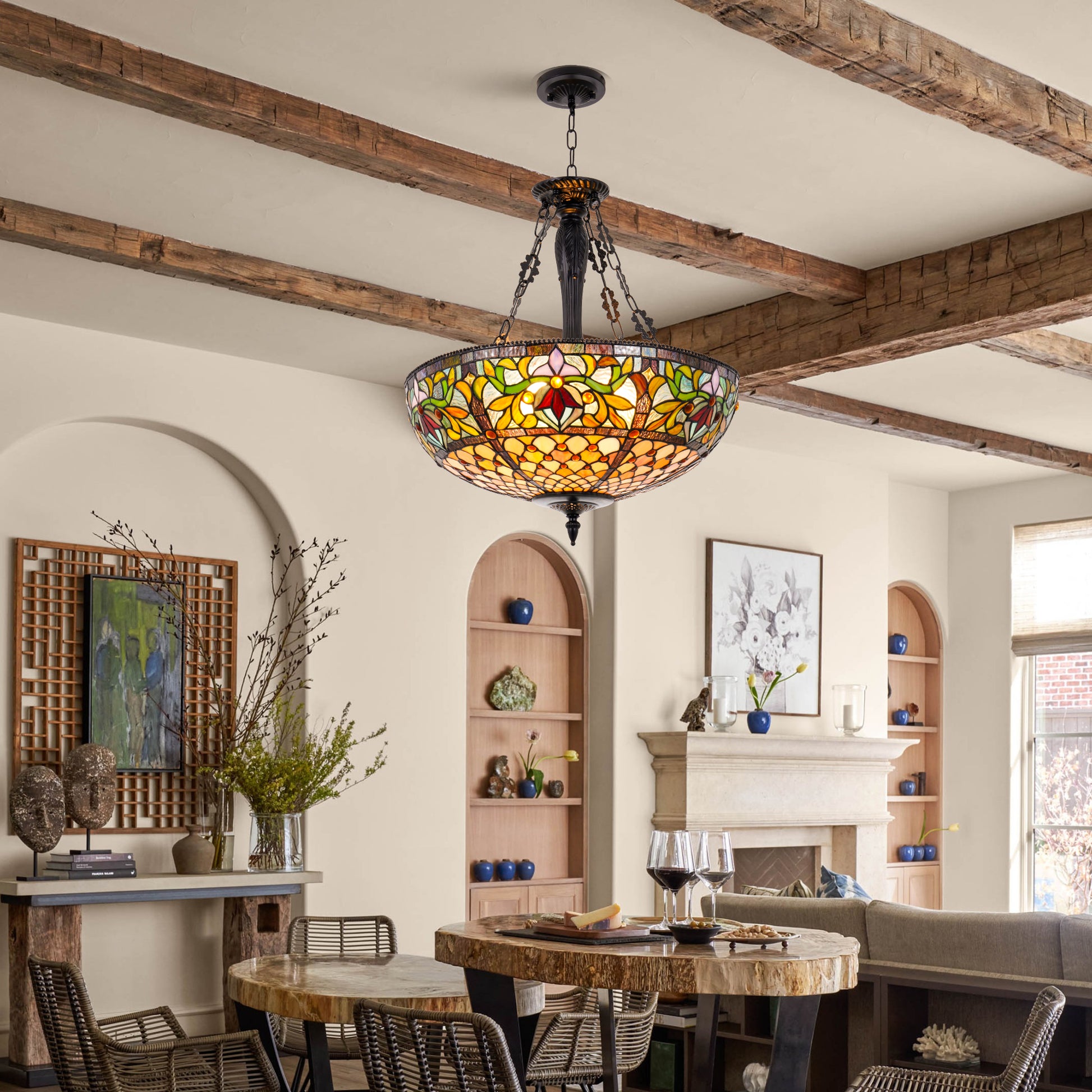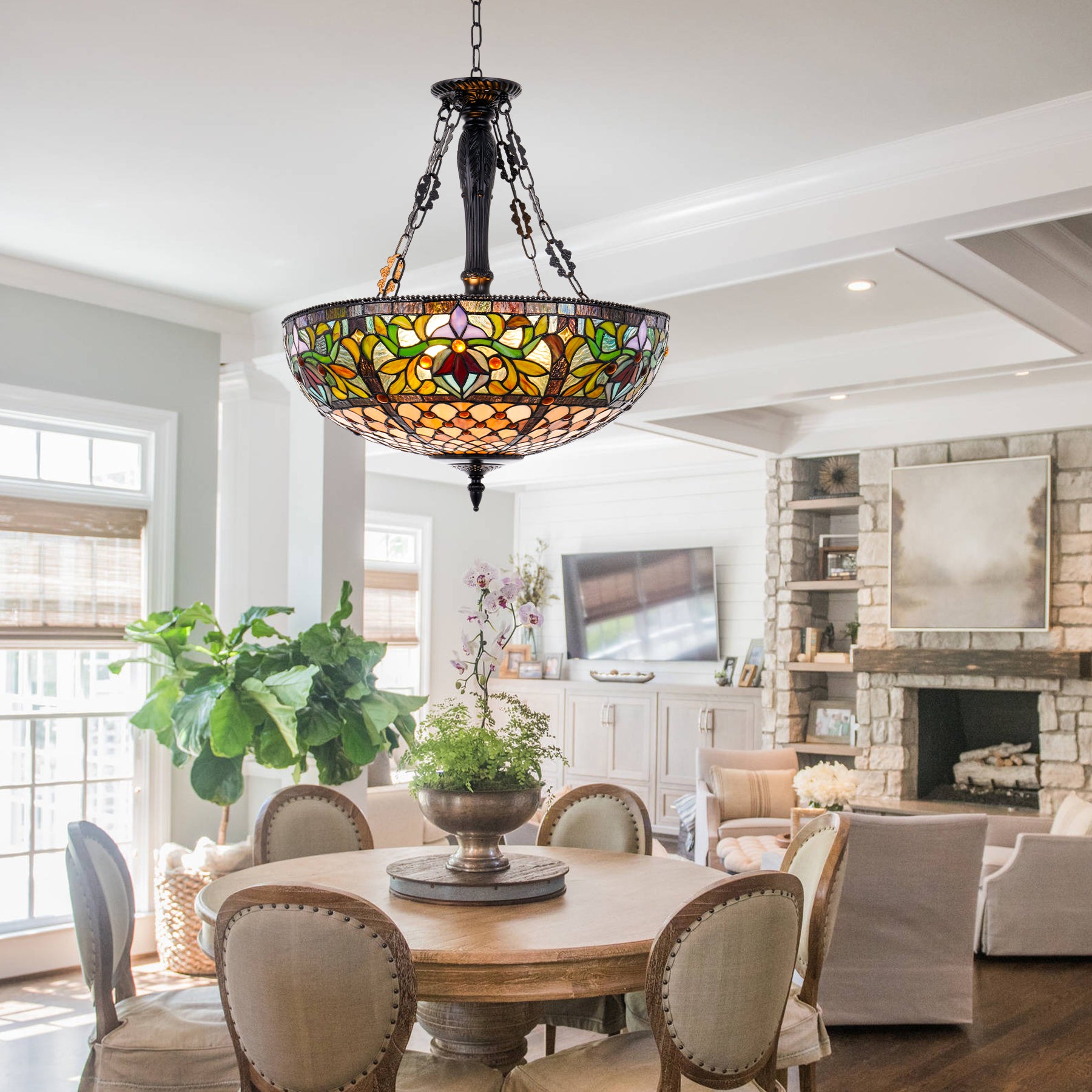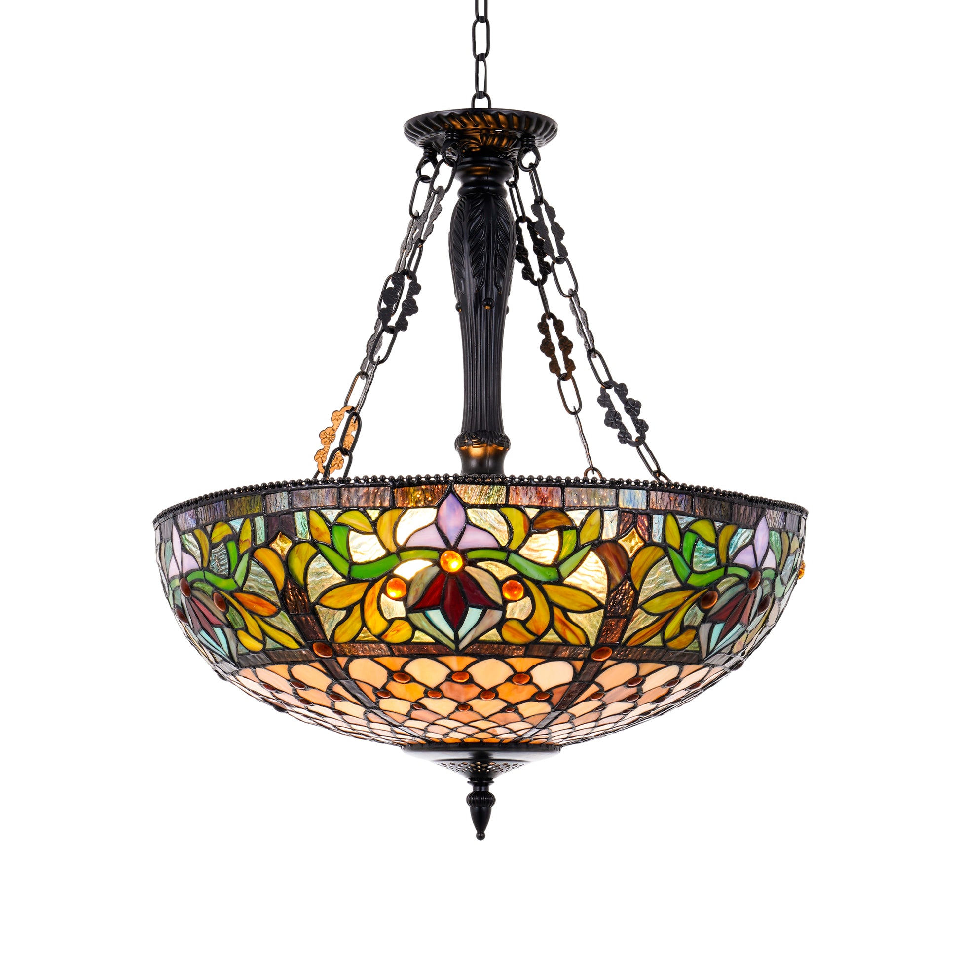 This exquisite Japanese pastoral style pendant light fixture, features a hand-crafted, multi-colored stained glass shade that creates a warm, inviting ambiance in any room. The black metal canopy, accents, and ornamental chains lend a touch of rustic elegance to the overall Victorian-inspired aesthetic.
