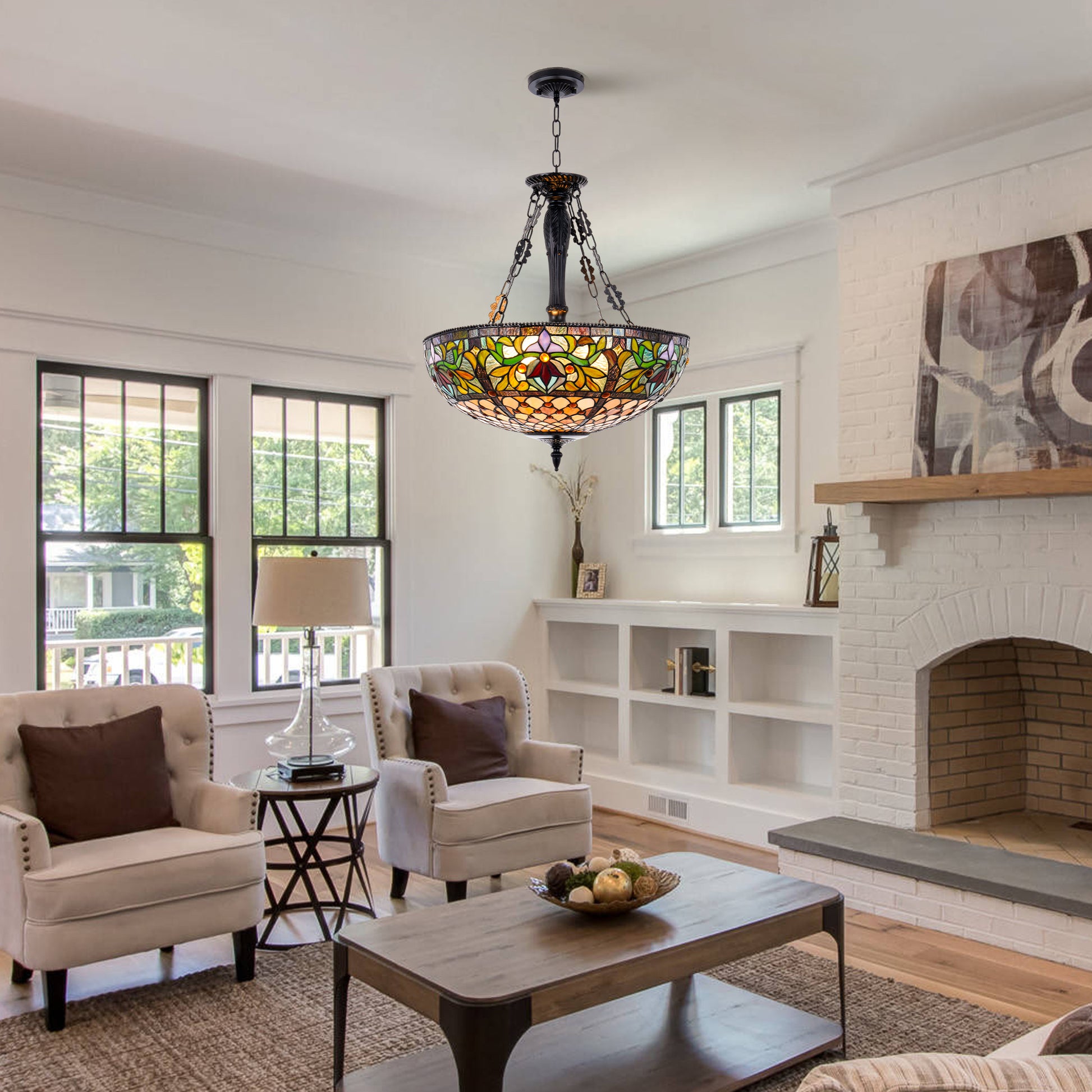 This Tiffany-style pendant accommodates standard E26 x5 base bulbs up to 60 watts. You can choose from LED, CFL, or incandescent bulbs to achieve your preferred lighting effect - the stained glass will beautifully diffuse the light, enhancing the vintage aesthetic.