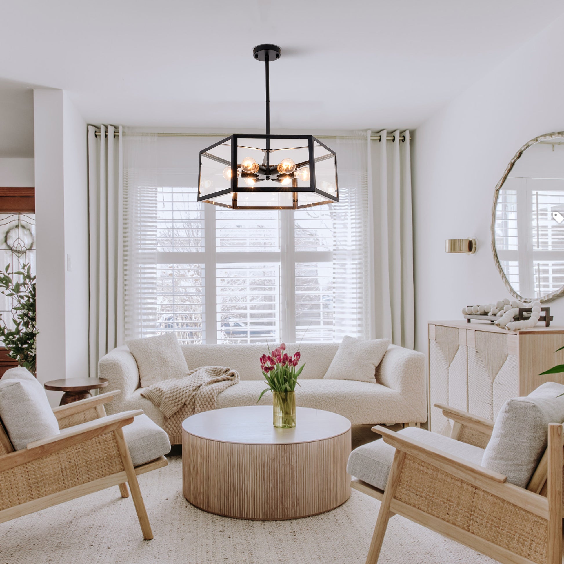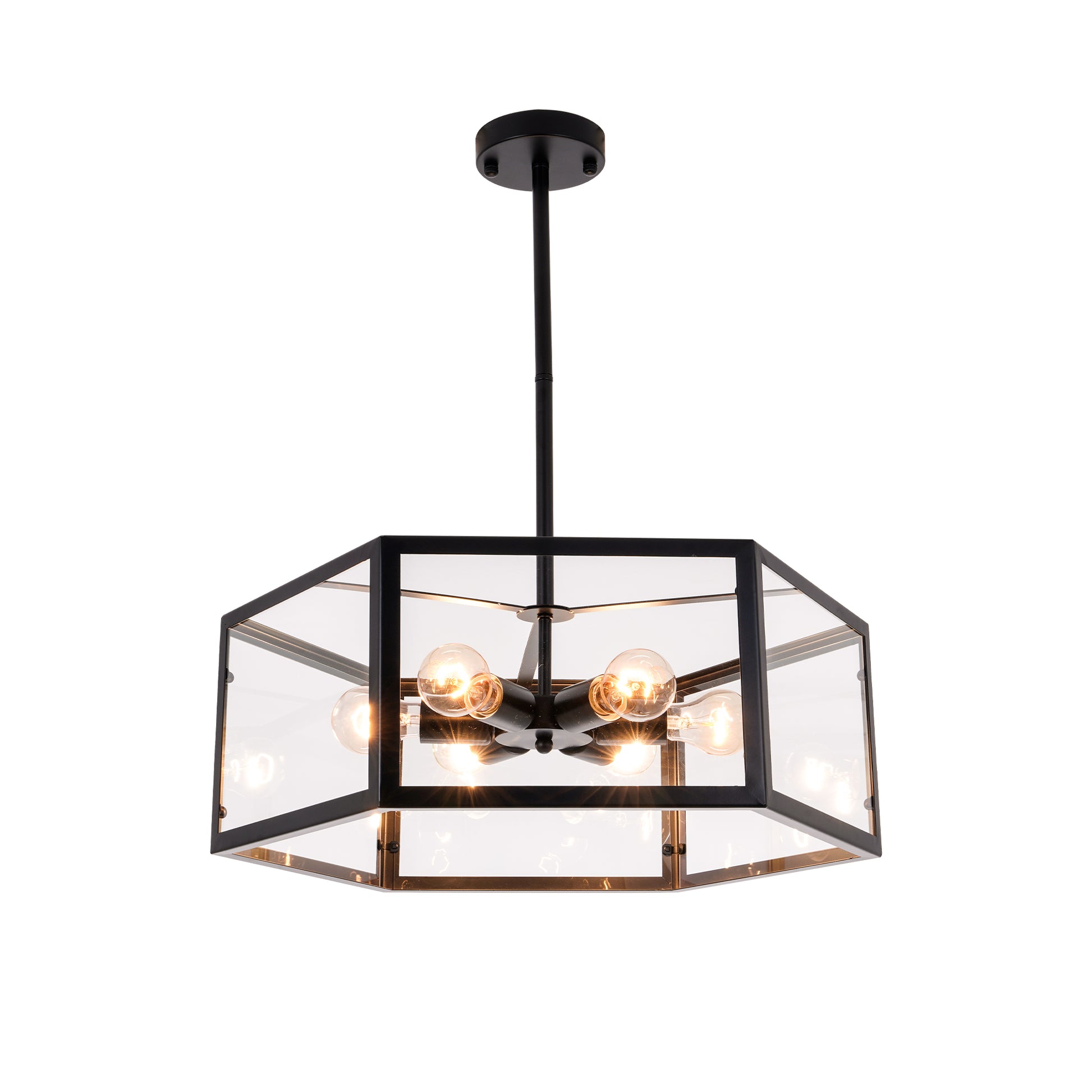 This pendant light features a simple geometric rhombic metal frame with a matte black finish, blending modern and traditional aesthetics to complement a variety of interior styles.