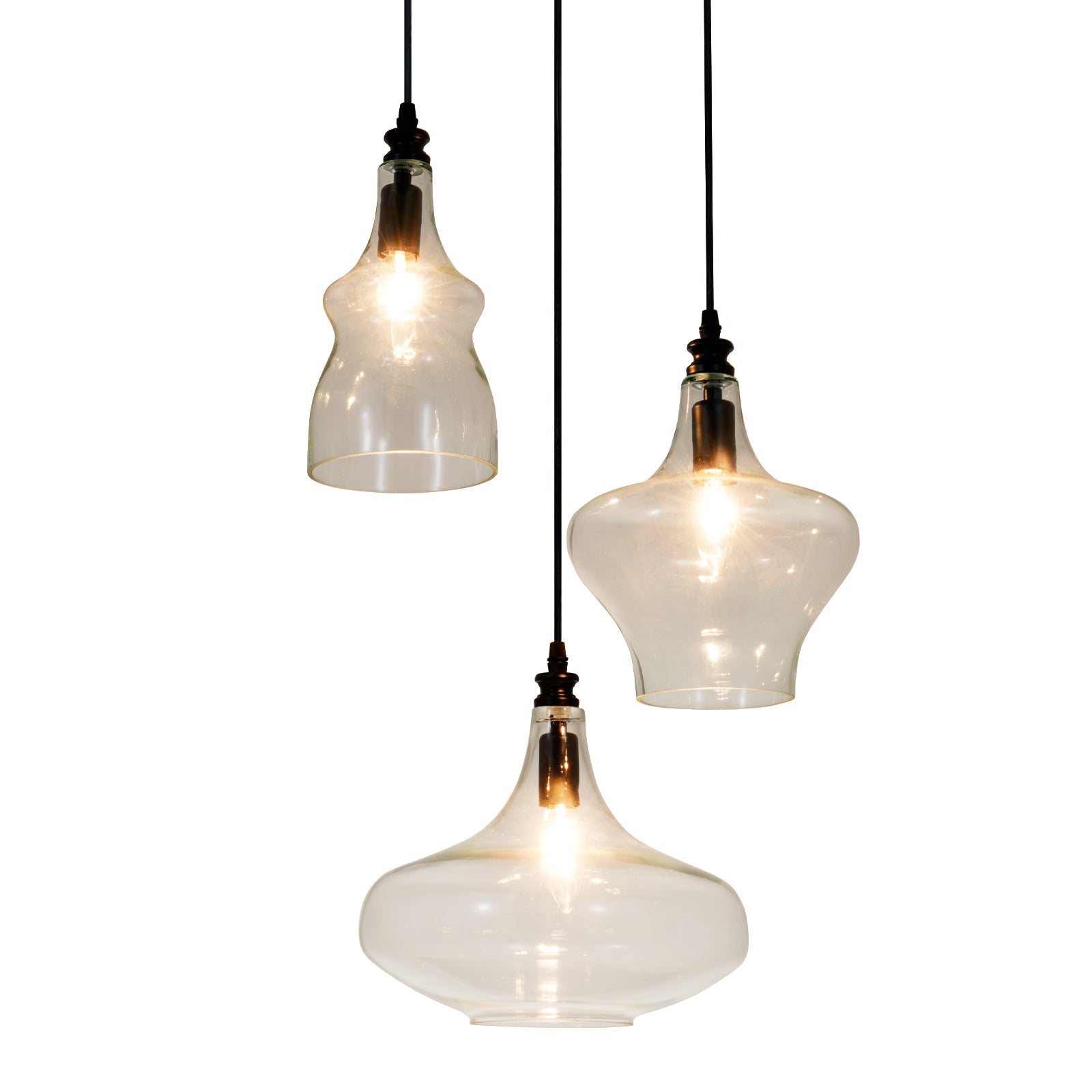 This glass globe cluster pendant light combines simple, elegant elements. Crafted from durable metal, it features 3 differently-sized hand-blown clear glass shades that create a timeless vintage touch when illuminated, while maintaining a modern, minimalist aesthetic.