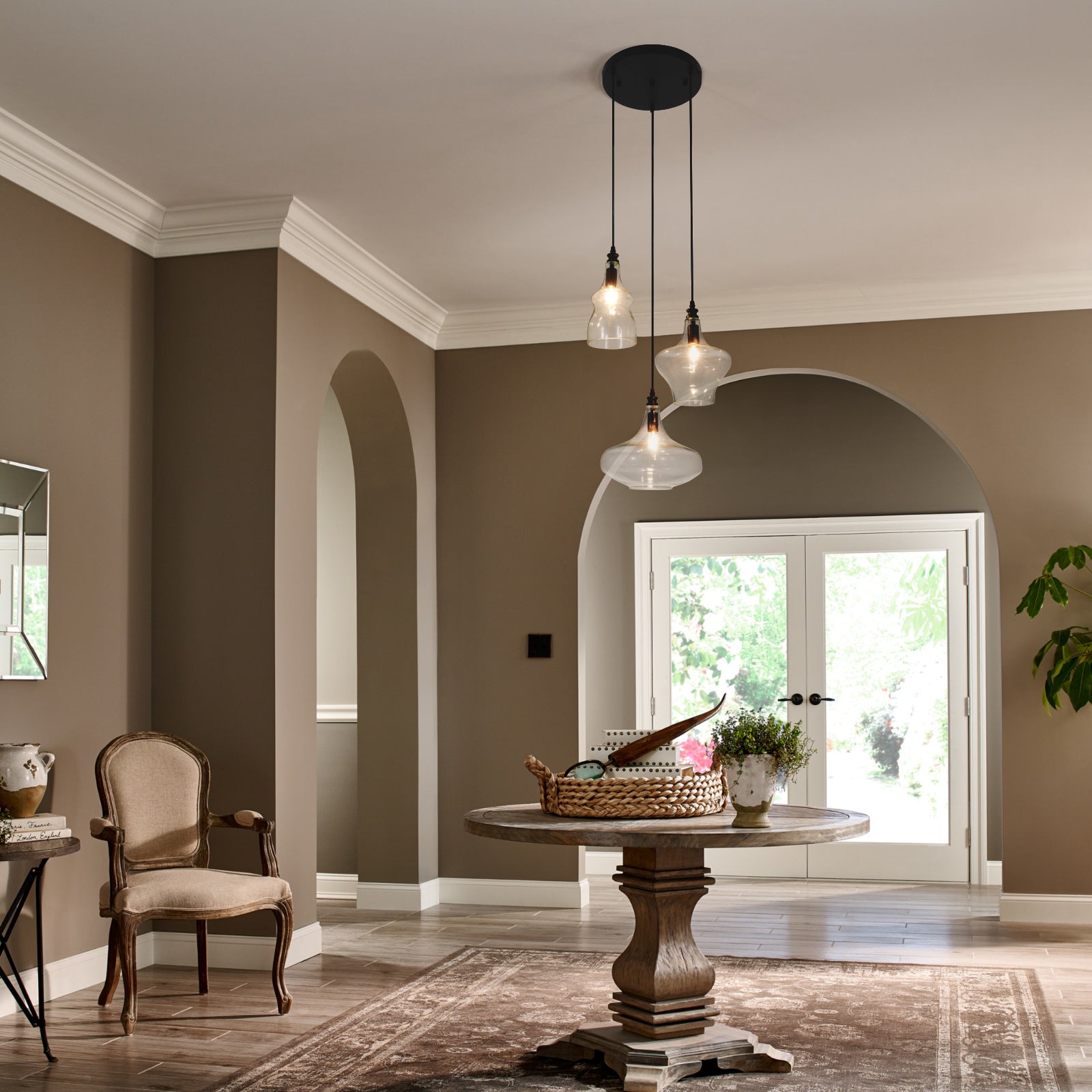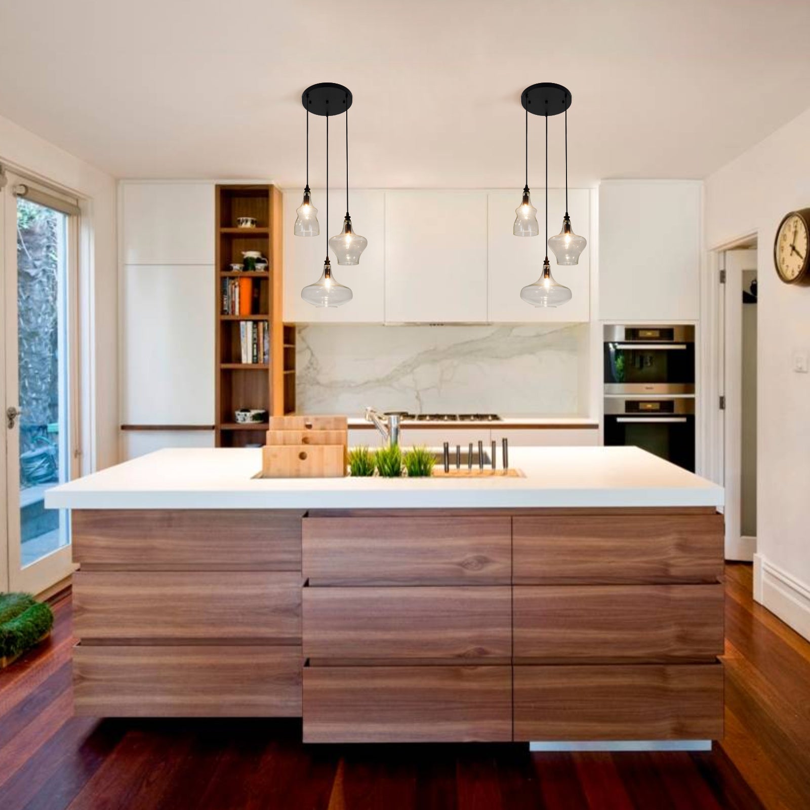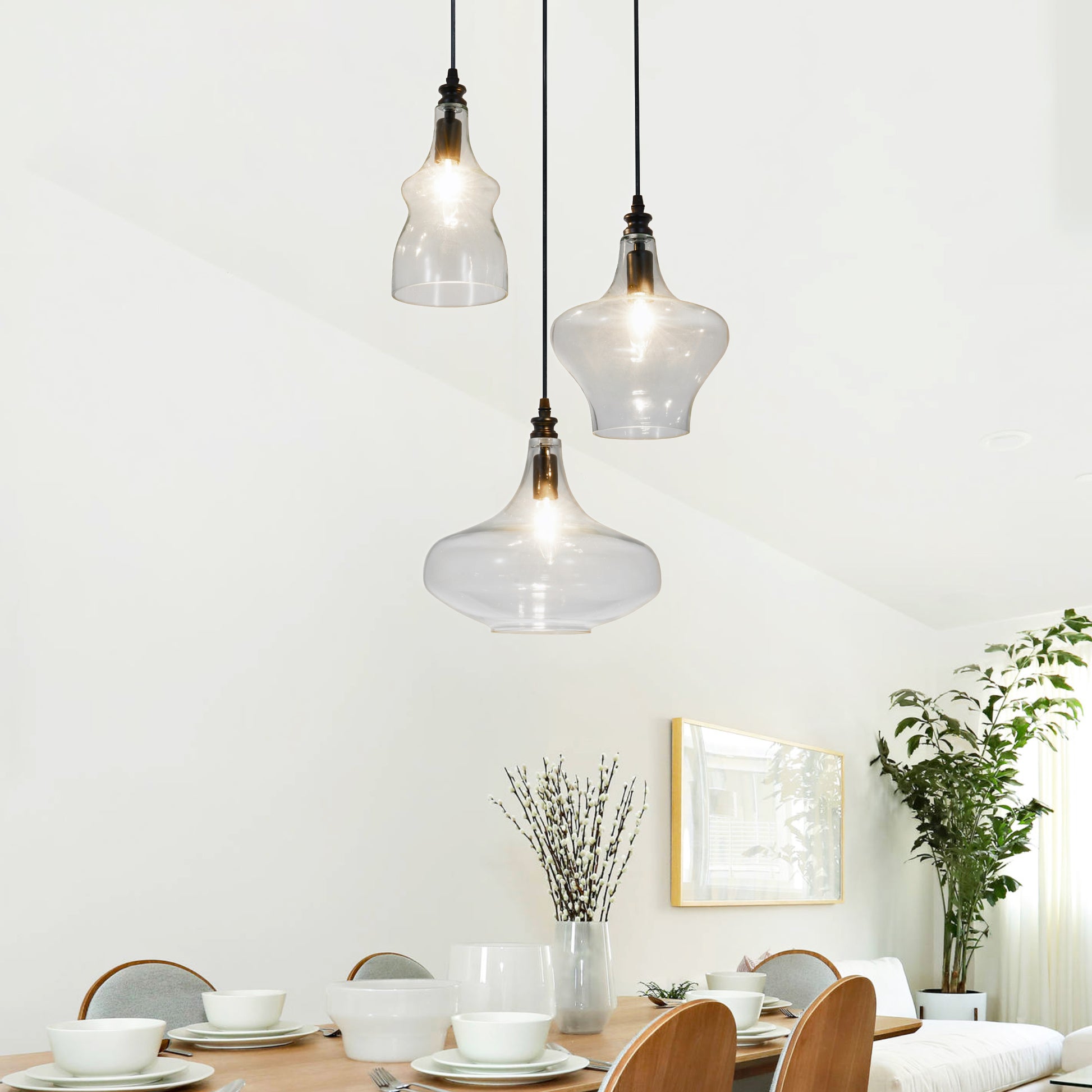 This glass pendant light is compatible with E26 base bulbs (3 bulbs required, not included). It works with incandescent, LED, energy-saving, and halogen bulbs up to 60W. If using dimmable bulbs, you can create different ambiances by adjusting a wall dimmer switch.