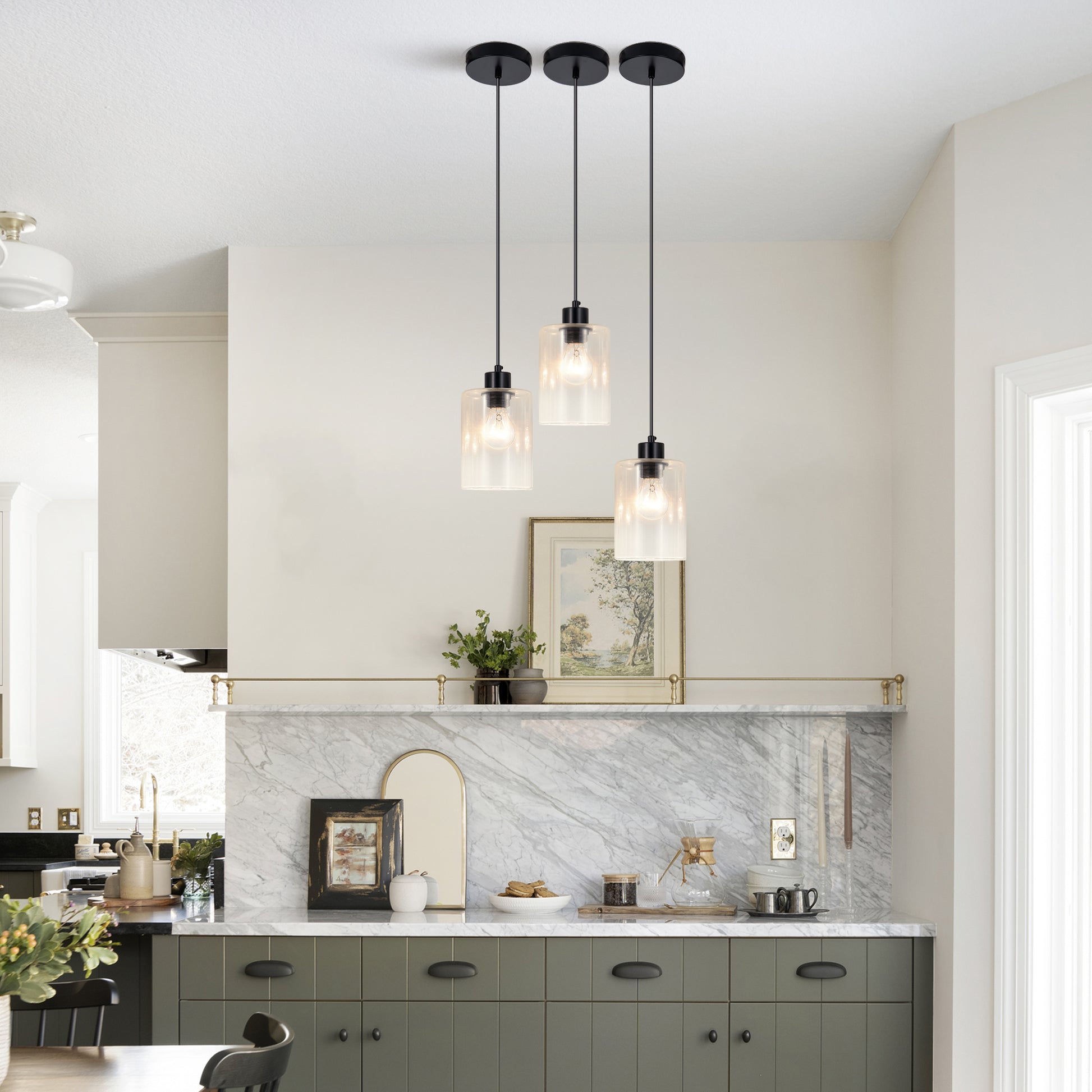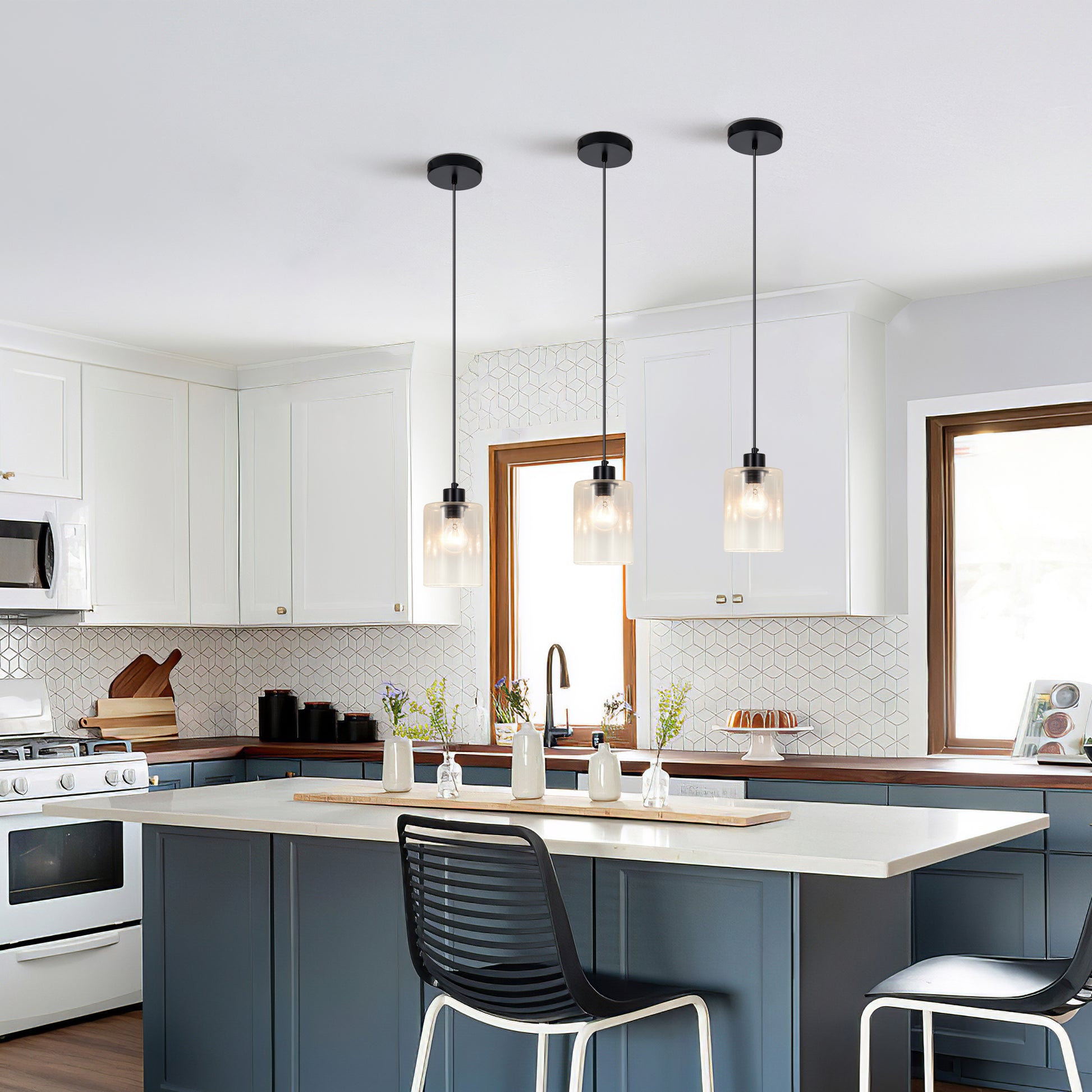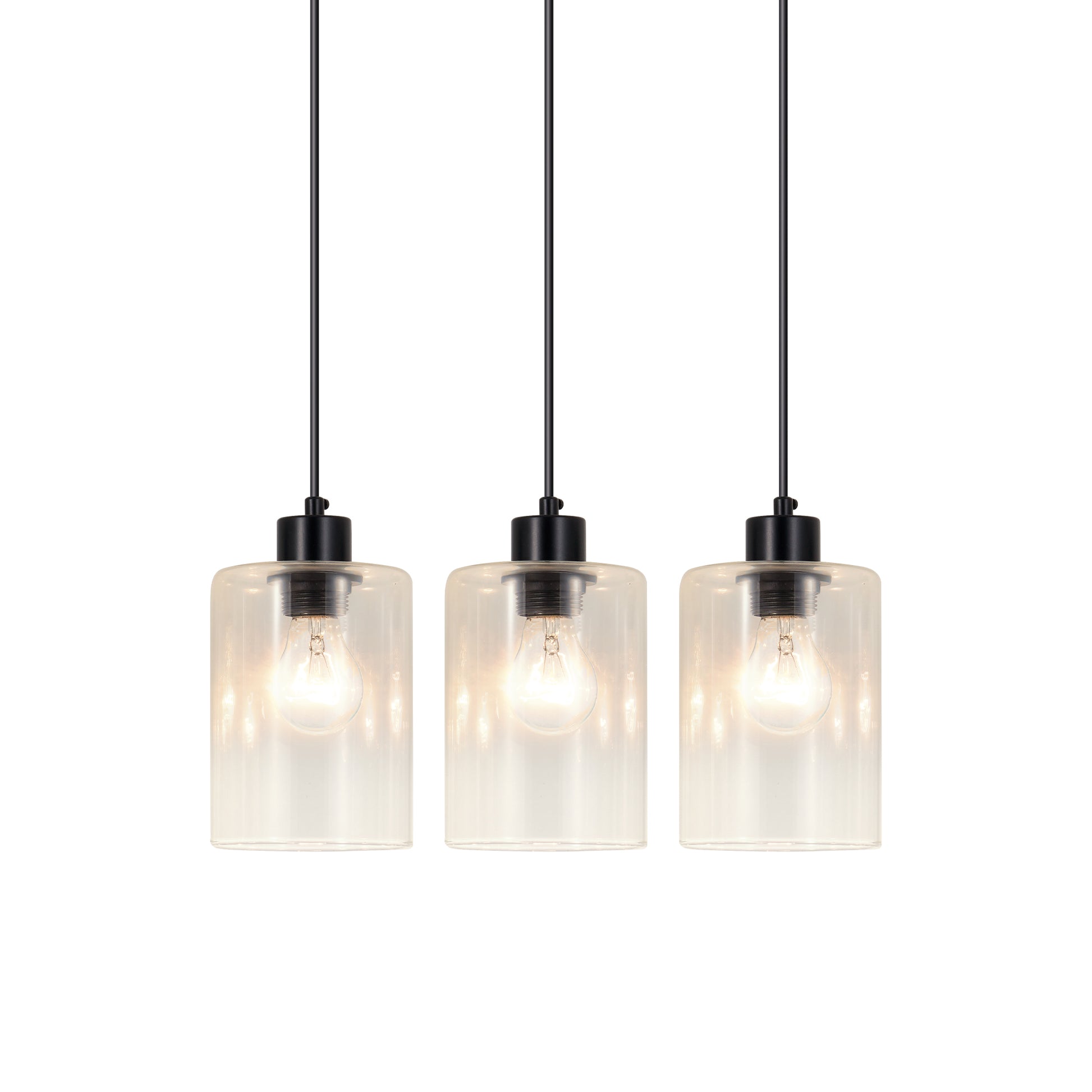 The modern black pendant light fixtures feature 3 simple clear glass lampshades under the matte black canopy, combining contemporary and vintage style to perfectly complement any home decor.When lit, the 3-light glass pendant lighting creates a charming, warm ambiance.