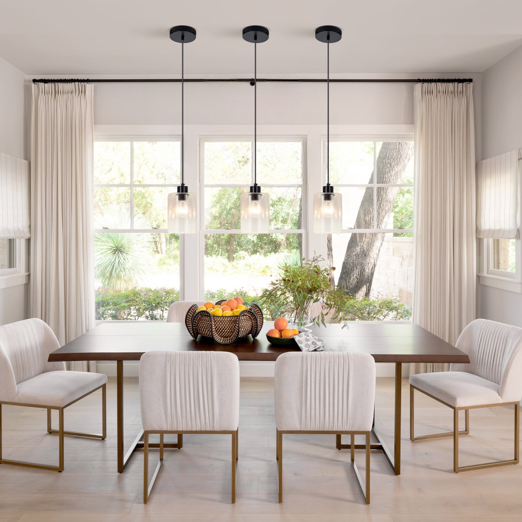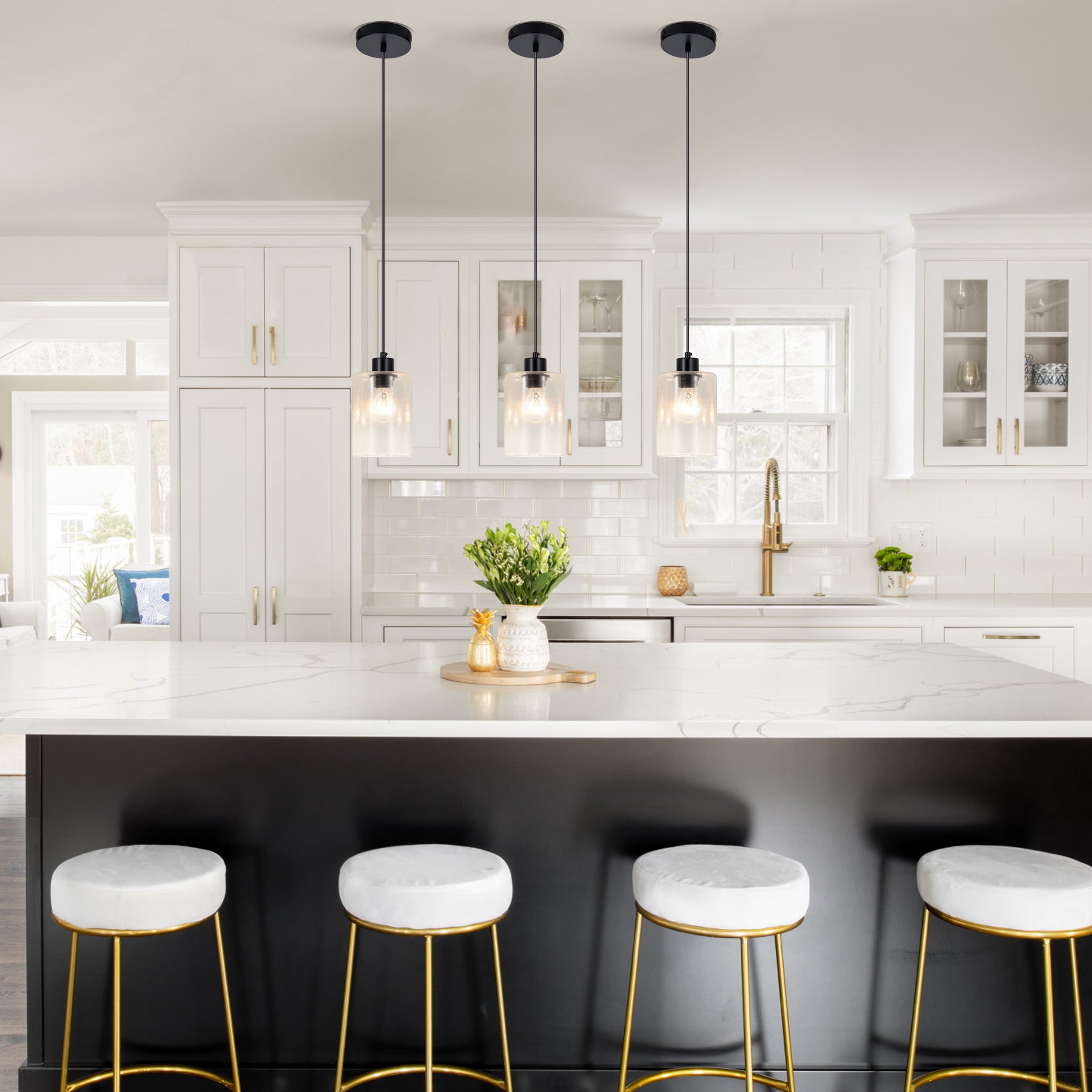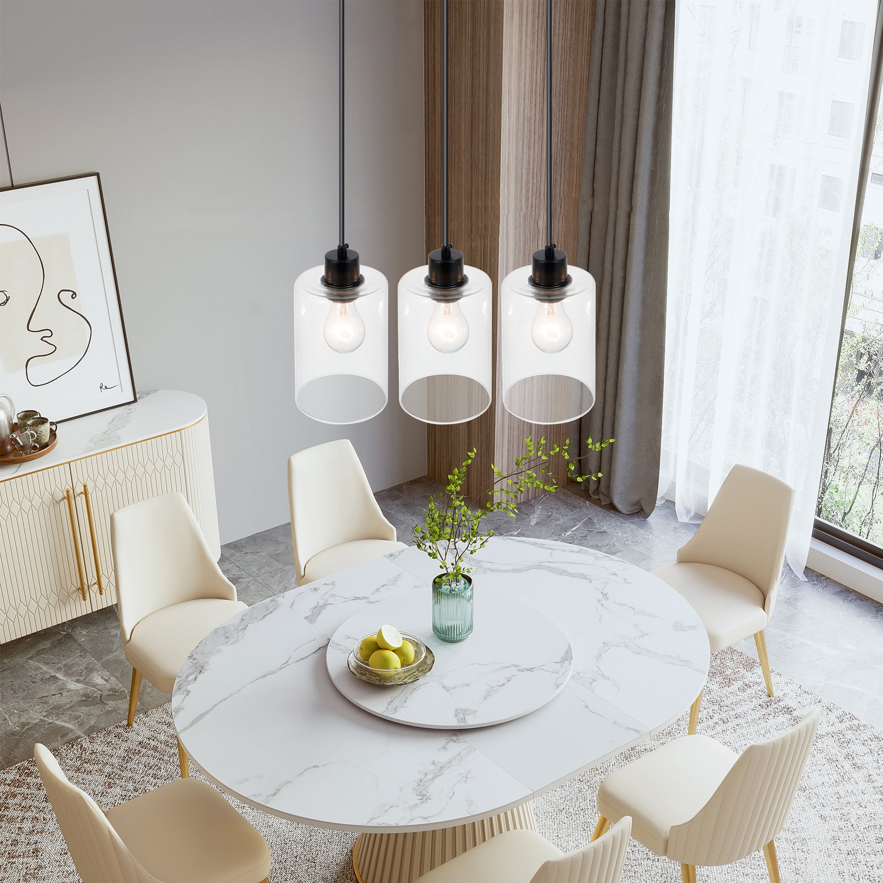 The modern black pendant light fixtures feature 3 simple clear glass lampshades under the matte black canopy, combining contemporary and vintage style to perfectly complement any home decor.When lit, the 3-light glass pendant lighting creates a charming, warm ambiance.