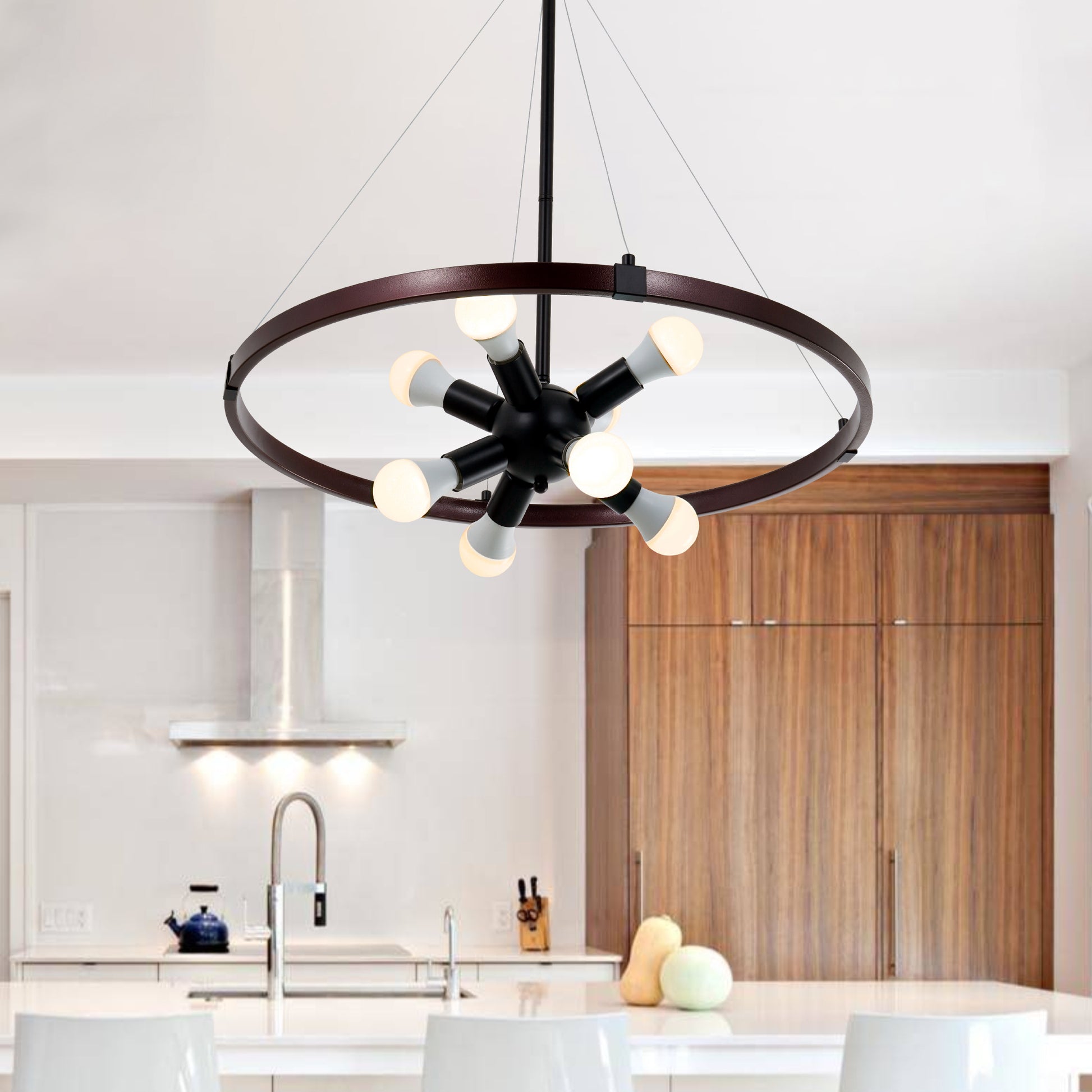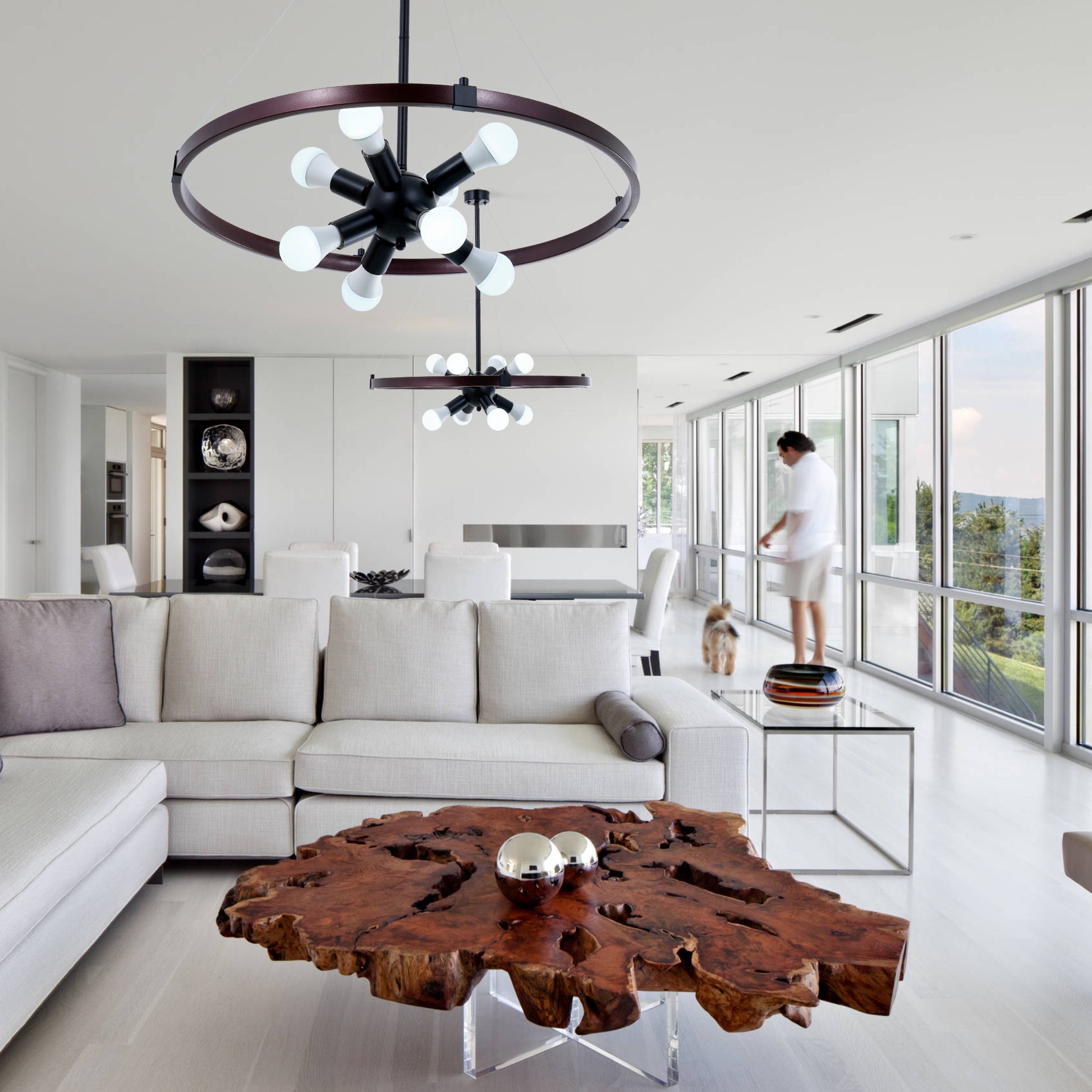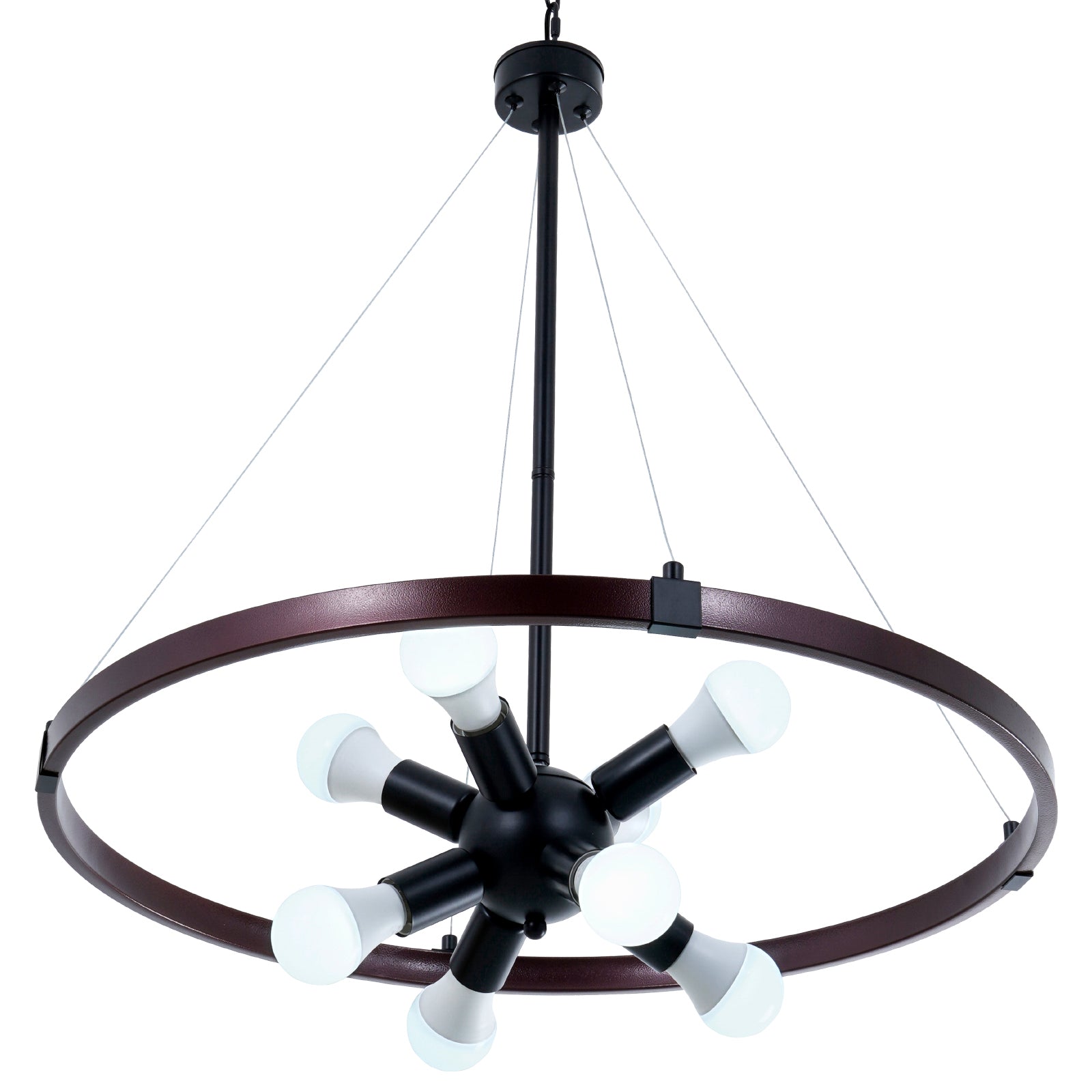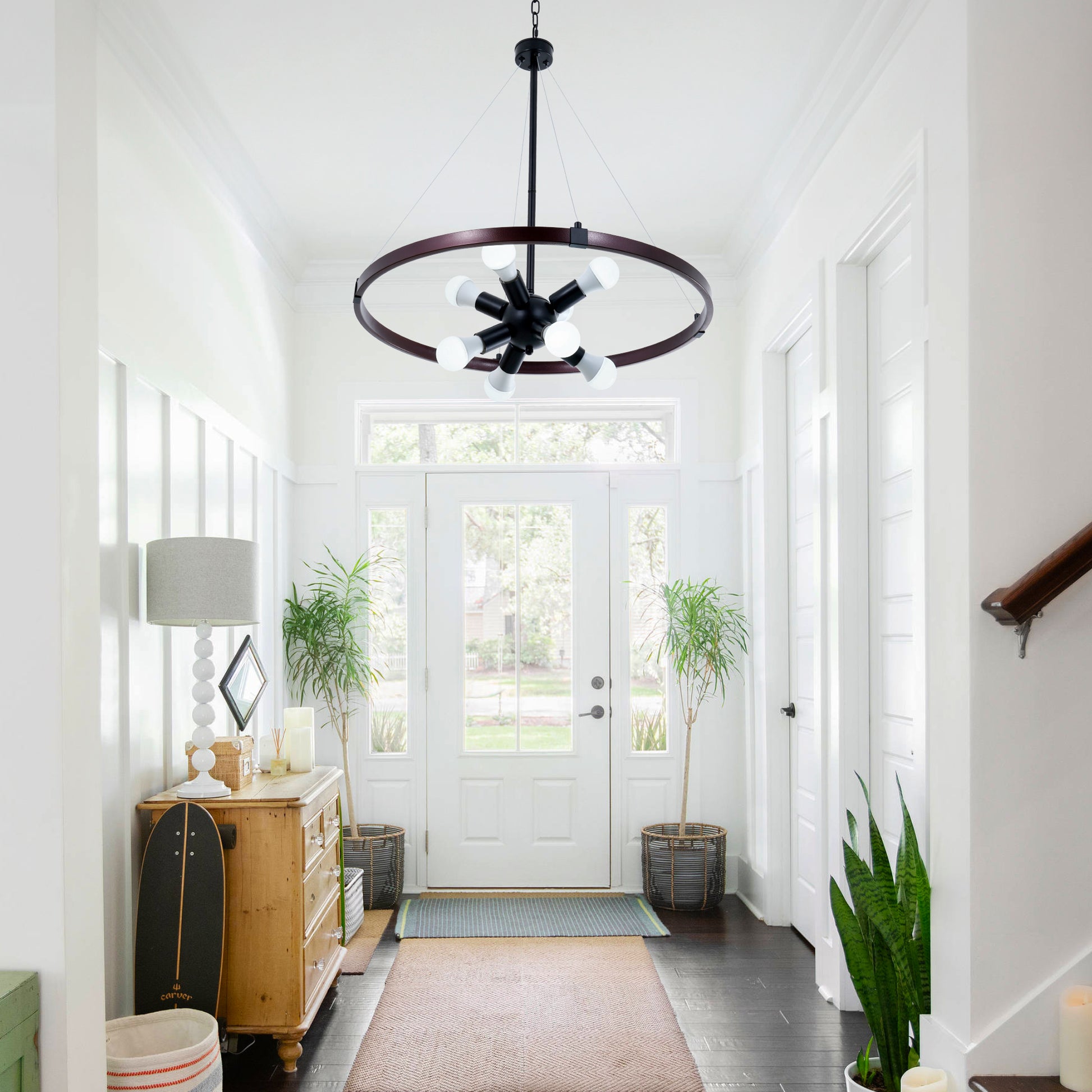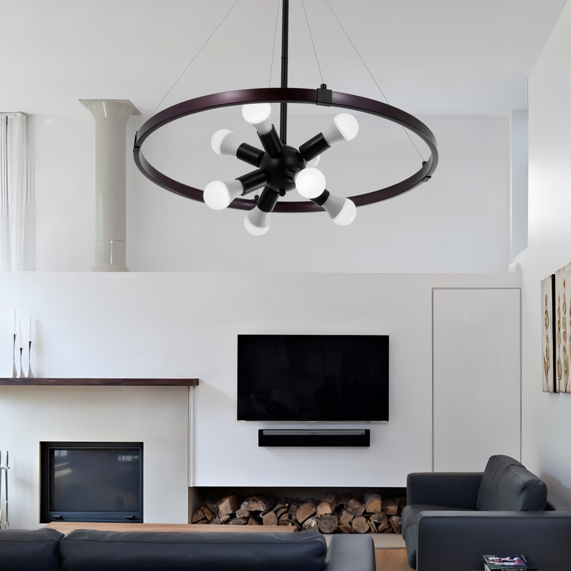 The round 8-head chandelier features a matte black, round frame inspired by wagon wheels and transparent glass shades, embodying a rustic farmhouse style. Ideal for dining rooms, kitchens, living rooms, bedrooms, foyers, and porches.
