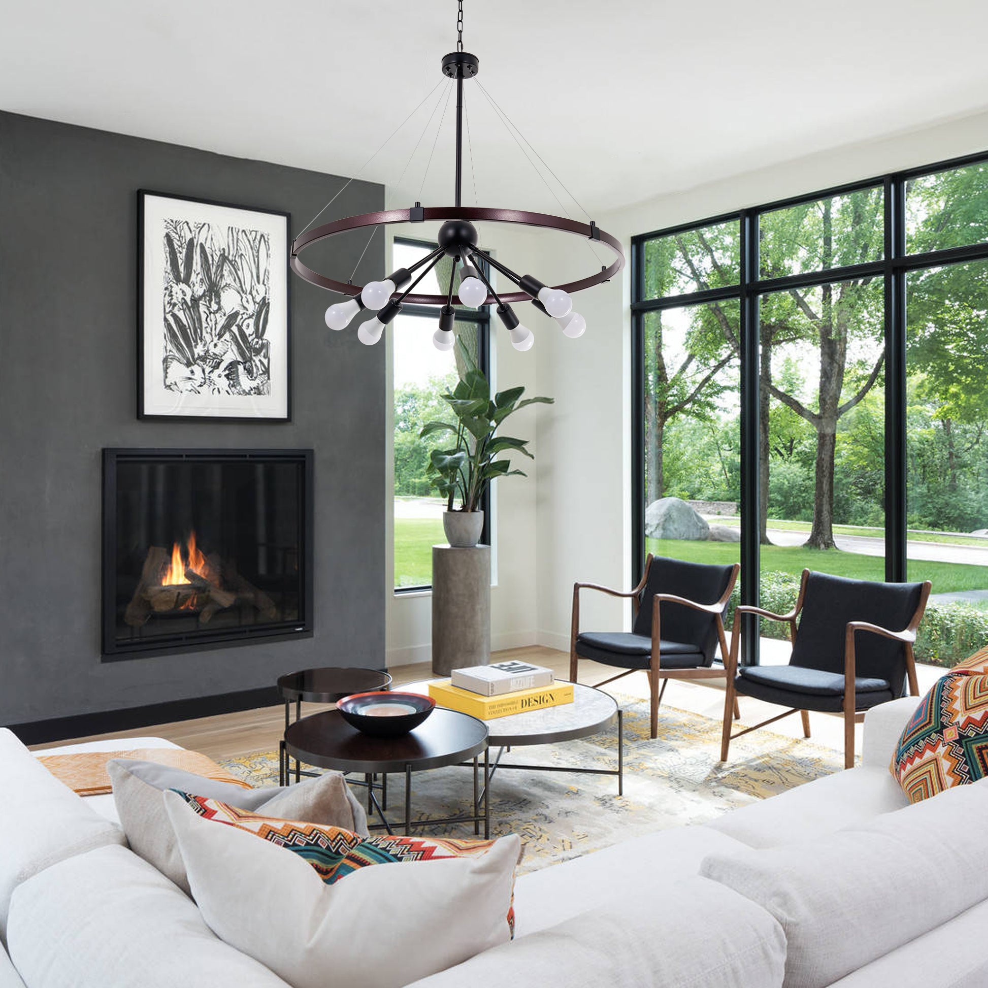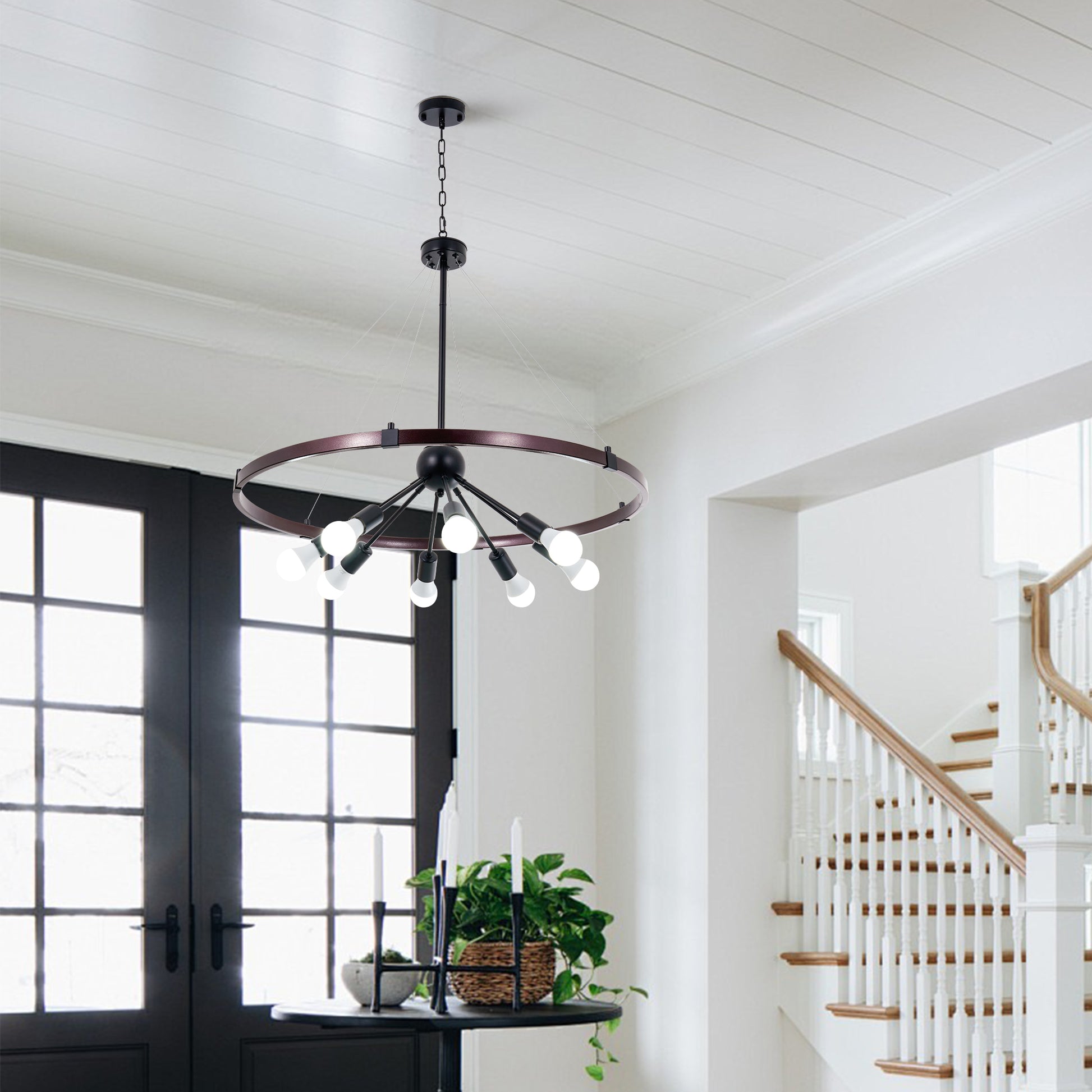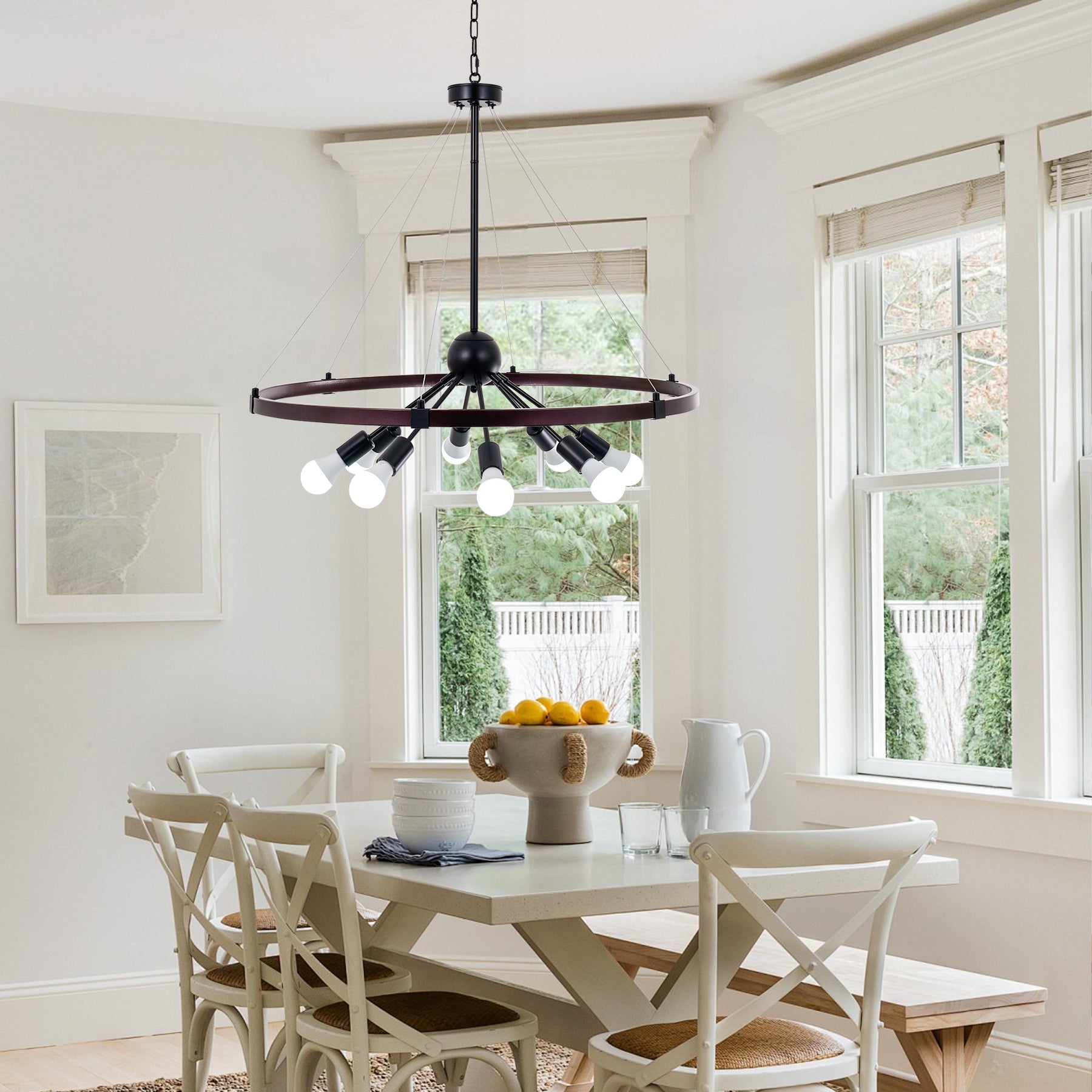 The round 8-head rust-colored chandelier features a matte black, round frame inspired by wagon wheels and transparent glass shades, embodying a rustic farmhouse style. Ideal for dining rooms, kitchens, living rooms, bedrooms, foyers, and porches.