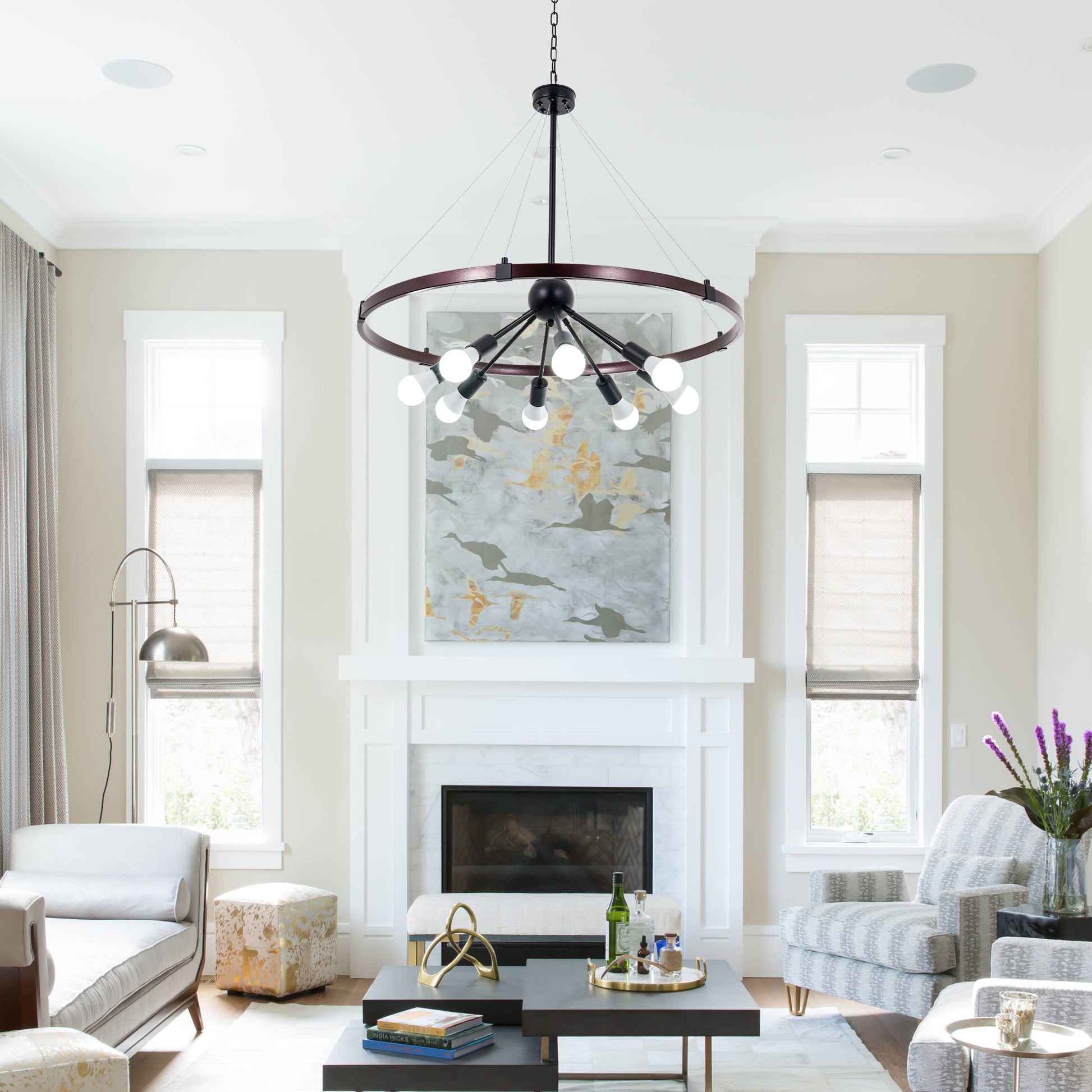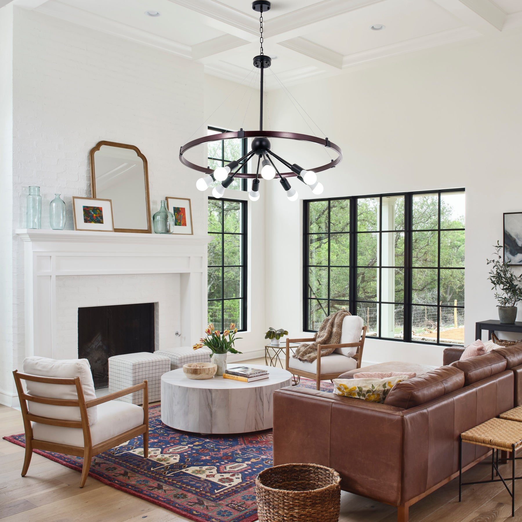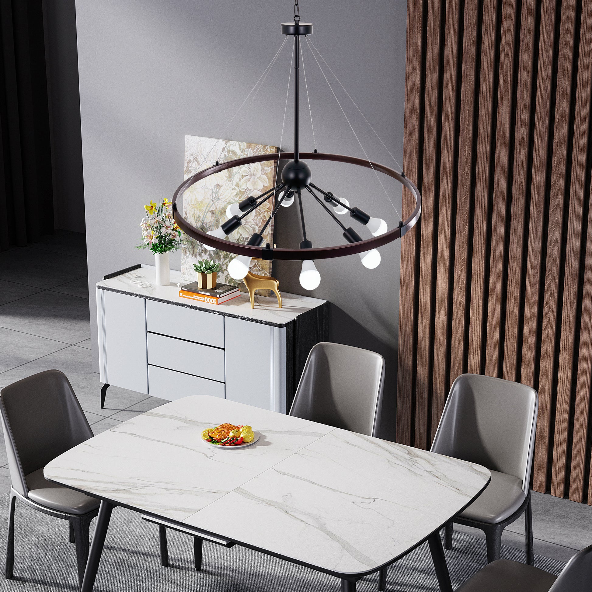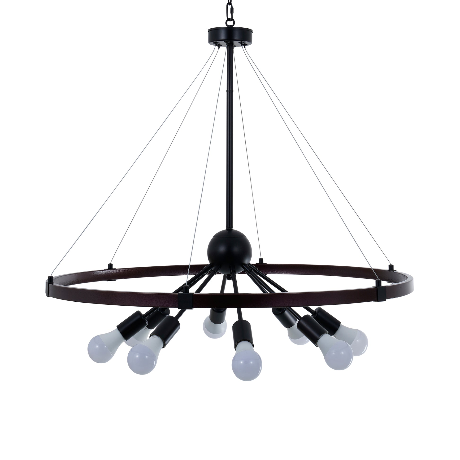 The round 8-head rust-colored chandelier features a matte black, round frame inspired by wagon wheels and transparent glass shades, embodying a rustic farmhouse style. Ideal for dining rooms, kitchens, living rooms, bedrooms, foyers, and porches.