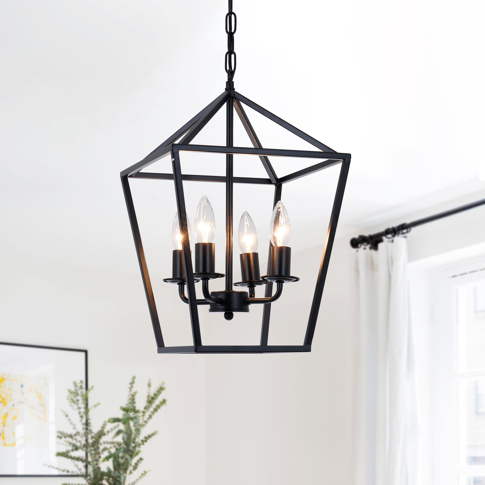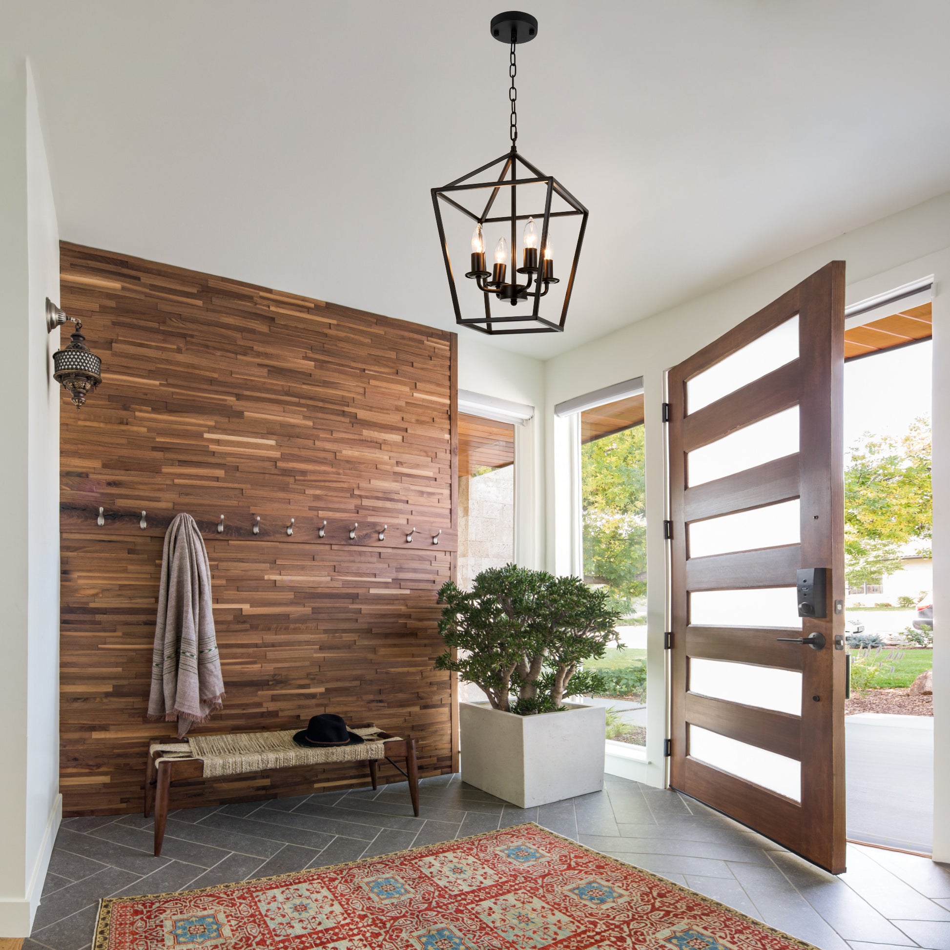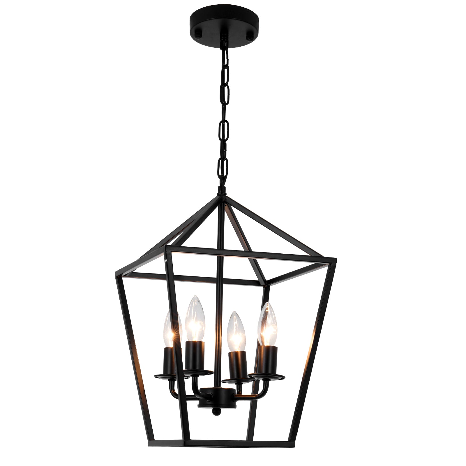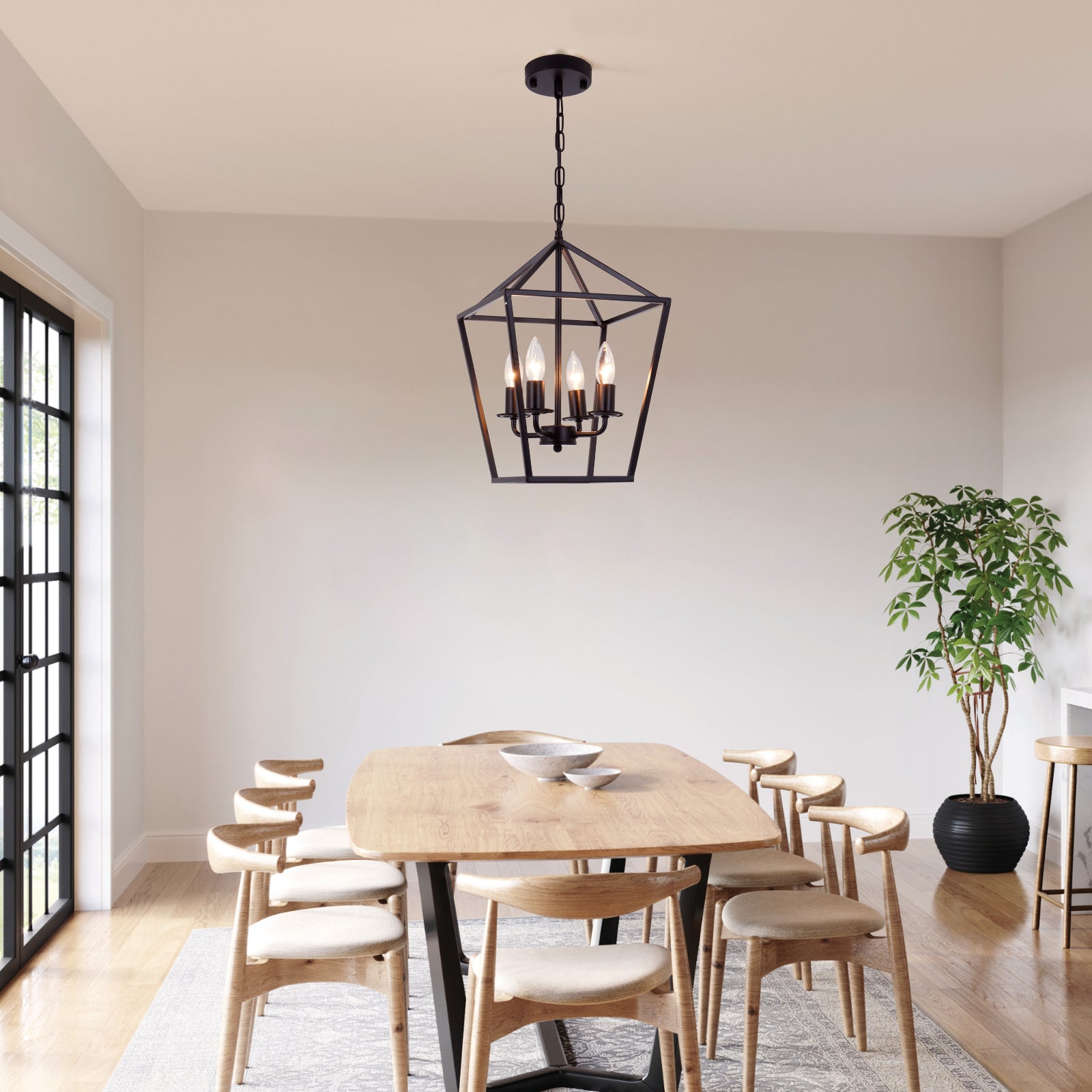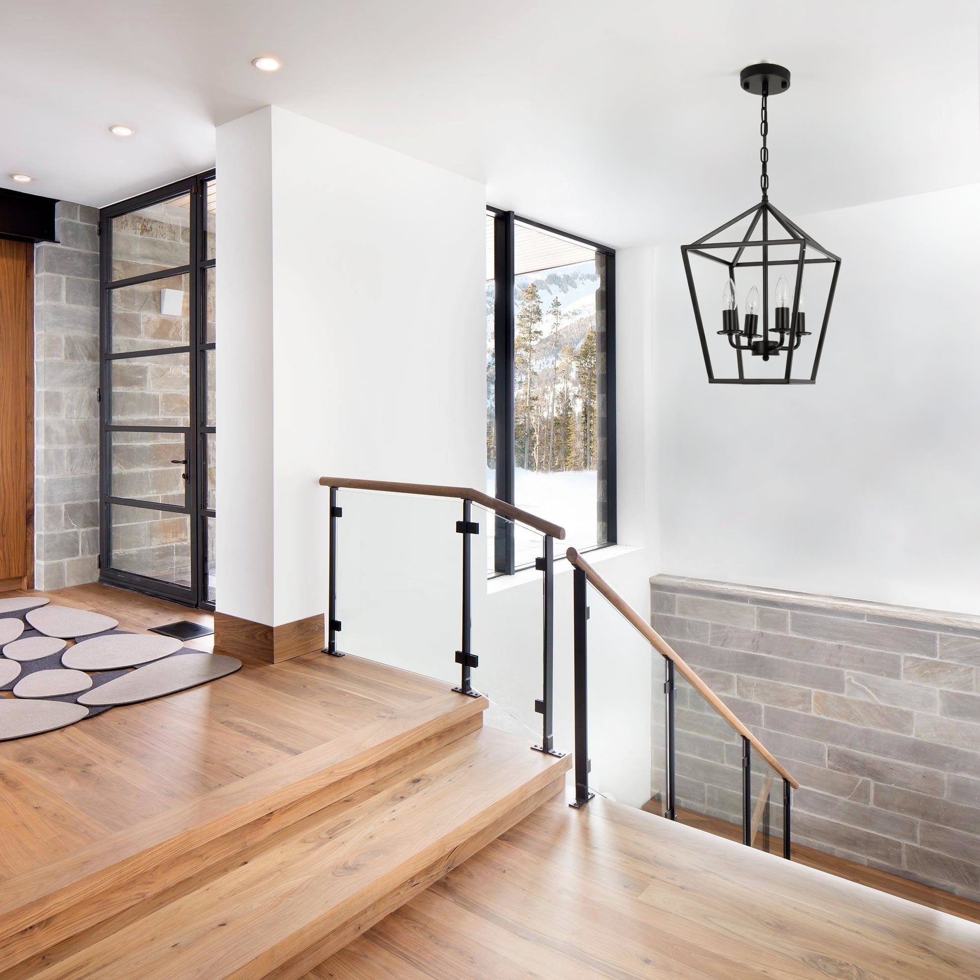 The 4-head foyer chandelier features a matte black, round frame inspired by wagon wheels and transparent glass shades, embodying a rustic farmhouse style. Ideal for dining rooms, kitchens, living rooms, bedrooms, foyers, and porches.