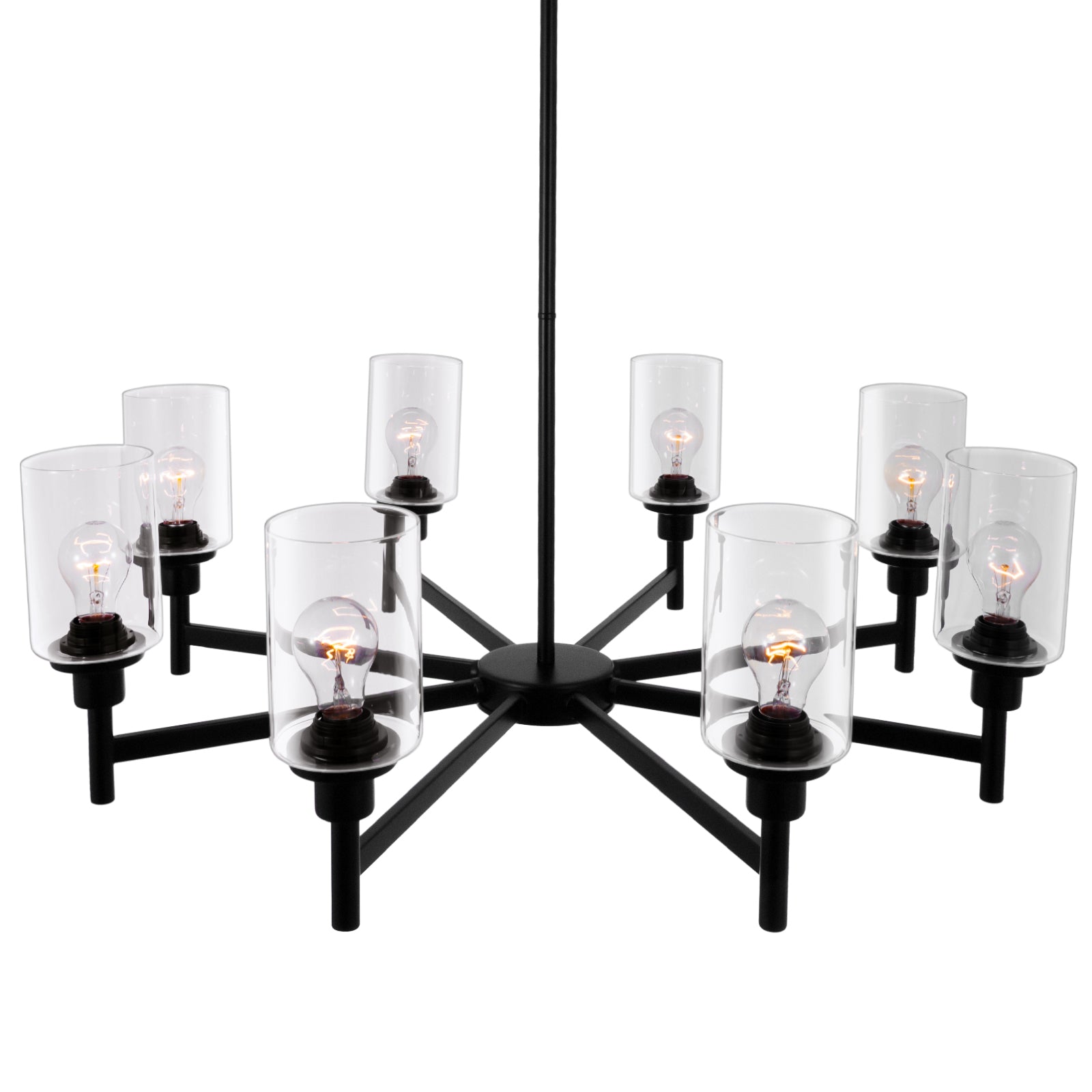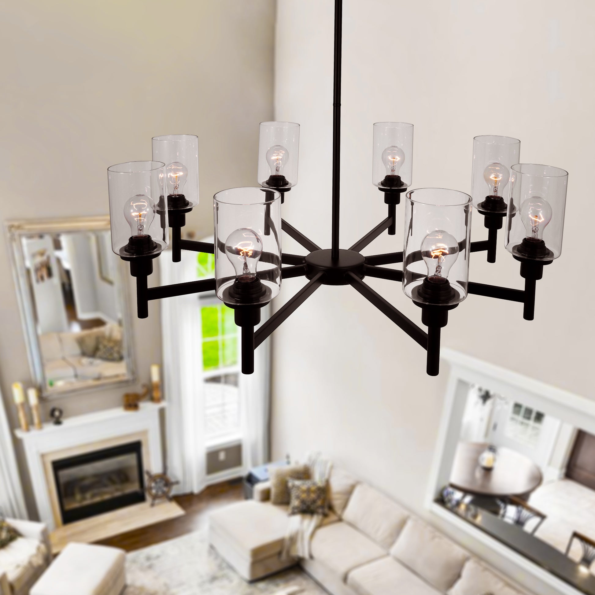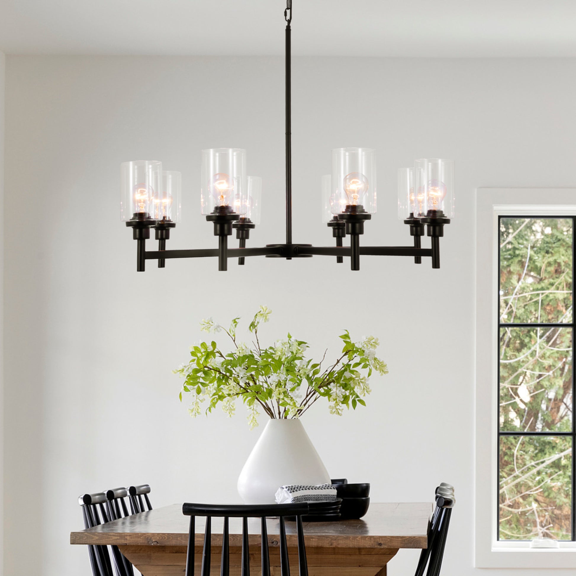 【Farmhouse and Classic Style Chandelier】The black chandelier is made of 8 clear glass shades and a sleek black metal frame, offering a minimalist and classic look that complements both modern and farmhouse decor. 8-light farmhouse pendant lighting perfect used in kitchen island, dining room, kitchen, dining table, living room, restaurant, and more.