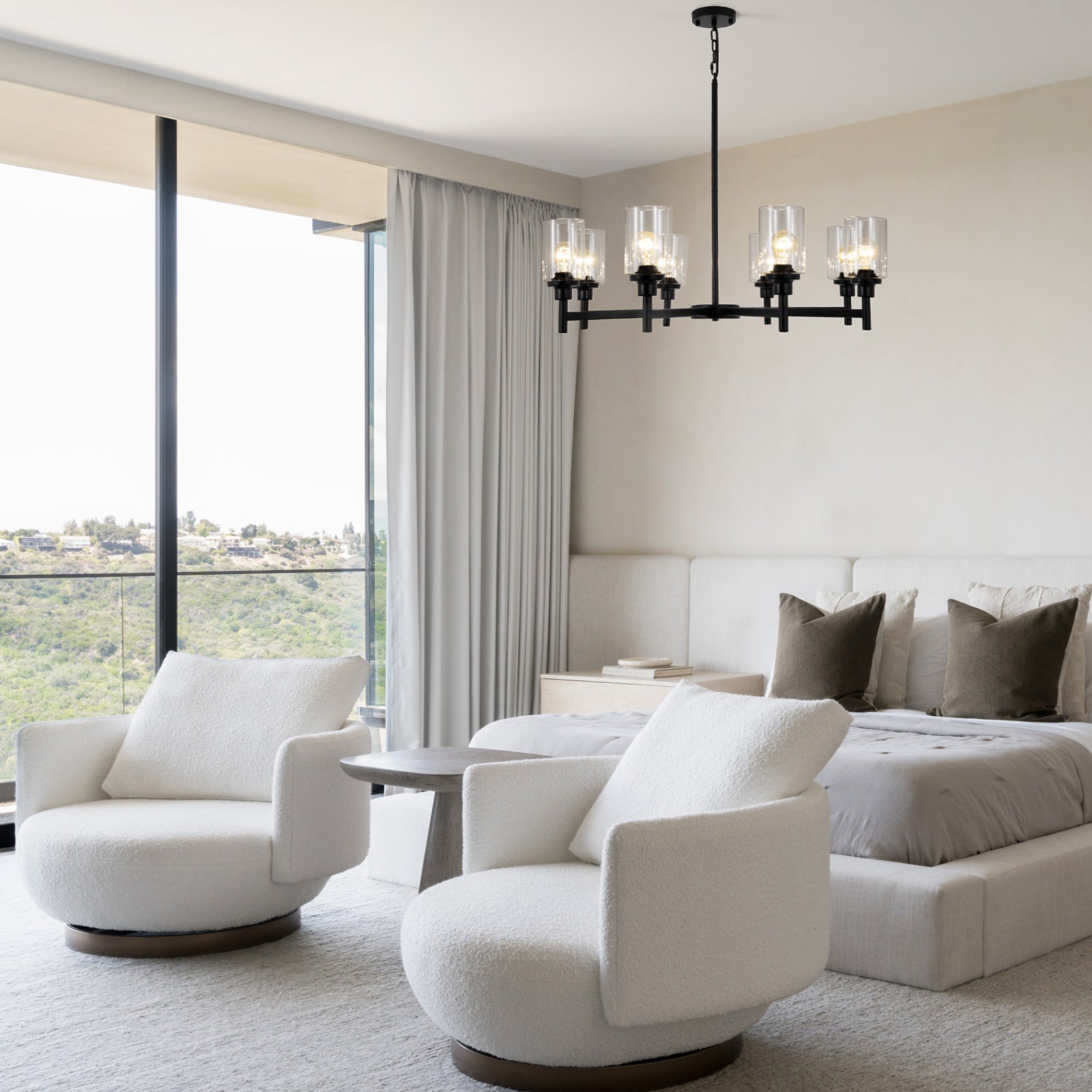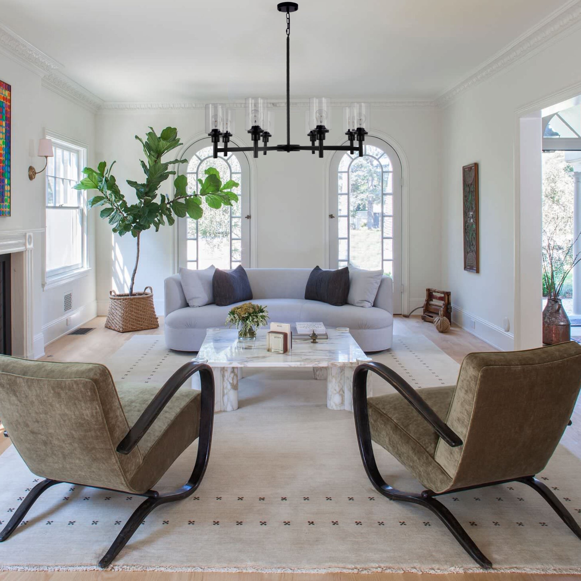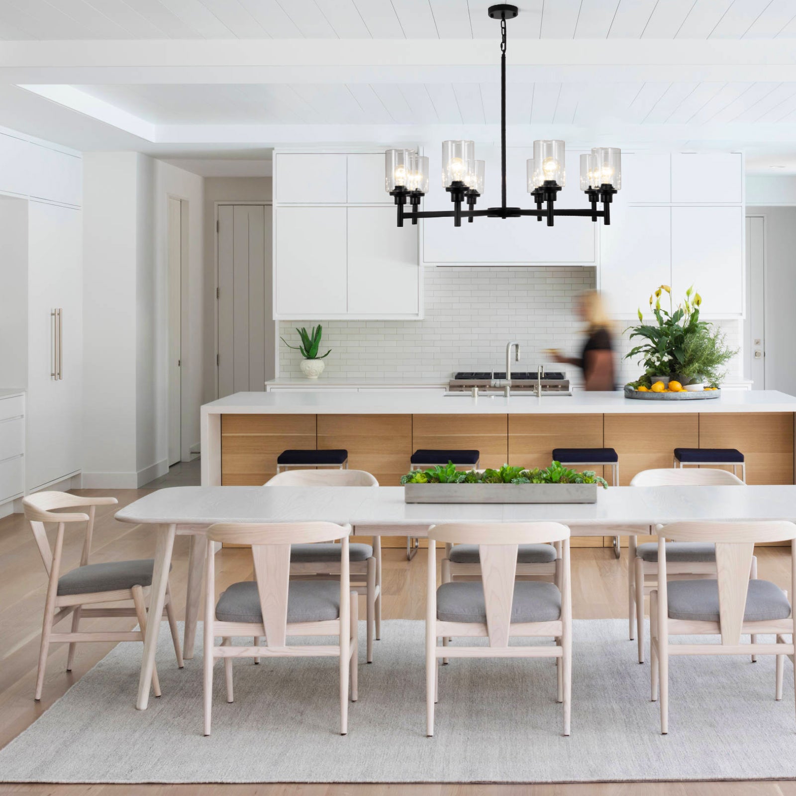 【Farmhouse and Classic Style Chandelier】The black chandelier is made of 8 clear glass shades and a sleek black metal frame, offering a minimalist and classic look that complements both modern and farmhouse decor. 8-light farmhouse pendant lighting perfect used in kitchen island, dining room, kitchen, dining table, living room, restaurant, and more.