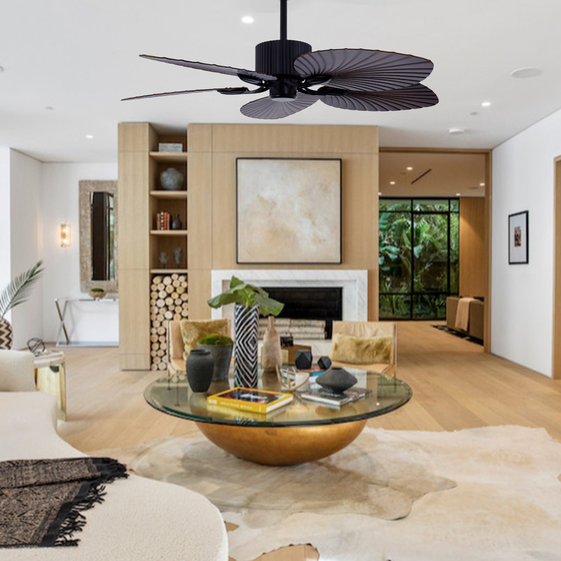 Enhance your space with our 52" Rustic Tropical Ceiling Fan featuring a bronze finish and hand-carved palm leaves. Perfect for rooms of 300-380 sq. ft., such as living rooms, bedrooms, and dining areas.