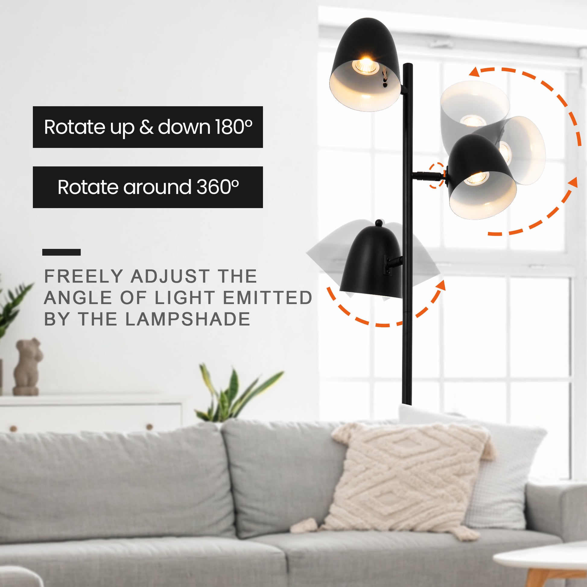 The industrial farmhouse floor lamp features 3 omnidirectional light fixtures can rotate them separately to meet your different needs, you can 180° adjust the up & down the lampshades, 360° rotate horizontally, providing convenient lighting needs whether the lamp is placed by a table, bed, chair, and more corners.