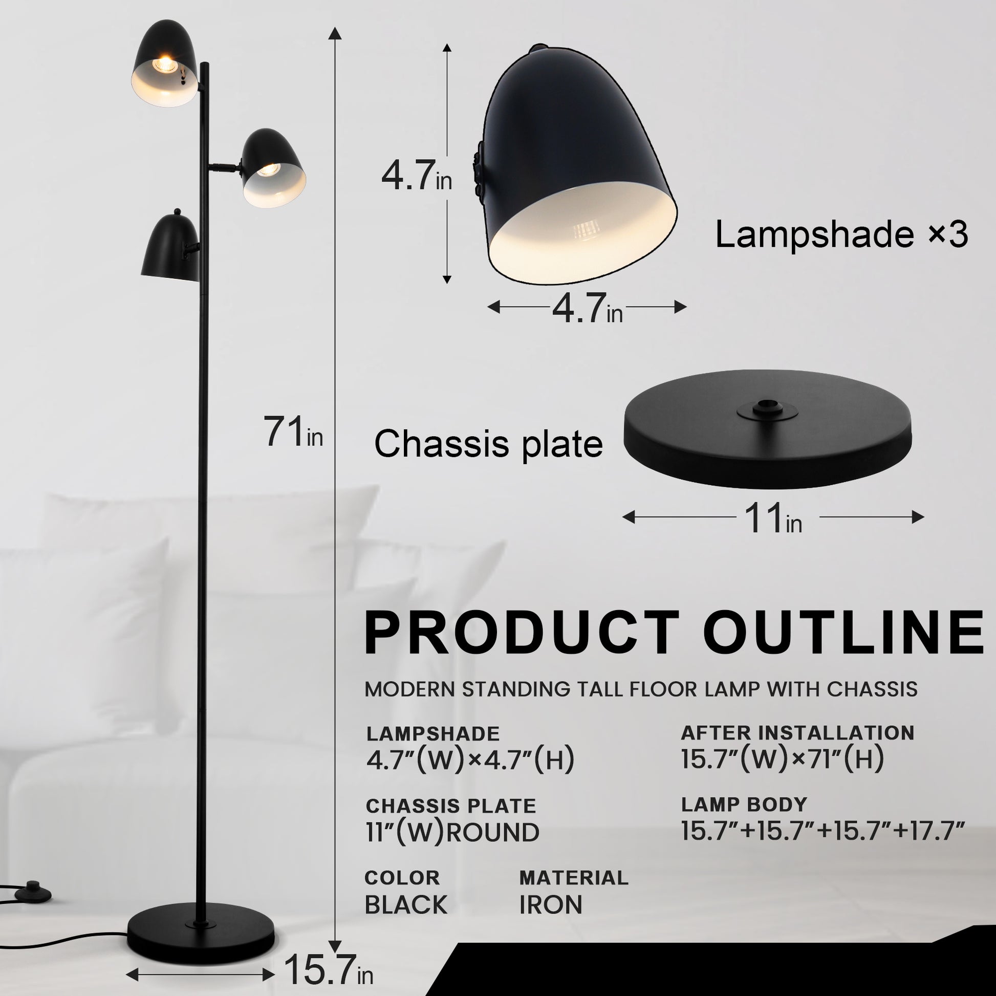 【GU10 Bulb Socket and Dimension】The farmhouse standing lamp requires with 3 GU10 LED bulbs, 60W Max (Bulb Not Included), 70" upgrated humanized height, base is 11" wide at the bottom. Each shade is 4" high x 4.5" wide. Weighs 12.5 lbs. Fully assemble fixture size is is 70" high x 15.7" wide. weighted black finish metal base and globe shades. 78.7'' long black power cord.