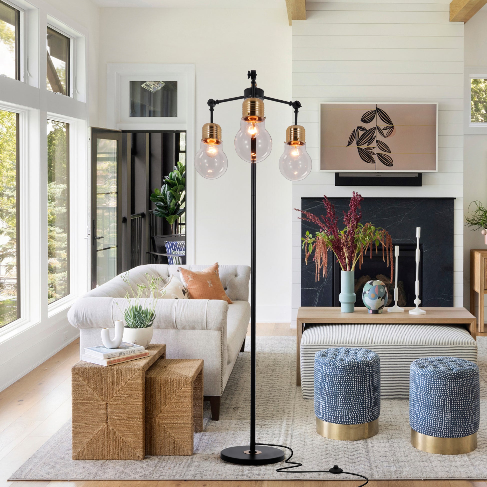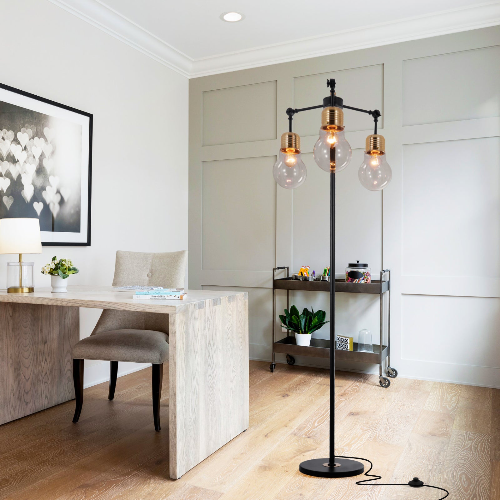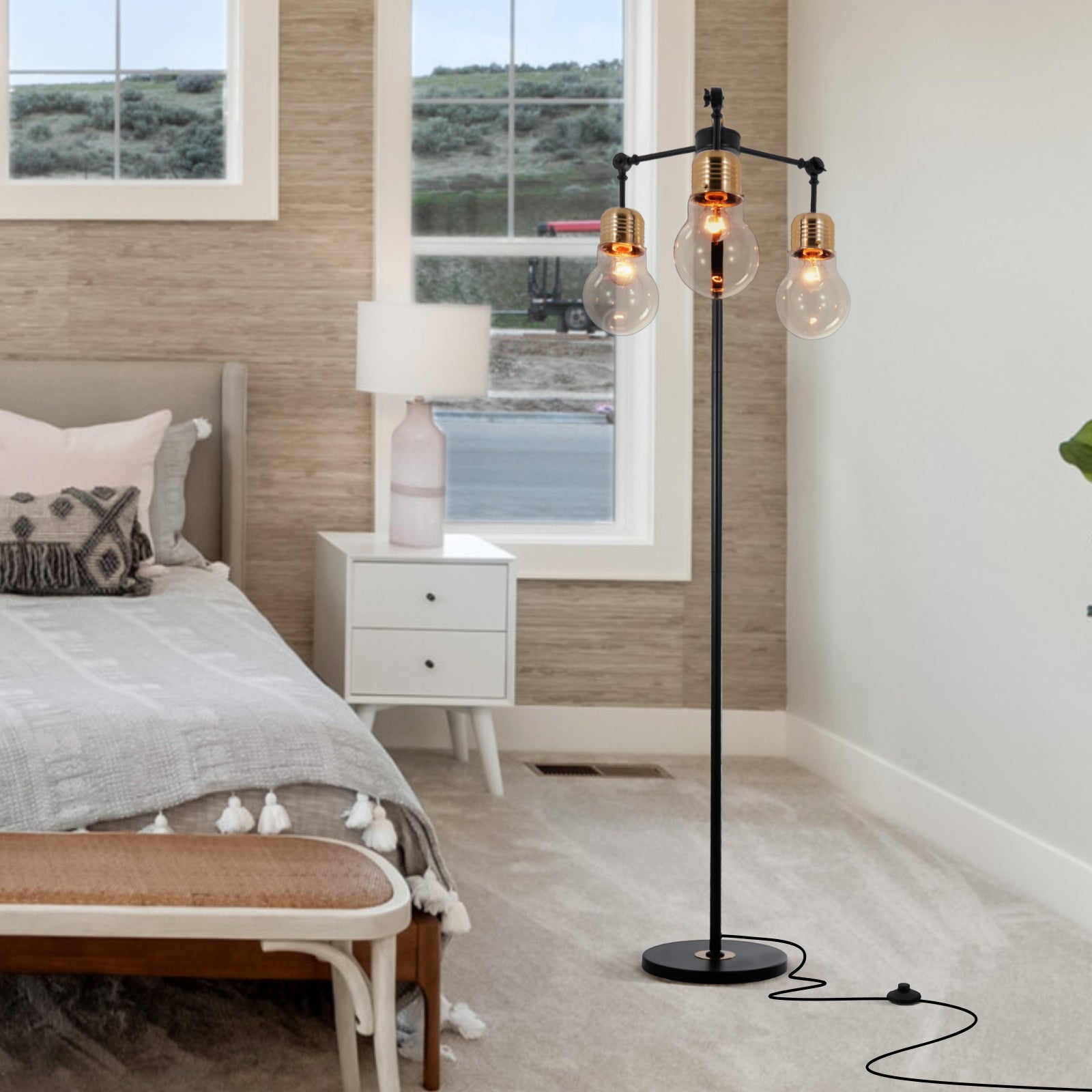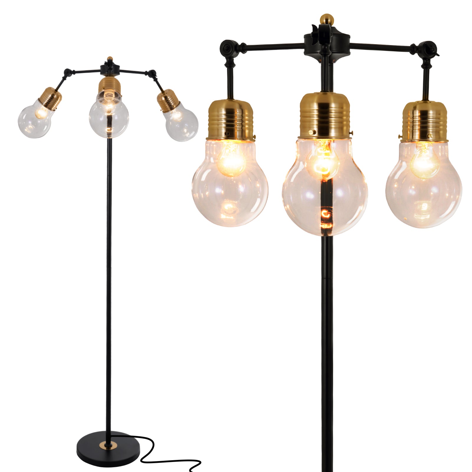 Bring on the modernism with our Art Deco-inspired clear globe floor lamp. Built-in 3 E26 lampholders (bulbs not included), in high-definition glass shades cast a warm glow, providing bright light you can adjust height and perspective to your liking. The rich brass-gold finish can add vintage style to your living room, office, or bedroom.(Installation video:https://www.youtube.com/watch?v=zHwgS7Vk9-Q)