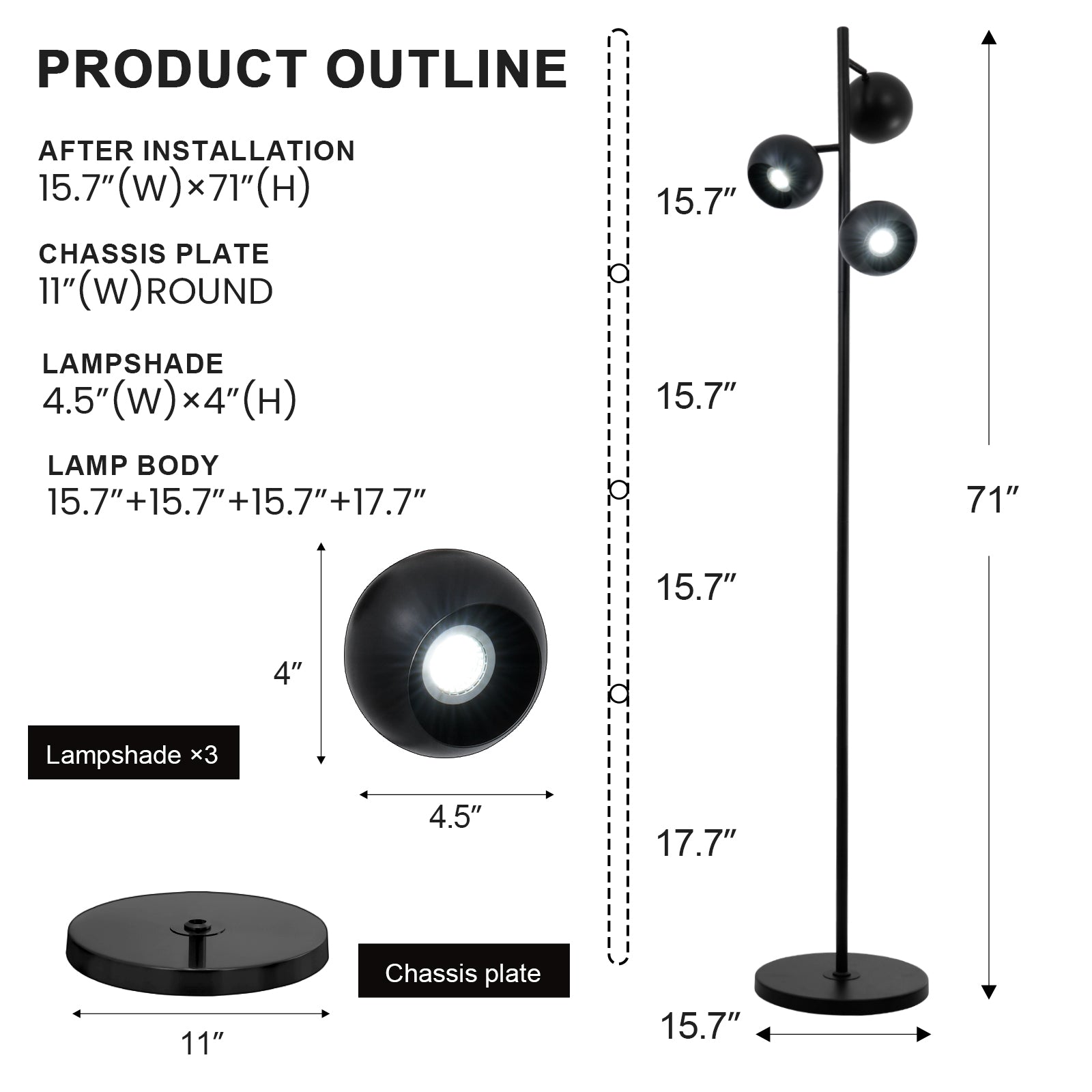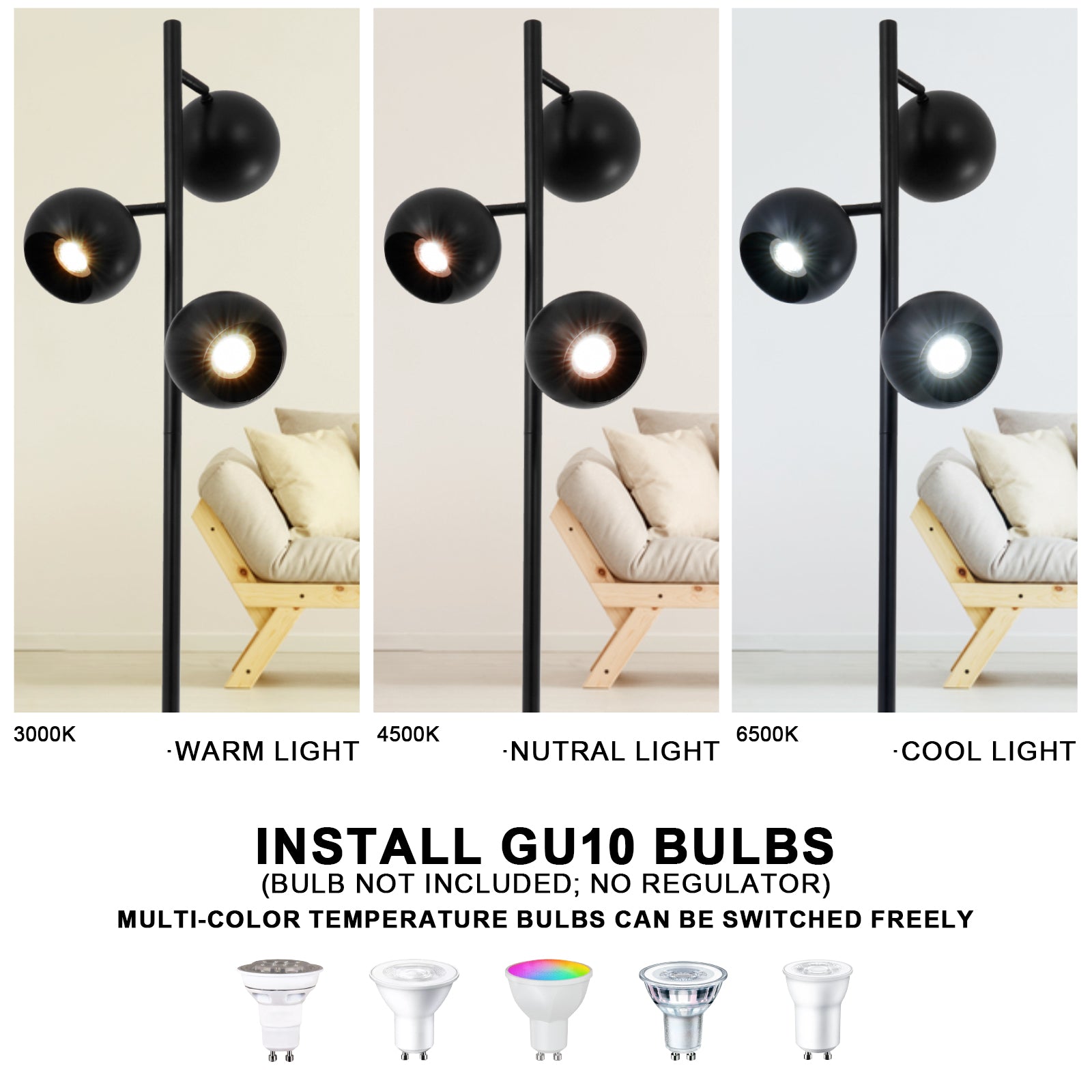 【GU10 Bulb Socket and Dimension】The farmhouse standing lamp requires with 3 GU10 LED bulbs, 60W Max (Bulb Not Included), 70" upgrated humanized height, base is 11" wide at the bottom. Each shade is 4" high x 4.5" wide. Weighs 12.5 lbs. Fully assemble fixture size is is 70" high x 15.7" wide. weighted black finish metal base and globe shades. 78.7'' long black power cord.
