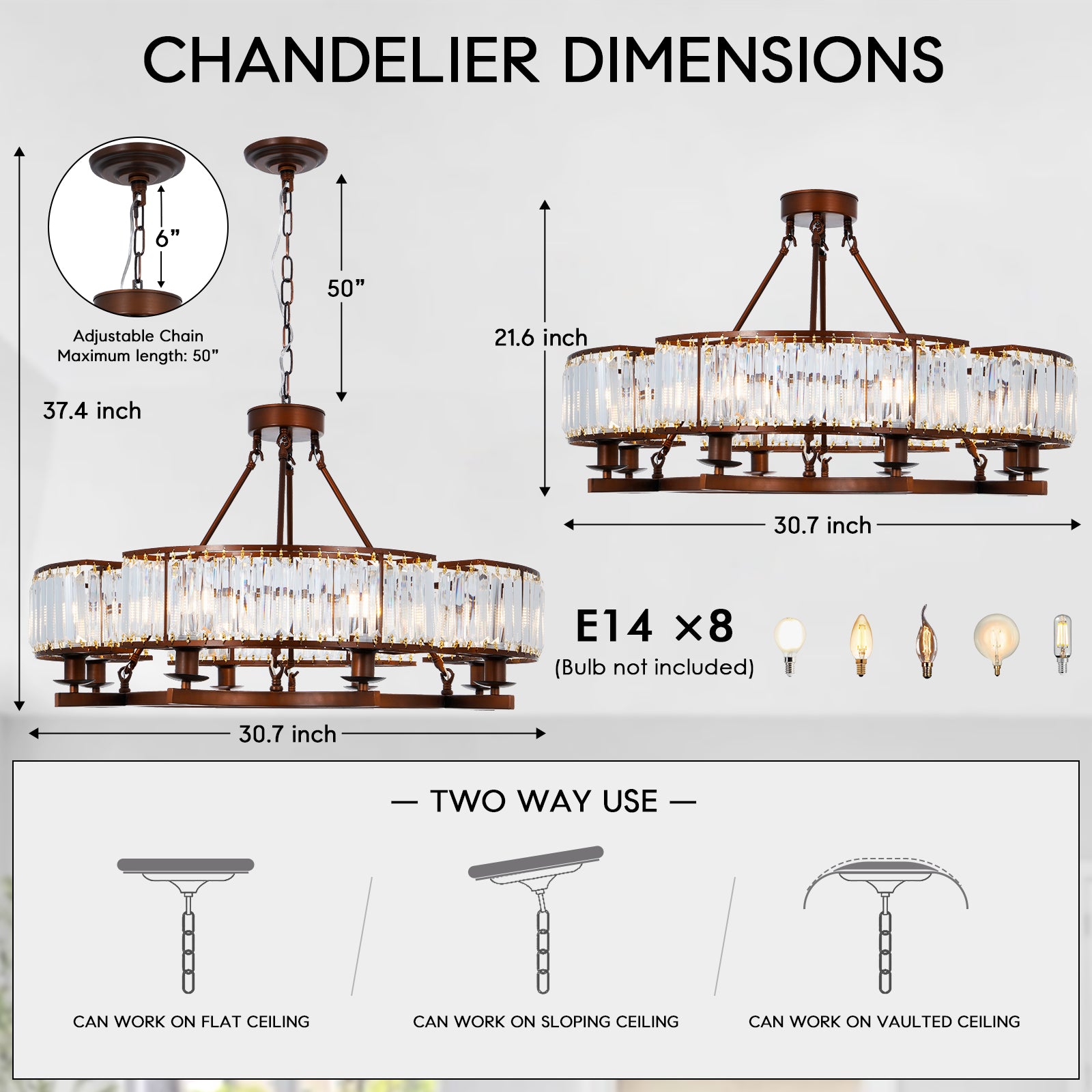 Requires 8 E14 bulbs (max 40W each), fully dimmable with a compatible switch.