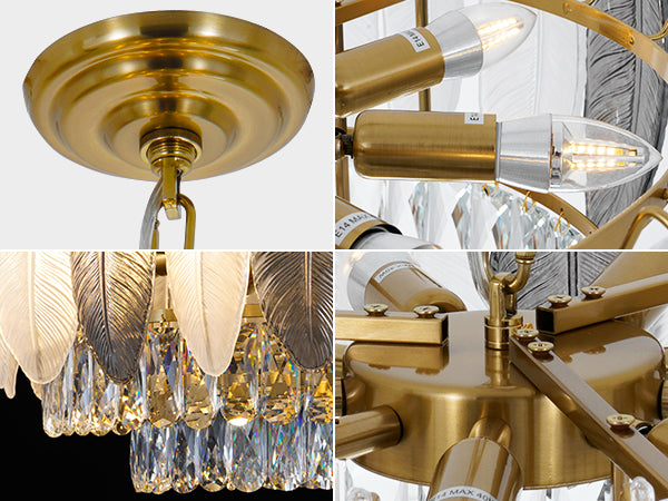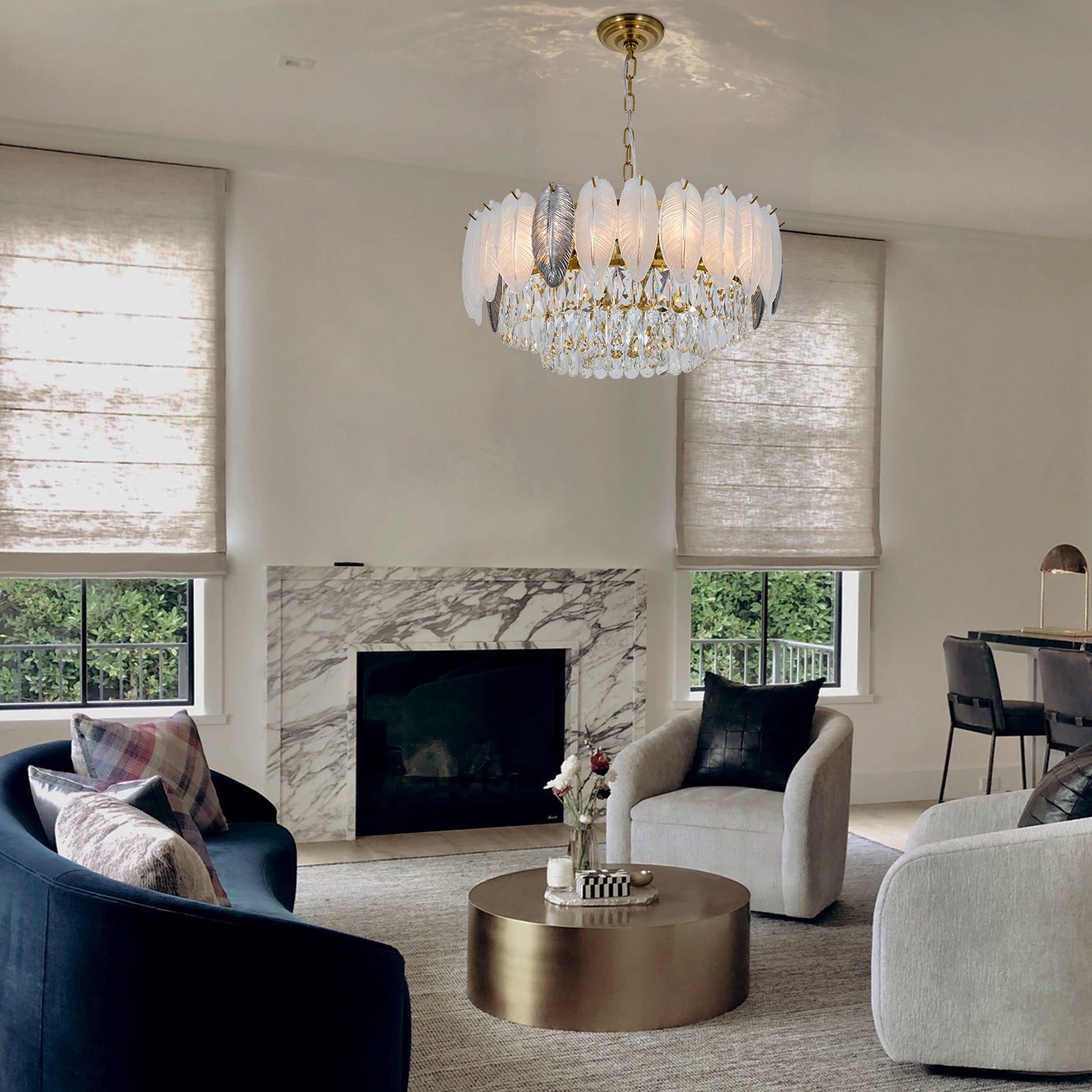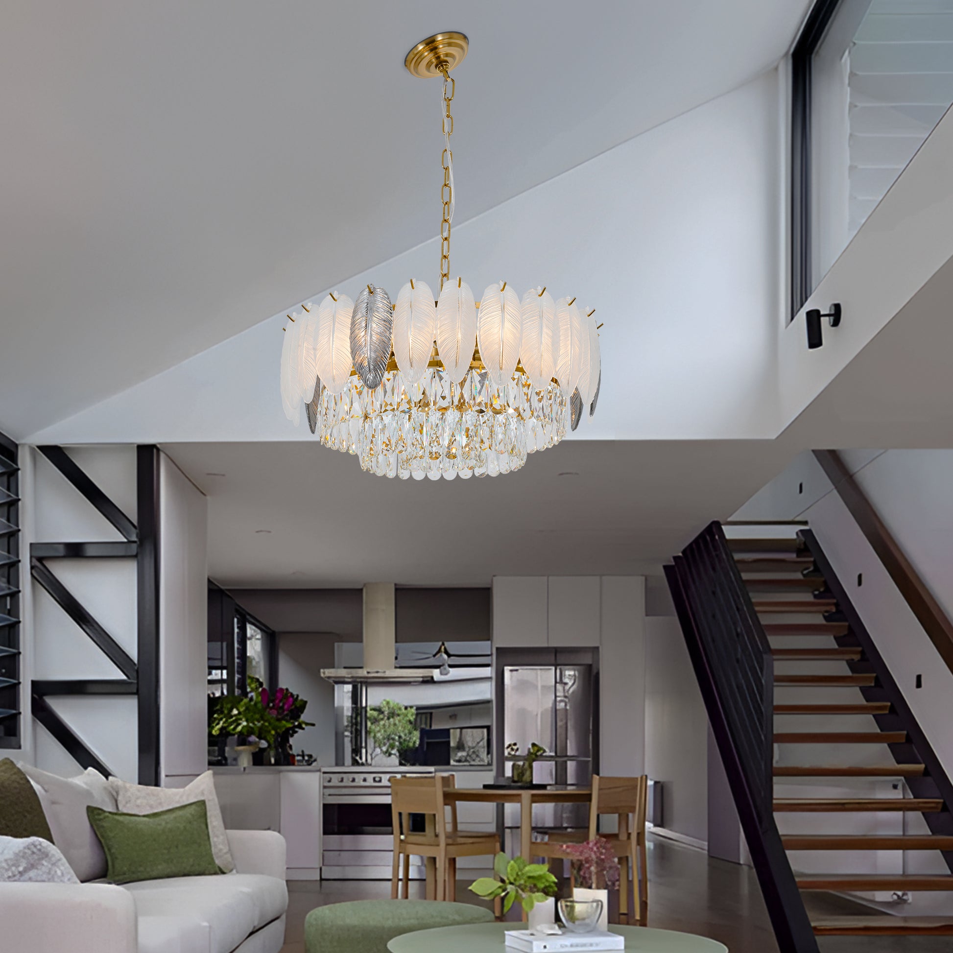 Its adjustable design allows for customized height and positioning, ensuring it fits perfectly in any room. The gold finish adds a touch of elegance, while the feathers provide a unique and whimsical charm. Ideal for living rooms, dining areas, or grand foyers, this chandelier enhances the ambiance and aesthetic appeal of any space with its sophisticated and refined style.