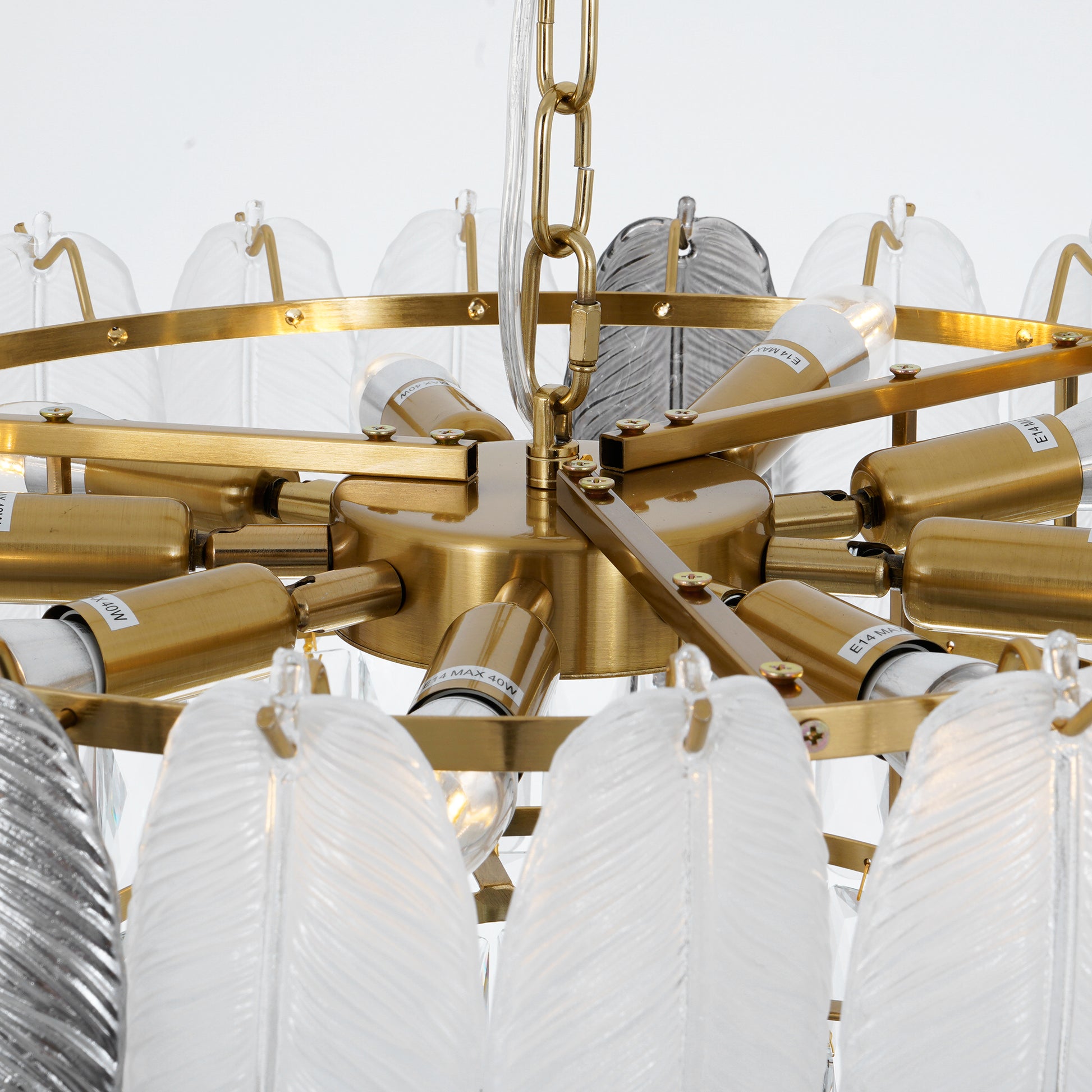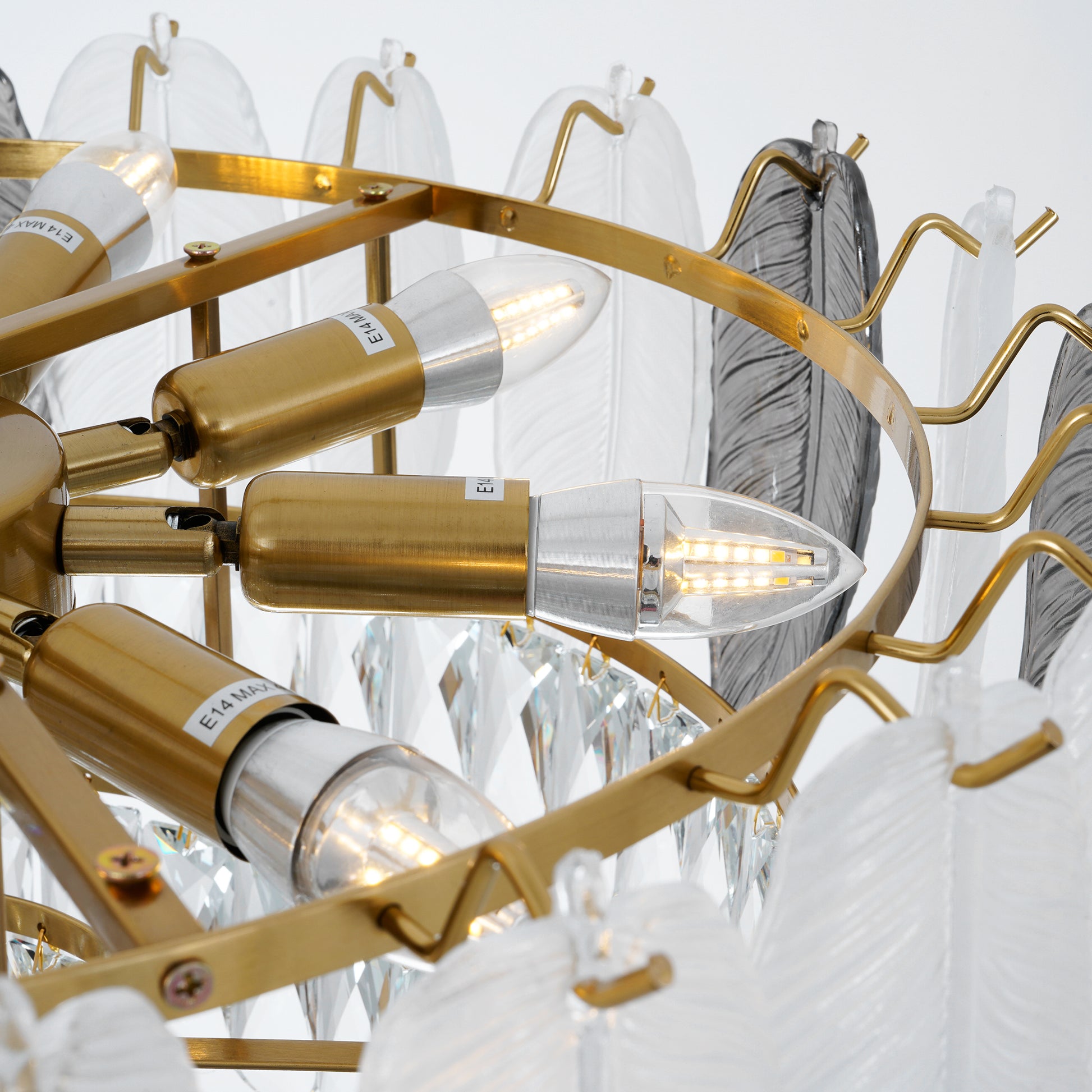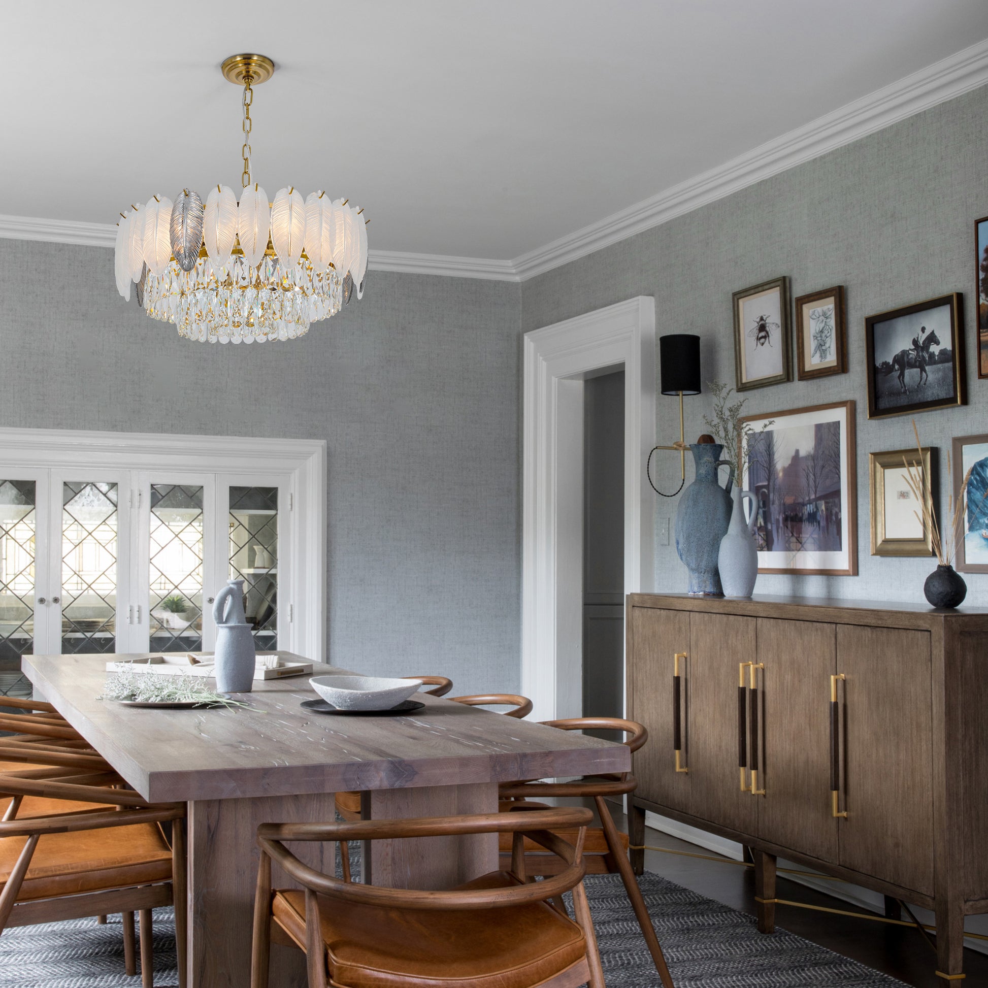 Its adjustable design allows for customized height and positioning, ensuring it fits perfectly in any room. The gold finish adds a touch of elegance, while the feathers provide a unique and whimsical charm. Ideal for living rooms, dining areas, or grand foyers, this chandelier enhances the ambiance and aesthetic appeal of any space with its sophisticated and refined style.