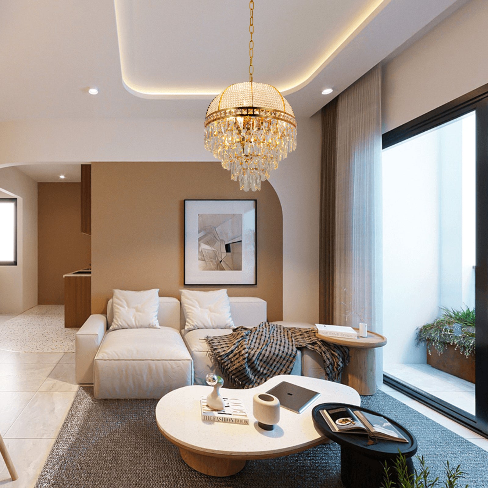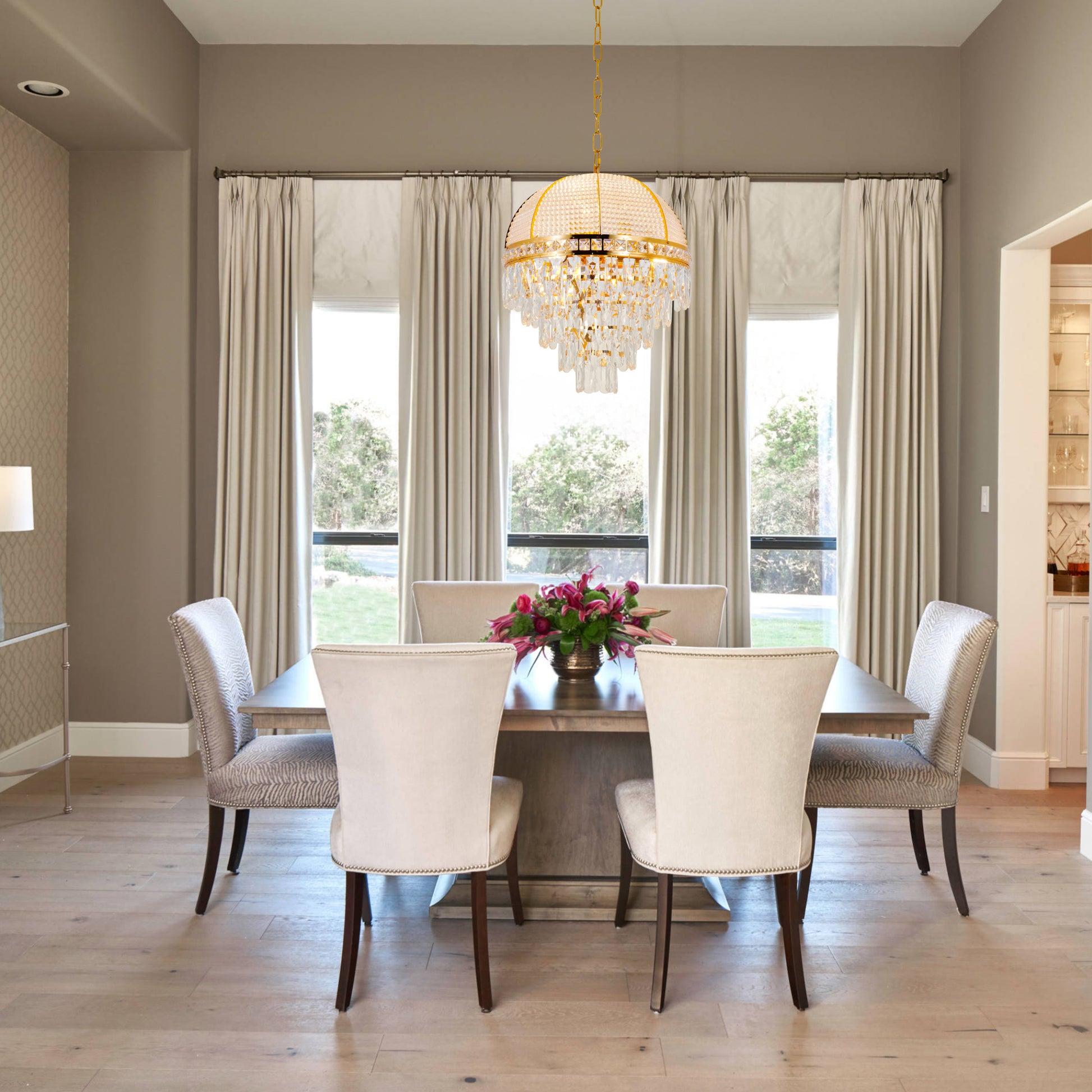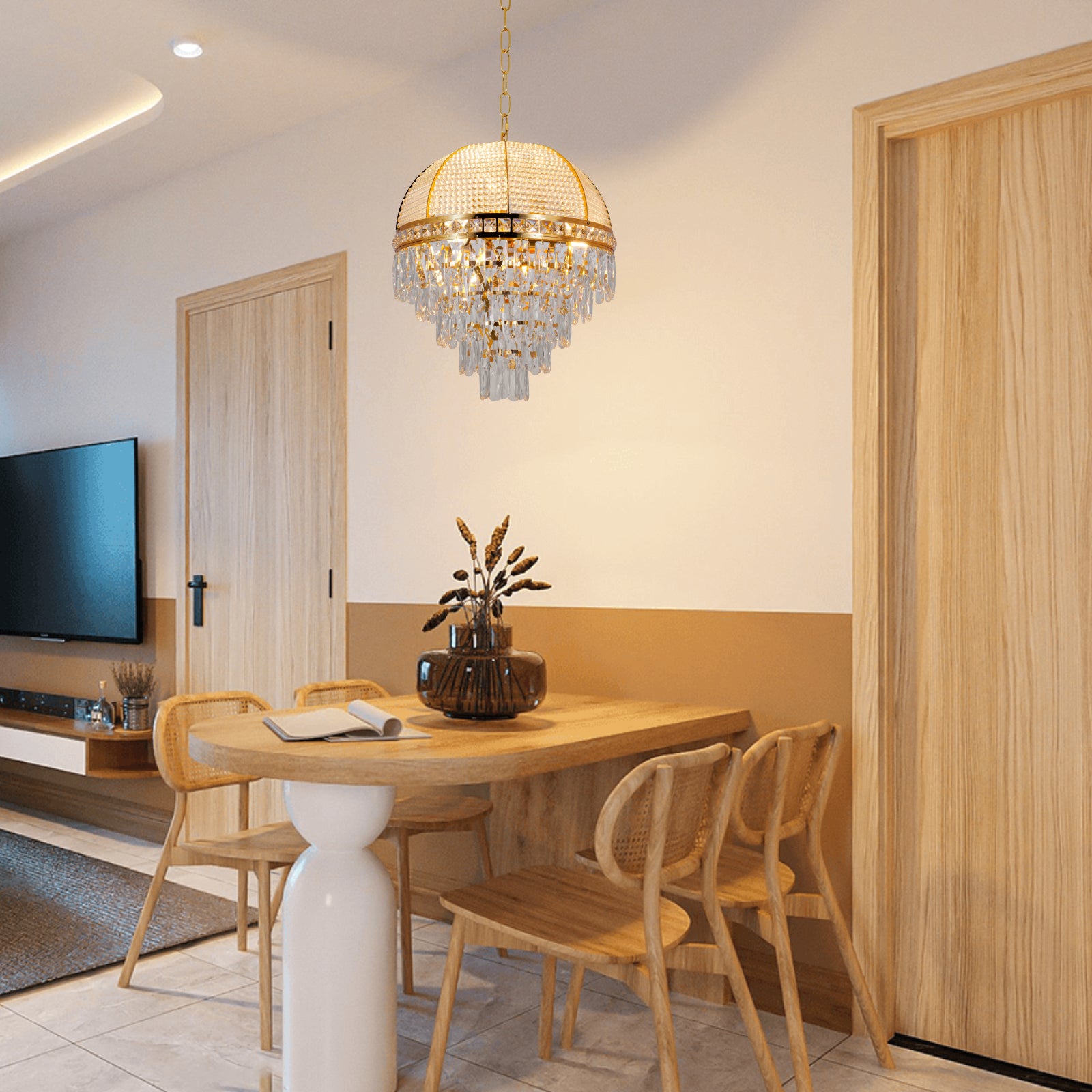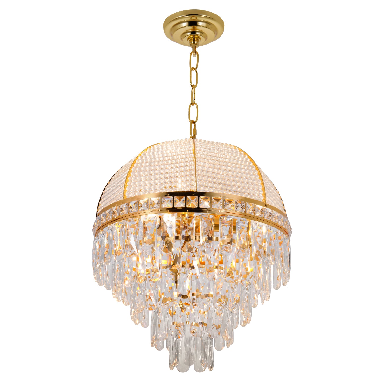 - EXQUISITE CRAFTSMANSHIP: The metal is finely polished, showing smooth texture and golden luster, adding a noble and luxury to the whole chandelier. K9 crystals use advanced cutting technology to ensure that each side of the crystal is evenly cut so that it can better refract the light