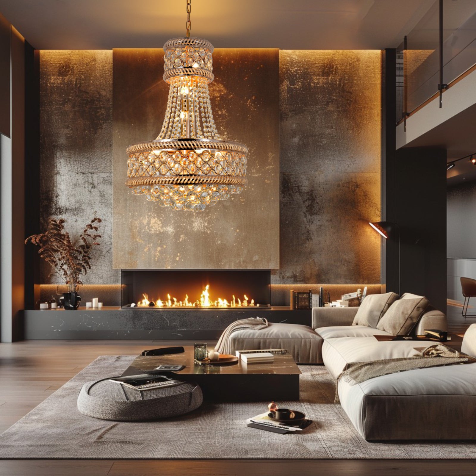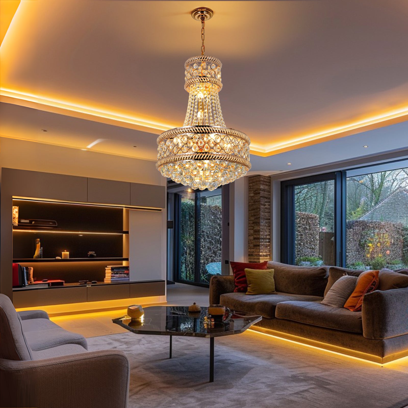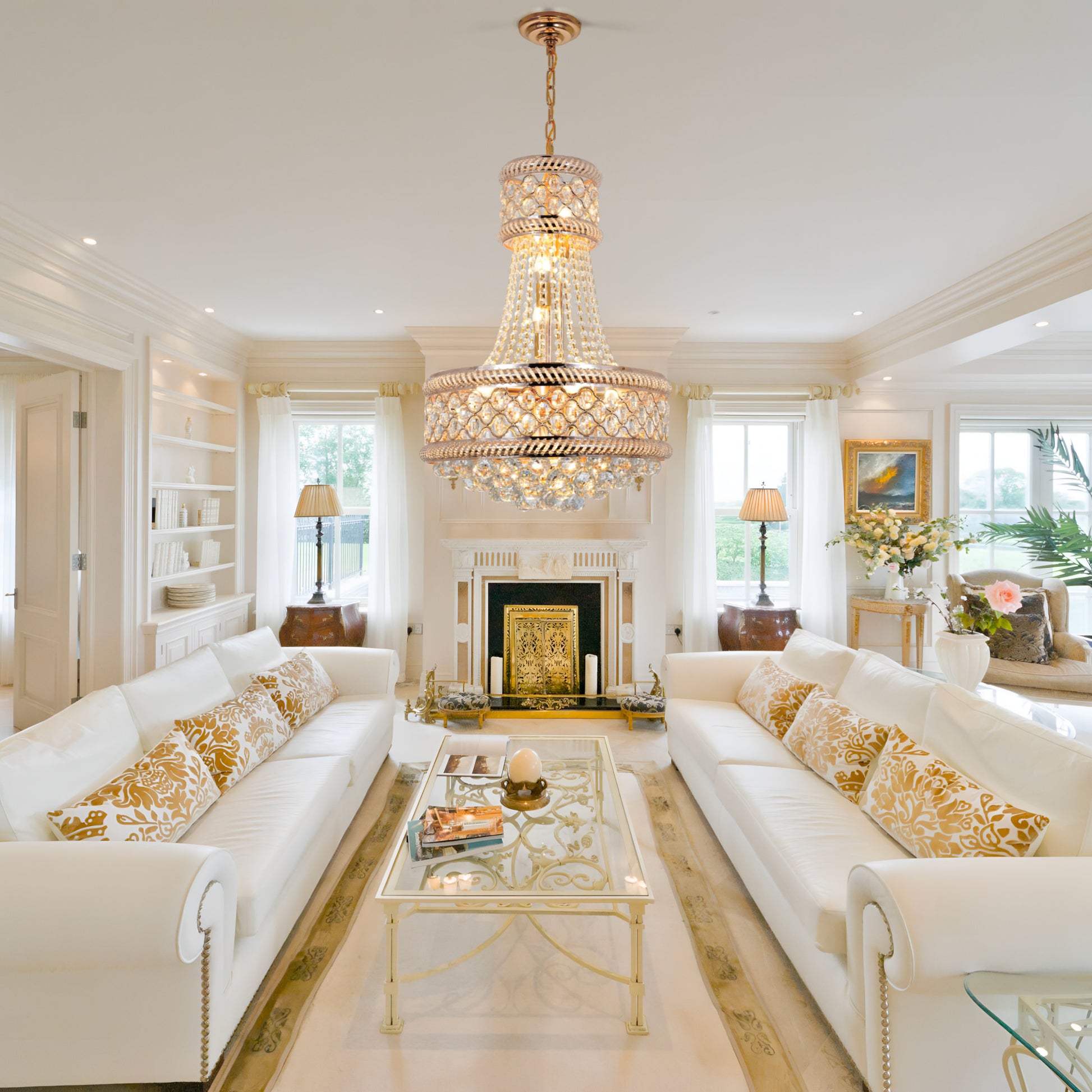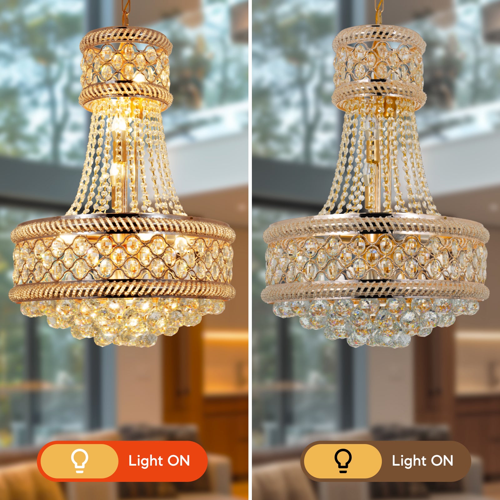 Ideal for living rooms, dining rooms, kitchen islands, bedrooms, and restaurants. The gold chandelier's light reflects through the crystals, adding a romantic and shining atmosphere.