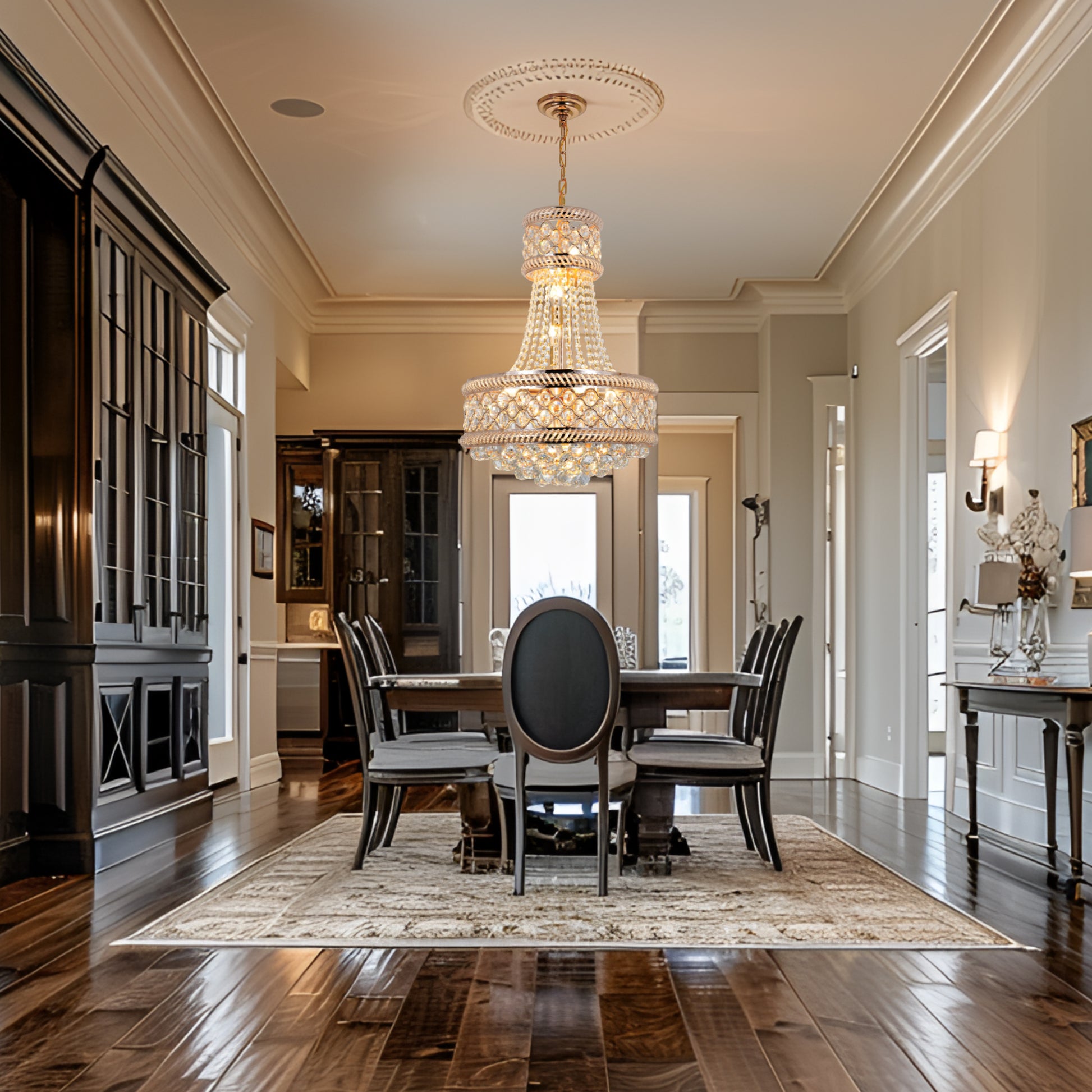 This elegant, classic crystal chandelier is a stunning centerpiece for living rooms, dining rooms, bedrooms, foyers, hallways, restaurants, entryways, and more. It can also be hung from sloped or vaulted ceilings.