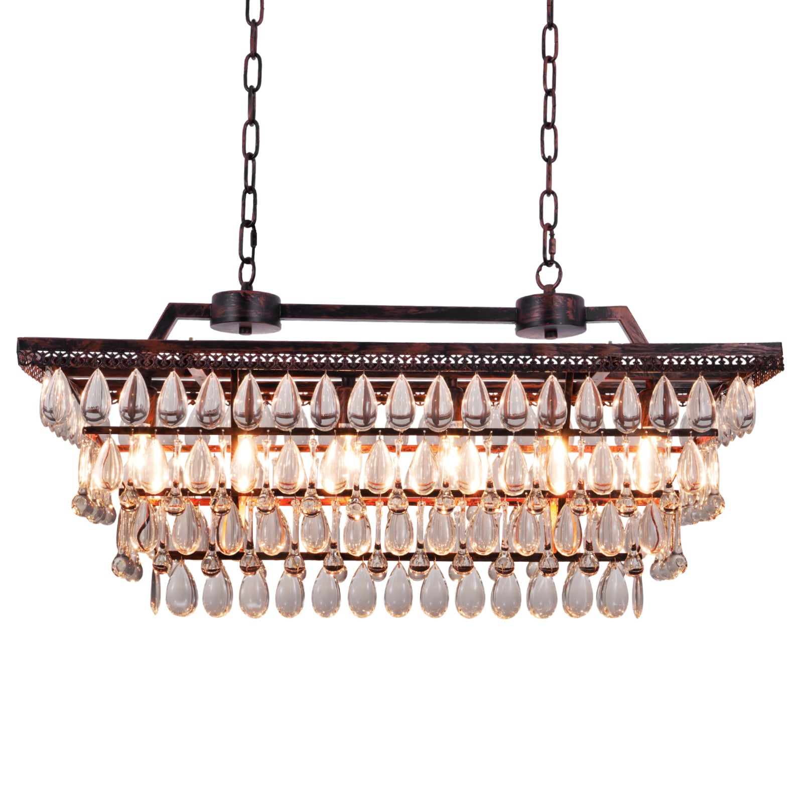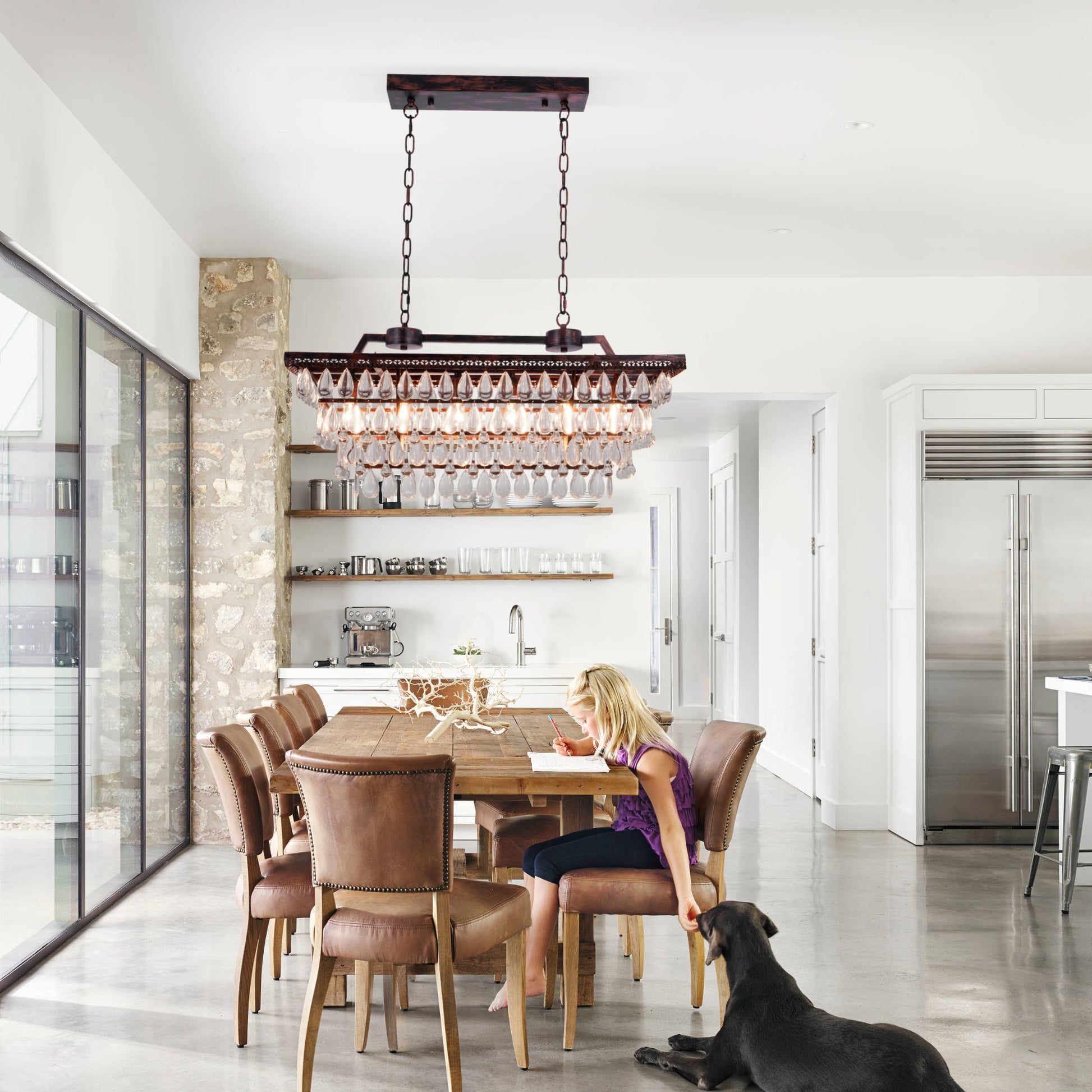 - Luxury Crystal Chandelier: The Wellmet crystal chandelier with its antique bronze finish and 40-inch rectangular shape, this chandelier adds a touch of old-world charm to any space. The geometric design adds sparkling raindrop crystals making it a perfect choice for farmhouse kitchen islands or dining rooms with a contemporary aesthetic
