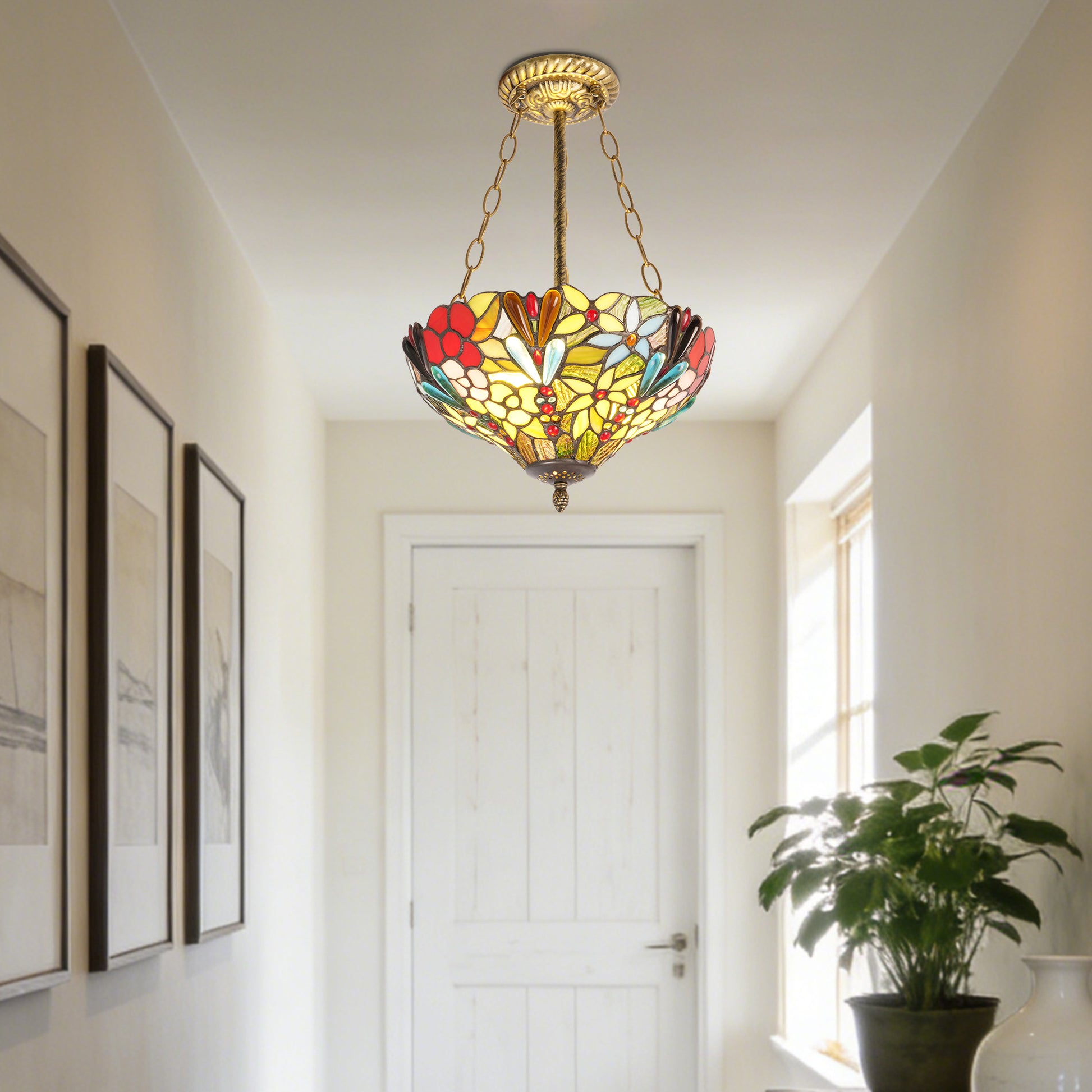 Vibrant Tiffany Style Design: The chandelier’s shade is crafted from individually cut pieces of stained glass, arranged in a detai pattern of blooming flowers and delicate foliage. When illuminated, the glass diffuses light to create a warm, colorful glow that brings the artwork to life, casting a rich, inviting ambiance throughout the room.