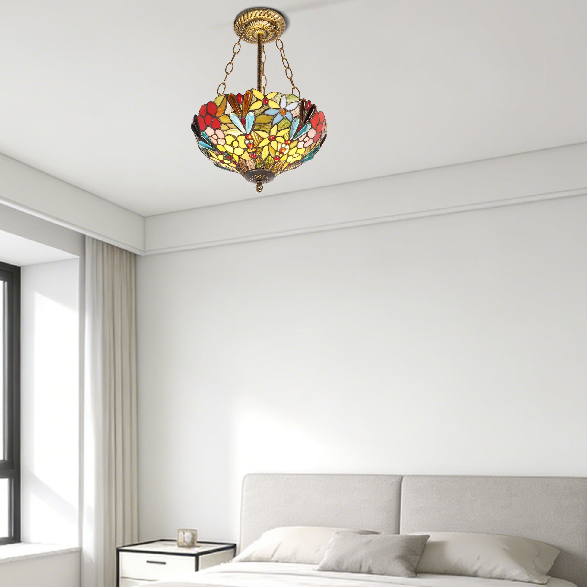 Elegant Gold Hardware: The fixture is suspended by ornate metal chains and a decorative ceiling plate, finished in a rich gold that complements the stained glass perfectly. The semi-flush mount design allows for a sleek, low-profile installation, making it suitable for rooms with standard or low ceilings.
