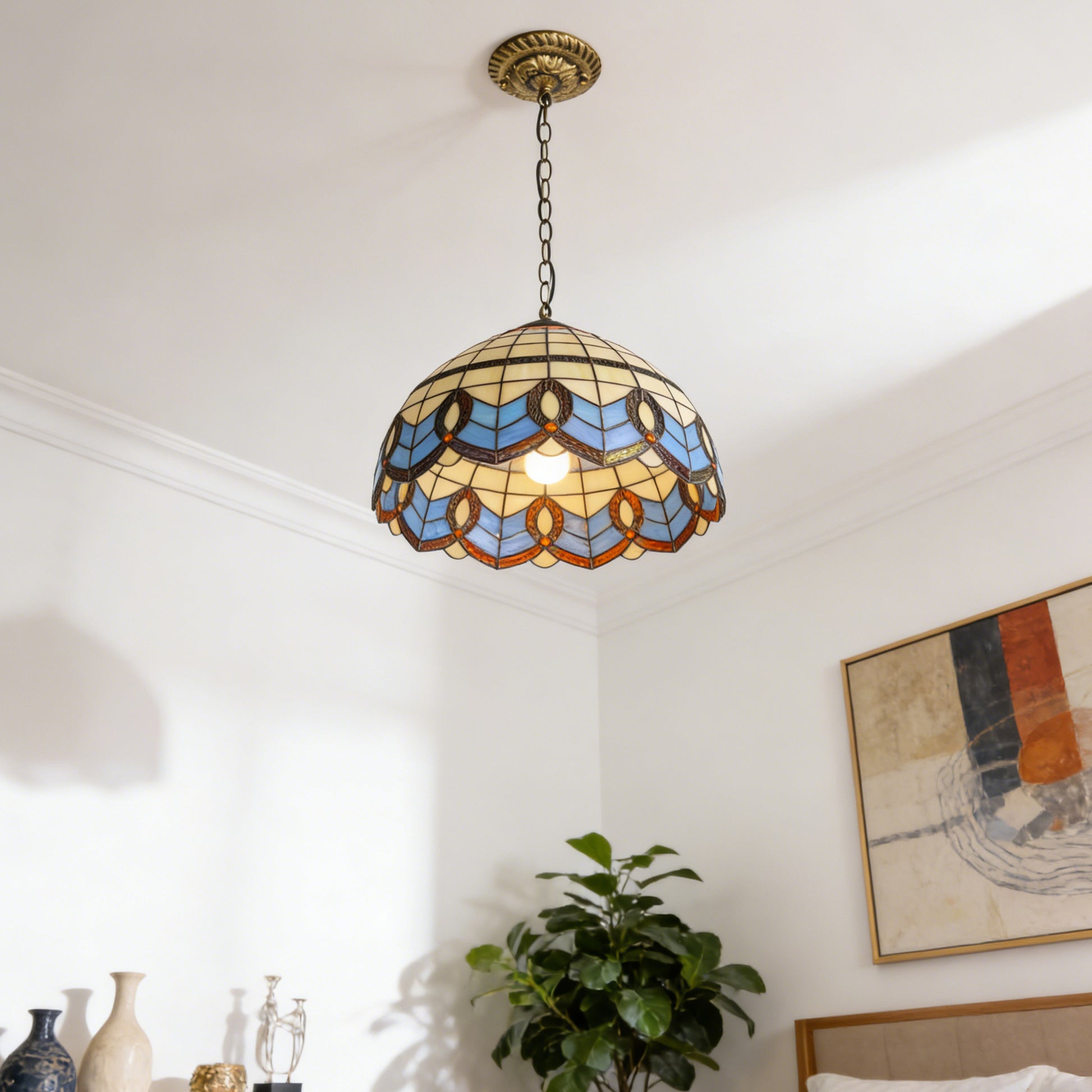 Timeless Tiffany Style Design: The pendant light’s shade is crafted from individually cut pieces of stained glass, arranged in a detailed geometric pattern. The main body is a warm beige grid, while the bottom edge is decorated with a striking band of blue and gold chevron patterns, and the top is accented with vibrant orange and red petal-like details. When illuminated, the glass diffuses light to create a soft, colorful glow that brings the artwork to life, casting a rich, inviting ambiance throughout the room.