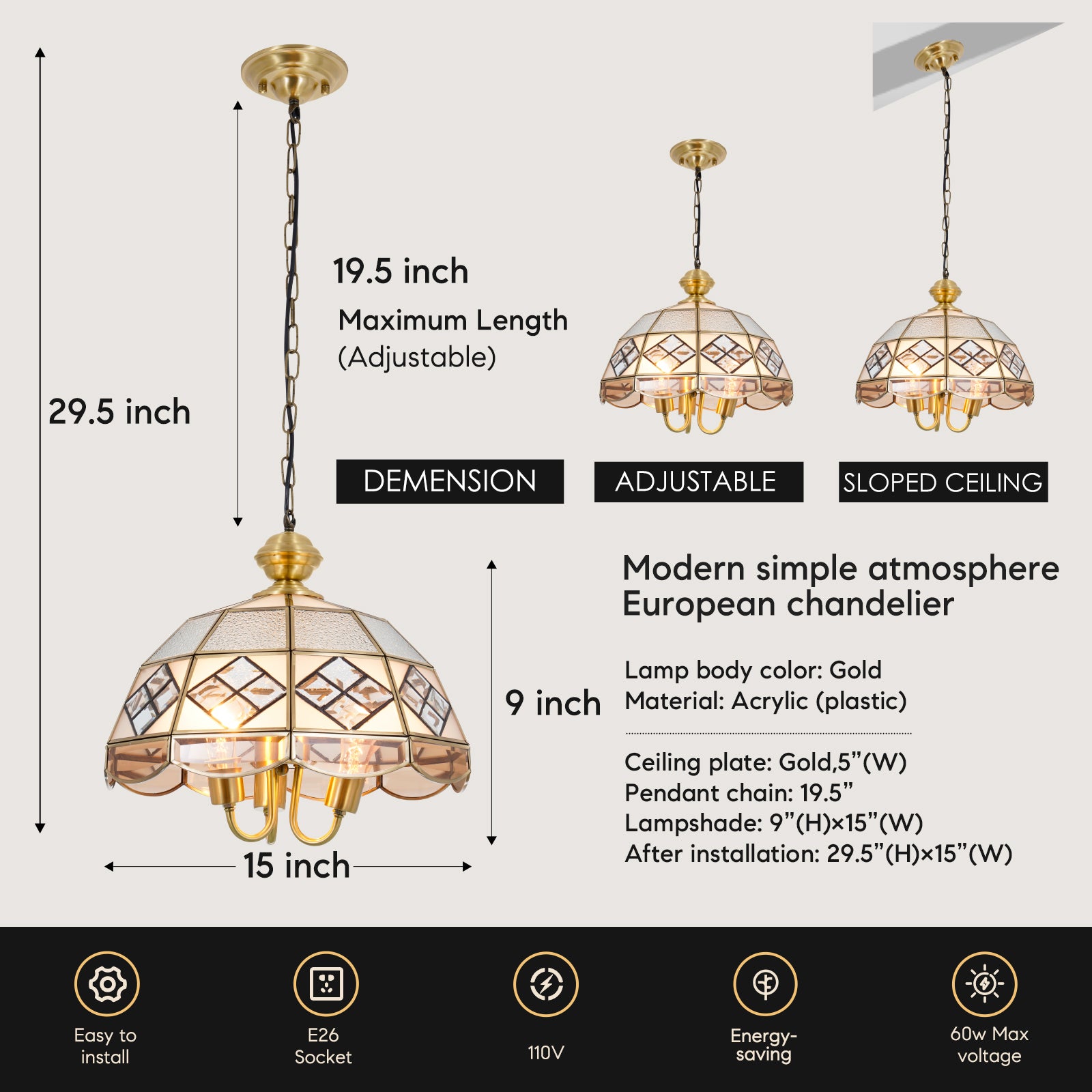 Dimensions and Light Source: The vintage pendant light measures 15 inches in width and 29.5inches in height, with a maximum length 19.5 inches adjustable. It requires four E26 *3 bulbs (bulbs not included), compatible with incandescent, LED, and CFL bulbs, with a maximum wattage of 60W per bulb.