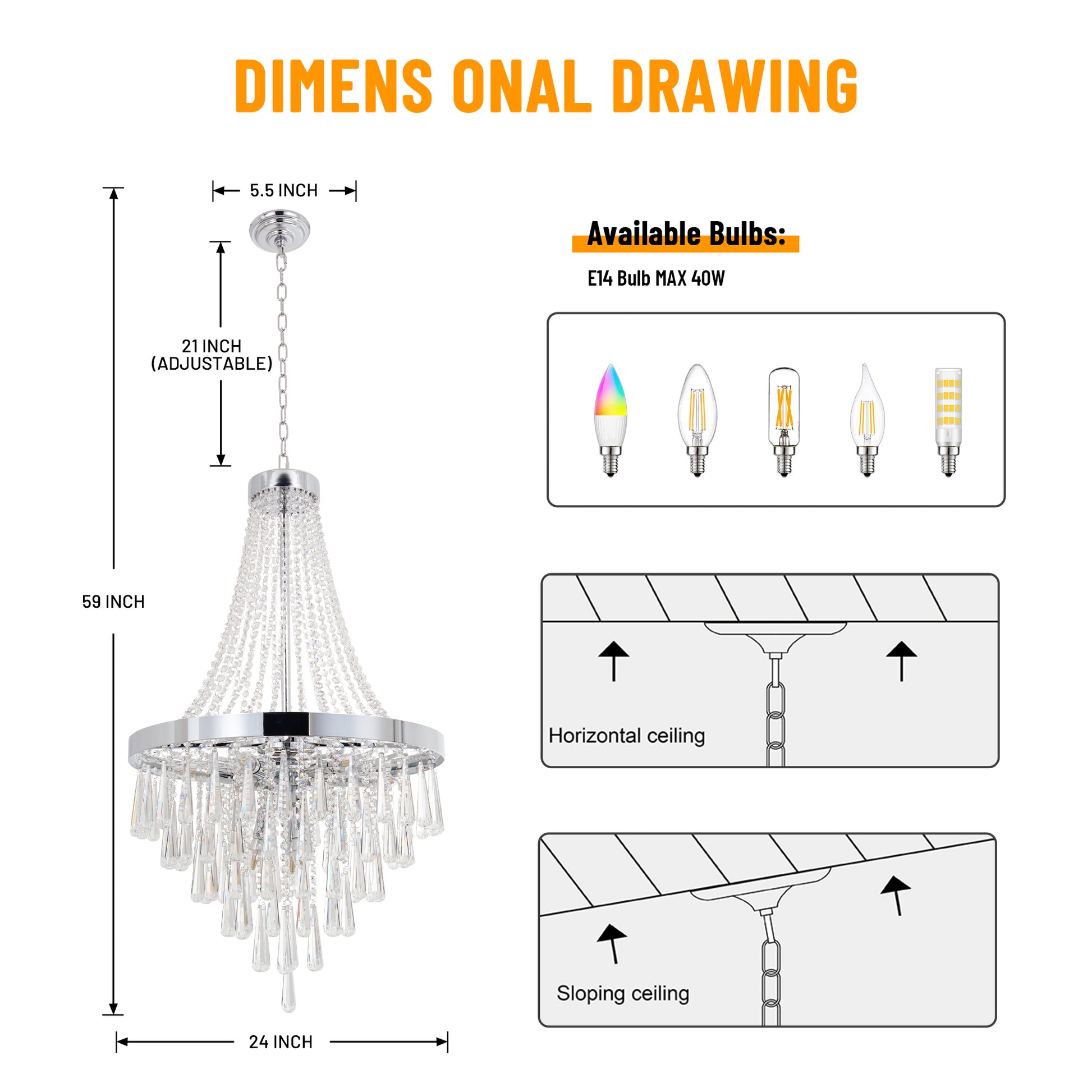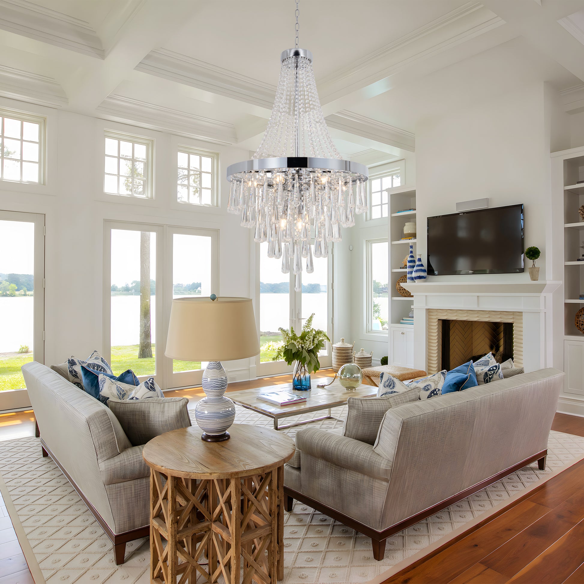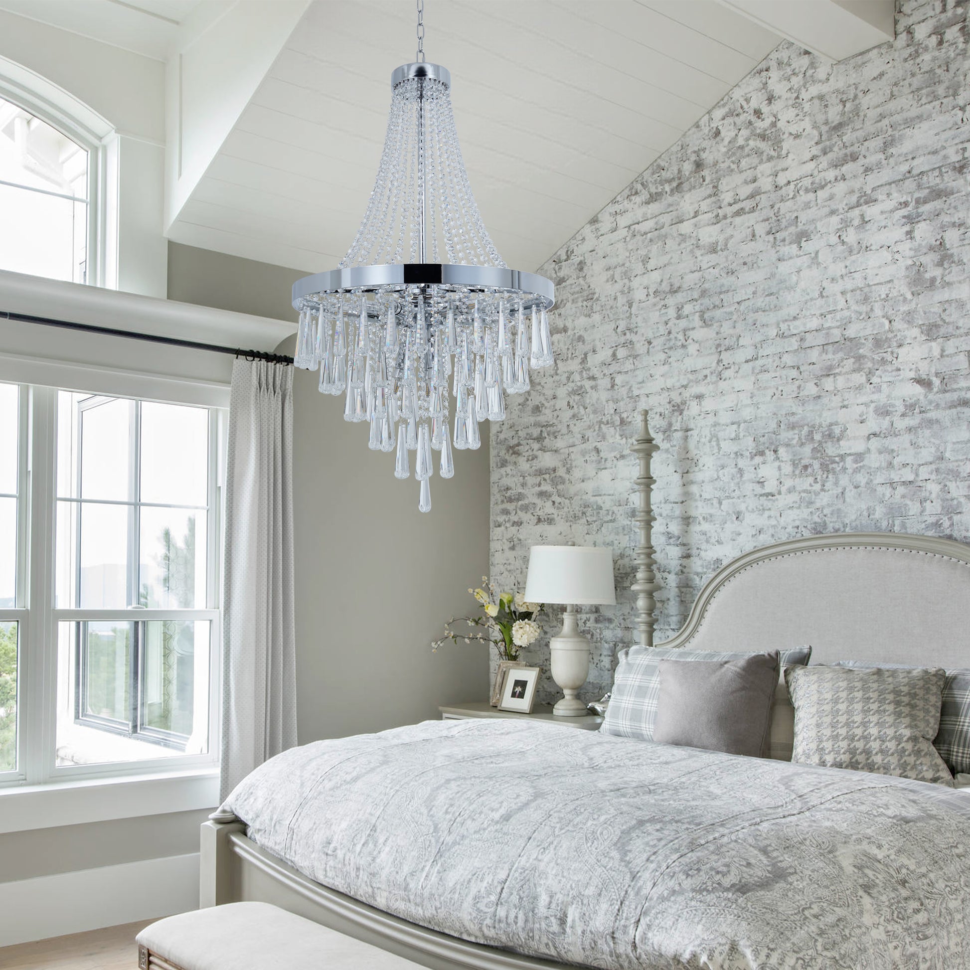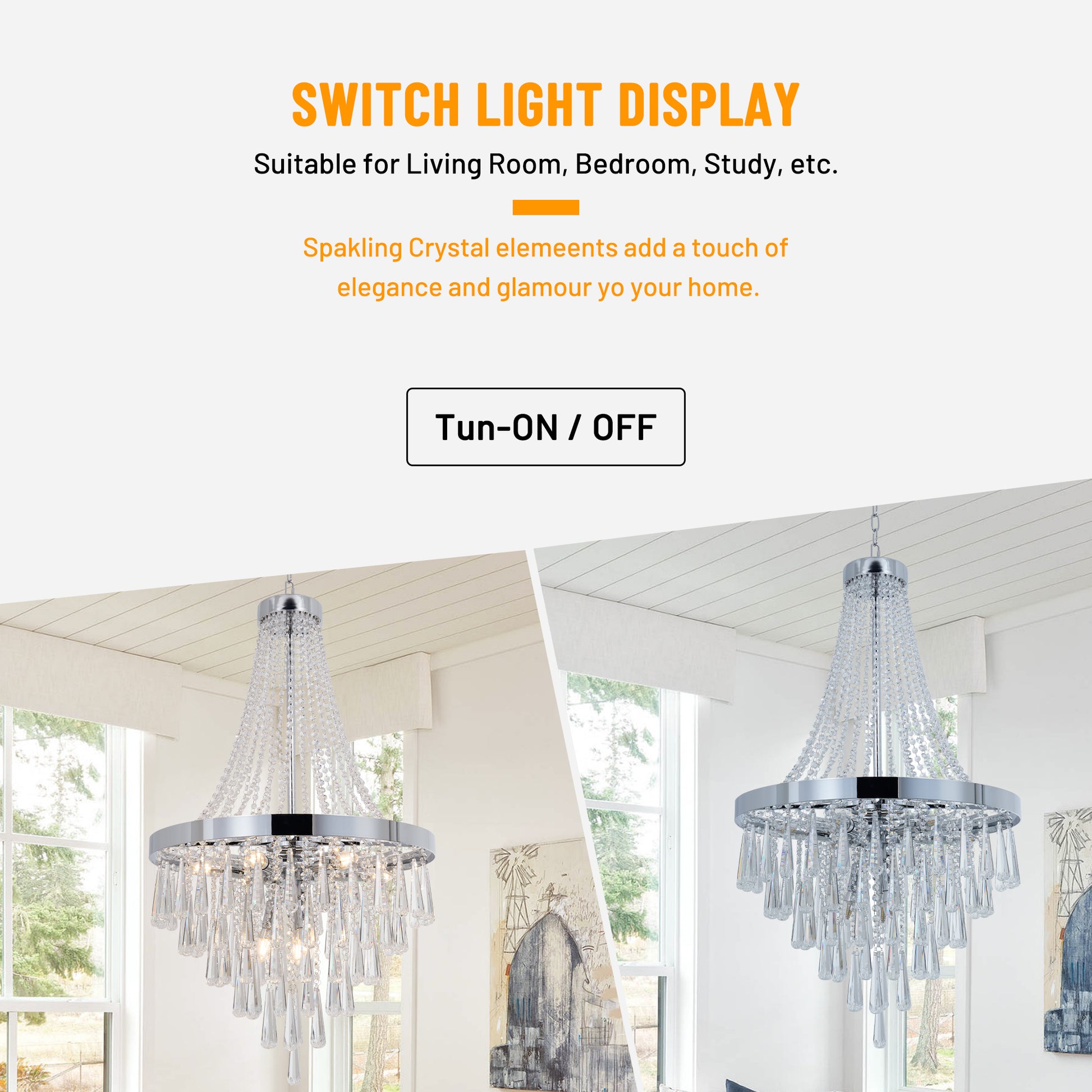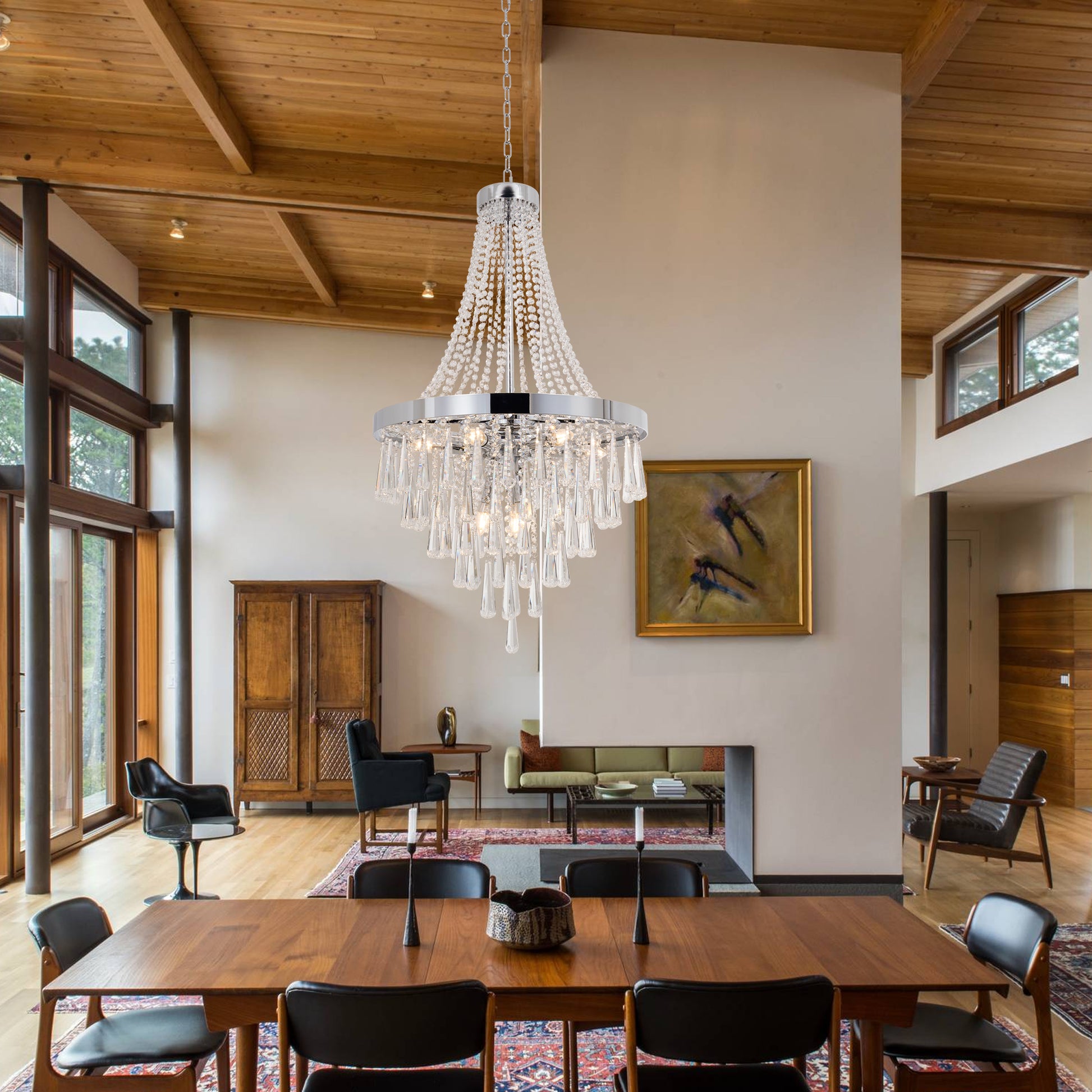 This elegant, classic crystal chandelier is a stunning centerpiece for living rooms, dining rooms, bedrooms, foyers, hallways, restaurants, entryways, and more. It can also be hung from sloped or vaulted ceilings.