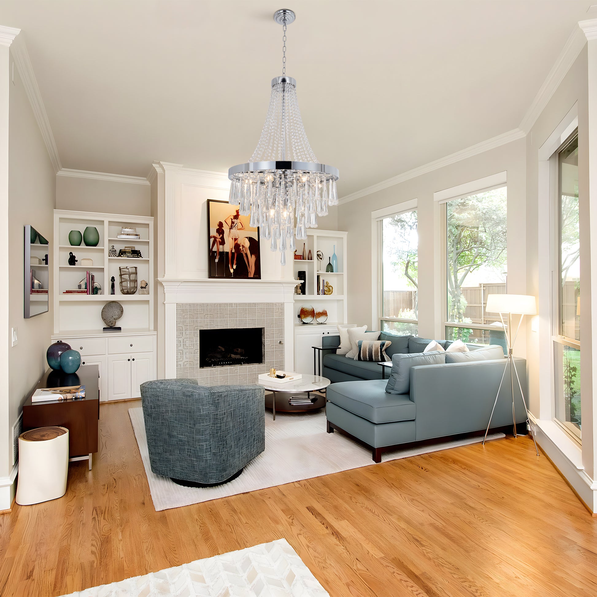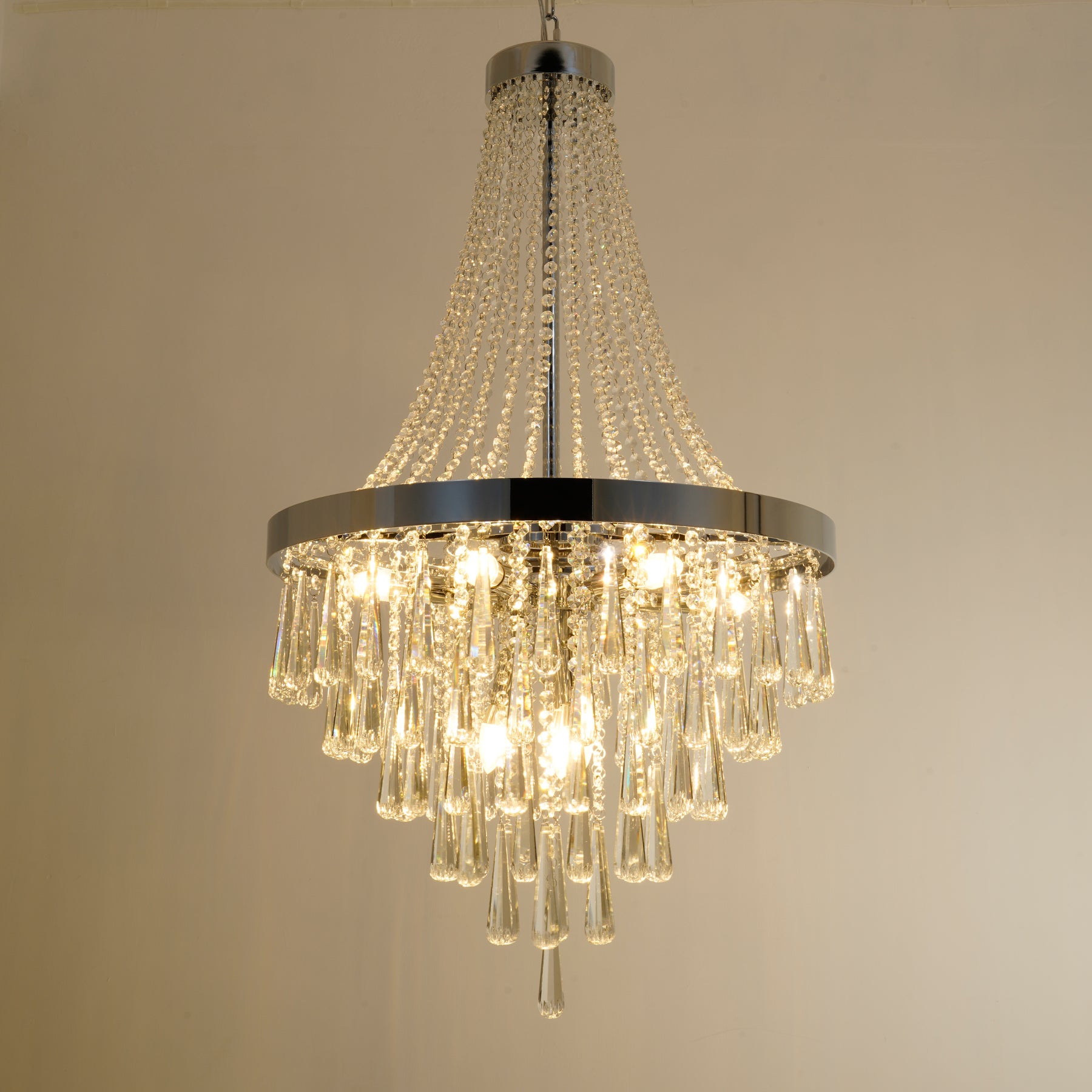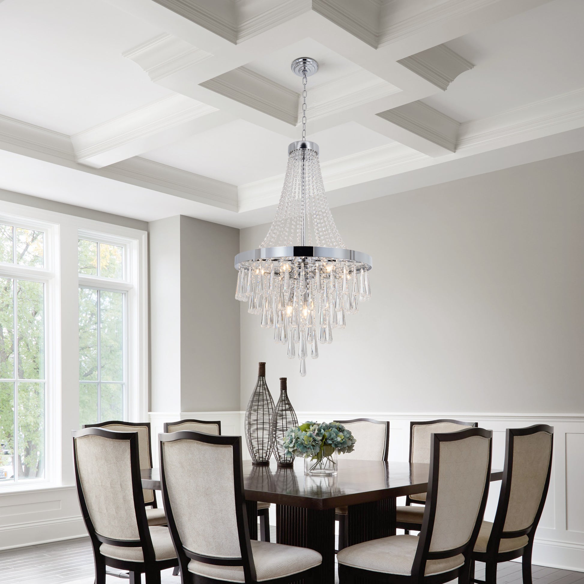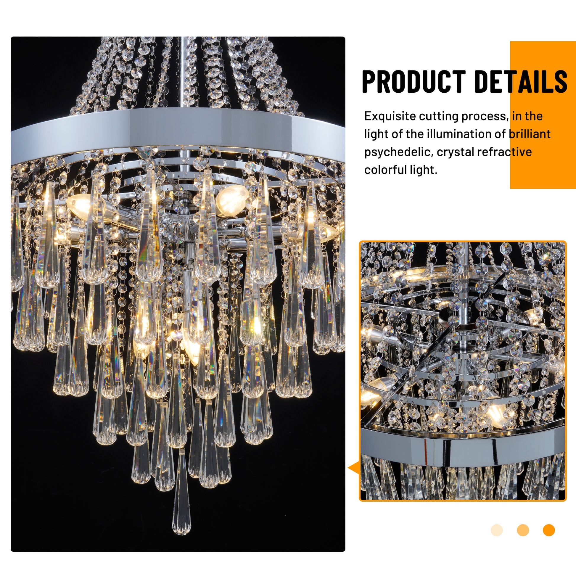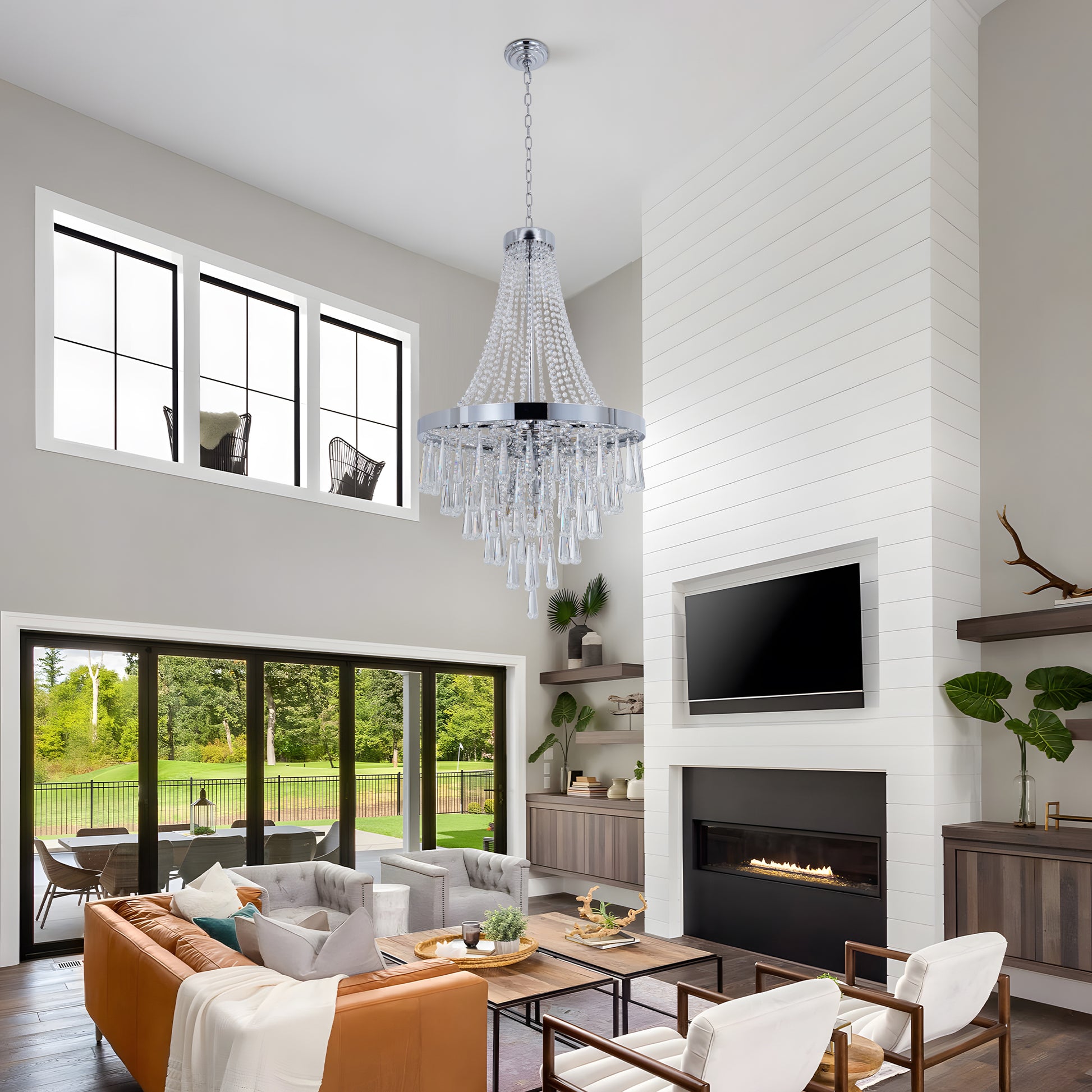 This elegant, classic crystal chandelier is a stunning centerpiece for living rooms, dining rooms, bedrooms, foyers, hallways, restaurants, entryways, and more. It can also be hung from sloped or vaulted ceilings.