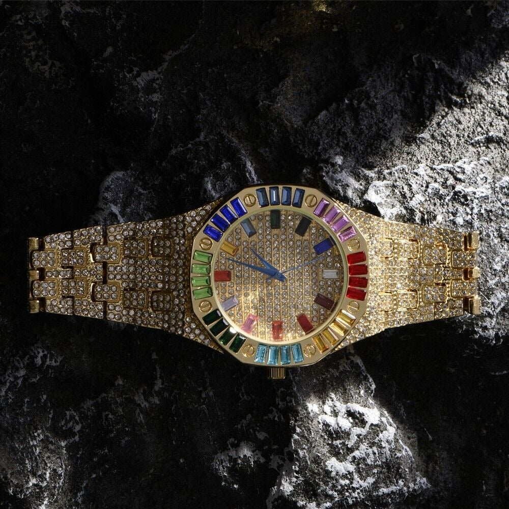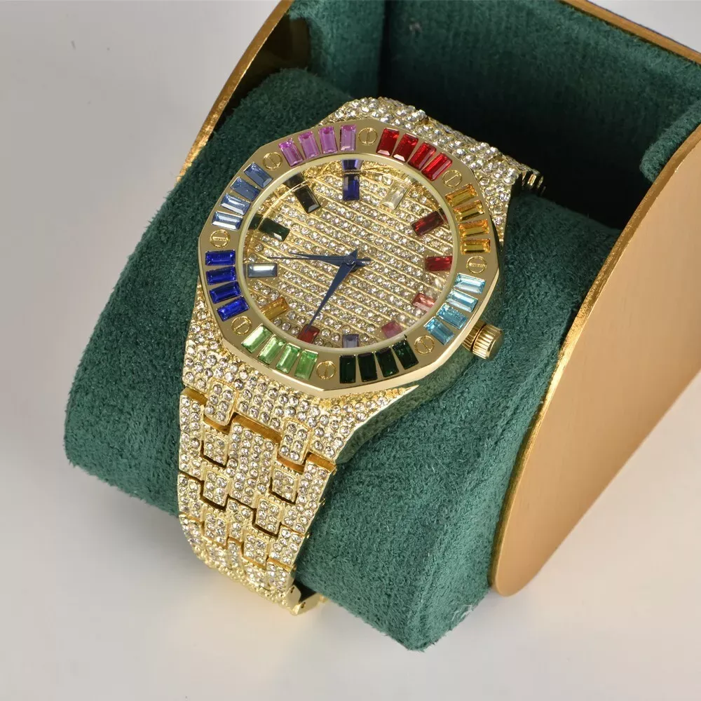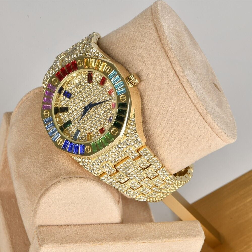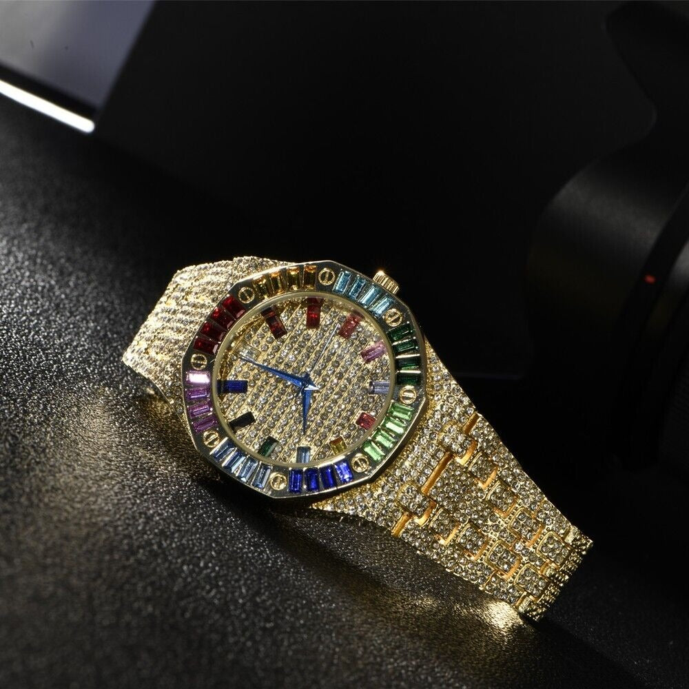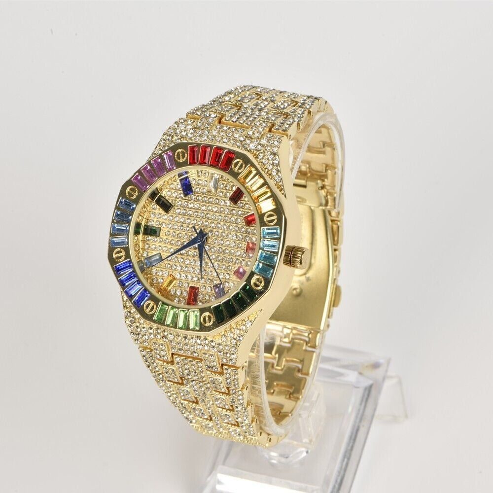 Men Gold Stainless Steel Watch Quartz Analog Business Rhinestone Wristwatches