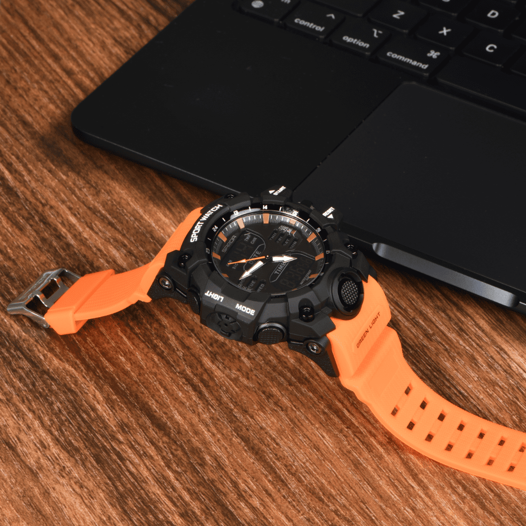Elevate your style with the OFNS Men's Military Watch. This multifunctional sports digital watch features a dual display for two time zones and is waterproof up to 50 meters.
