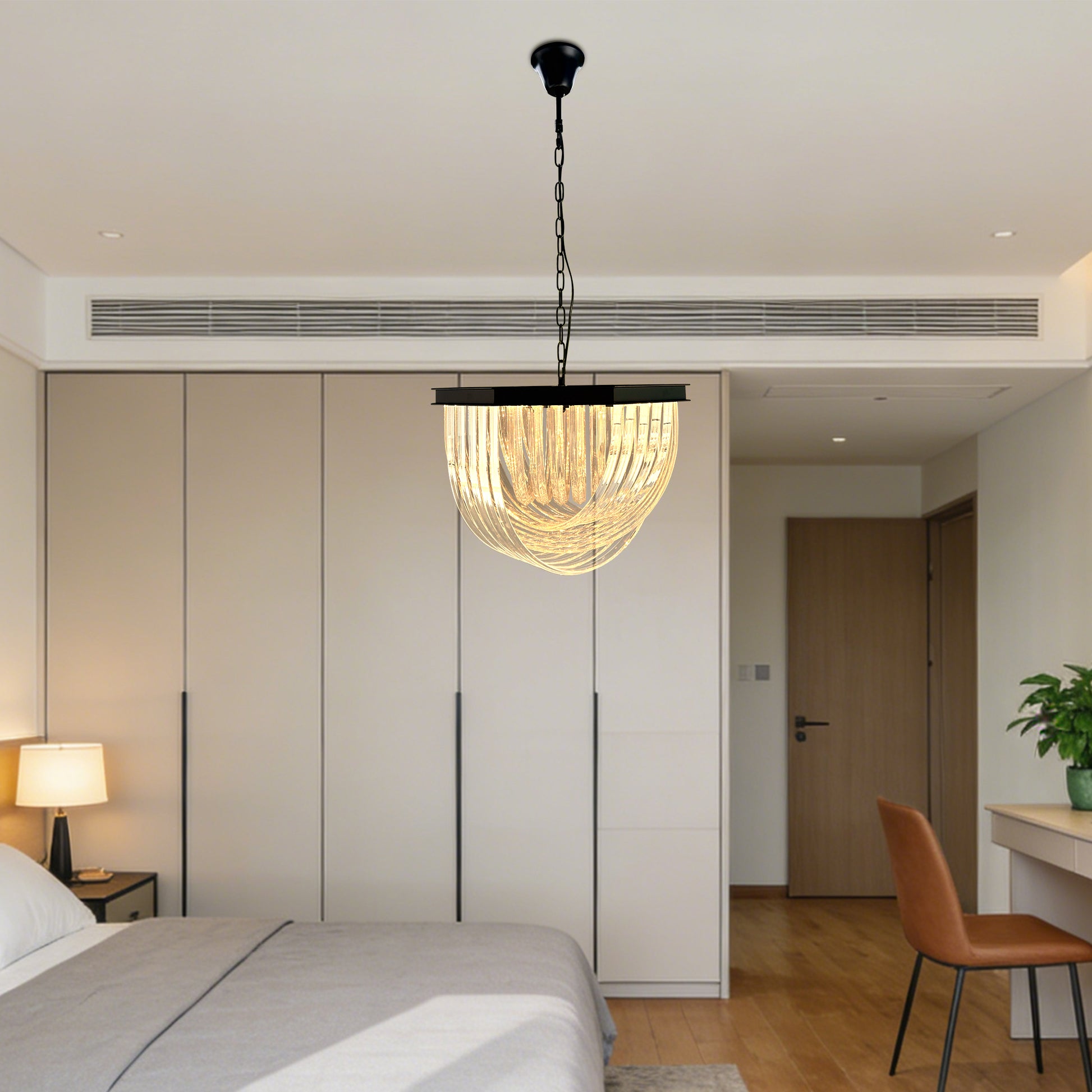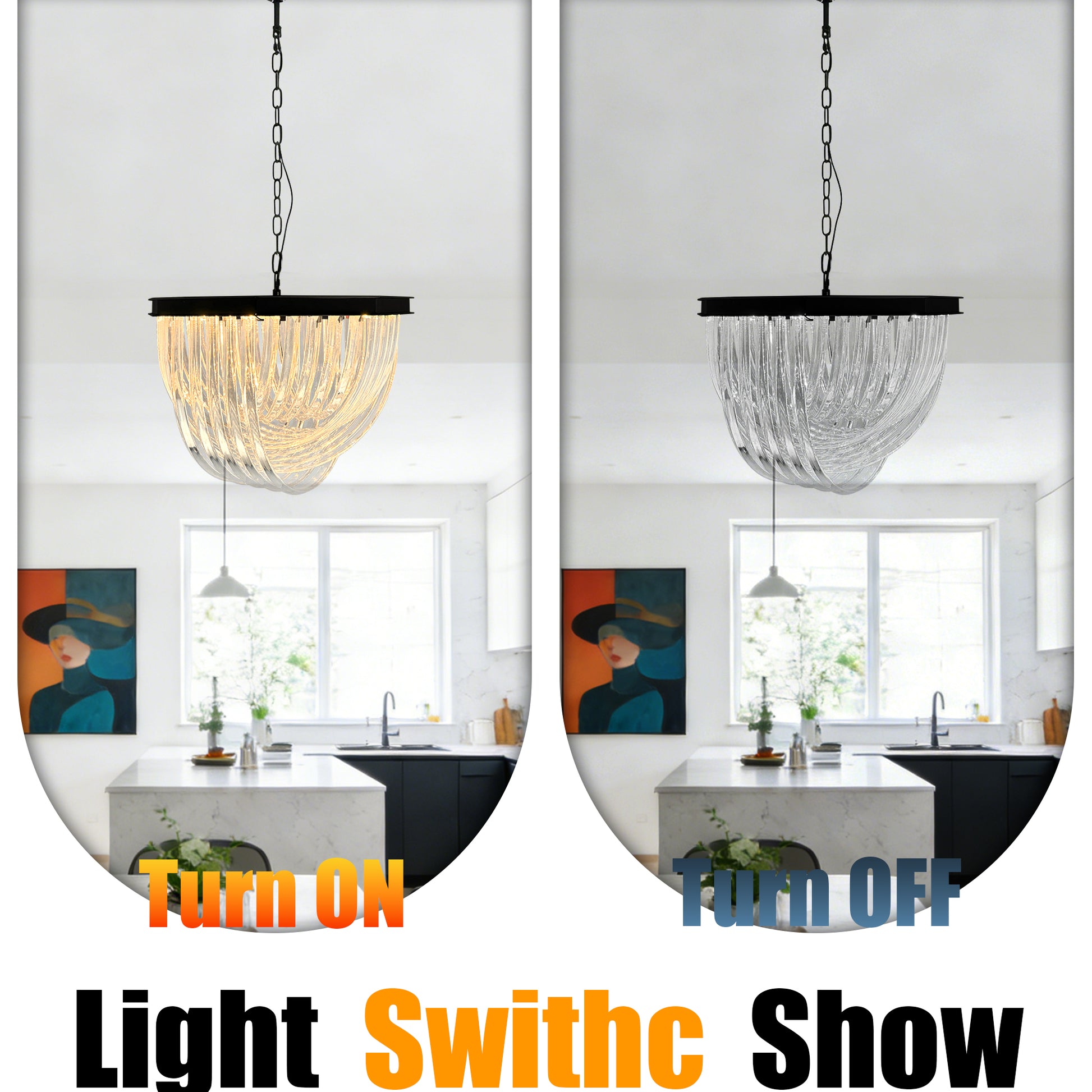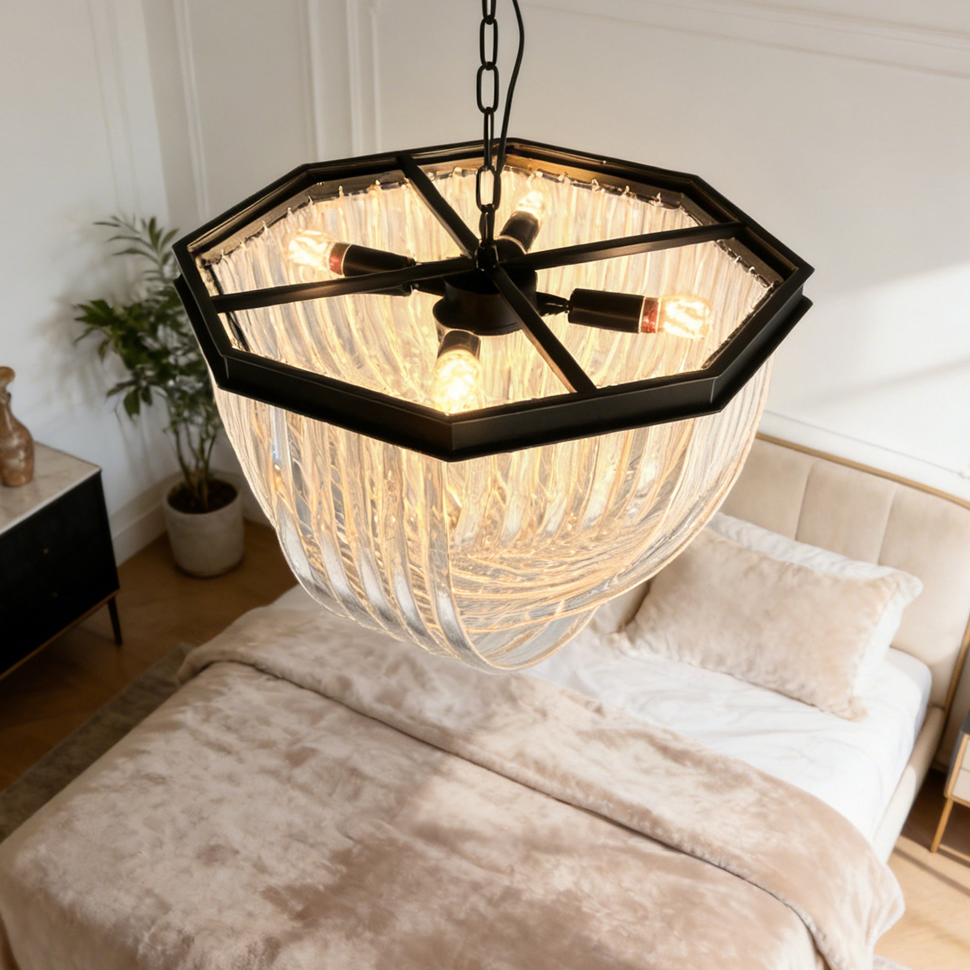 - Elegant Ribbed Glass & Octagonal Frame Design: The chandelier is framed by a black octagonal metal frame, adorned with cascading ribbed glass strips that curve into a soft, bowl-shaped silhouette. The glass strips diffuse light into a warm, dappled glow, creating a cozy, inviting ambiance while adding a touch of modern luxury.