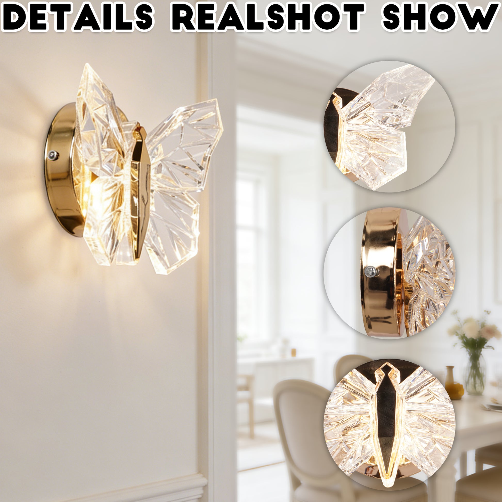 Geometric Crystal Butterfly Design: The sconce’s wings are formed from precision-cut, transparent acrylic that mimics the clarity of crystal, refracting light to create a dazzling, multi-faceted glow. The angular, modern silhouette of the butterfly adds a contemporary touch to any space, while the gold-finished central body and base provide a luxurious contrast.