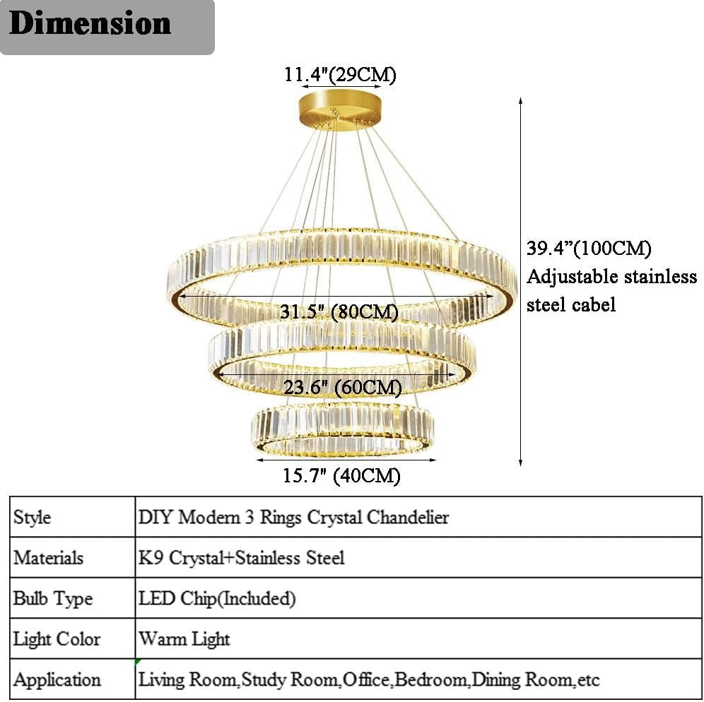 - 【Adjustable Height】The crystal ceiling lamp max hanging wire length is 39.4”(100CM, adjustable), you can adjust the wire length according to your ceiling height, meet low/high ceiling demand; 3 rings diameter: 15.7" (40CM) & 23.6" (60CM) & 31.5" (80CM). The canopy DIA:11.4"(29CM).
