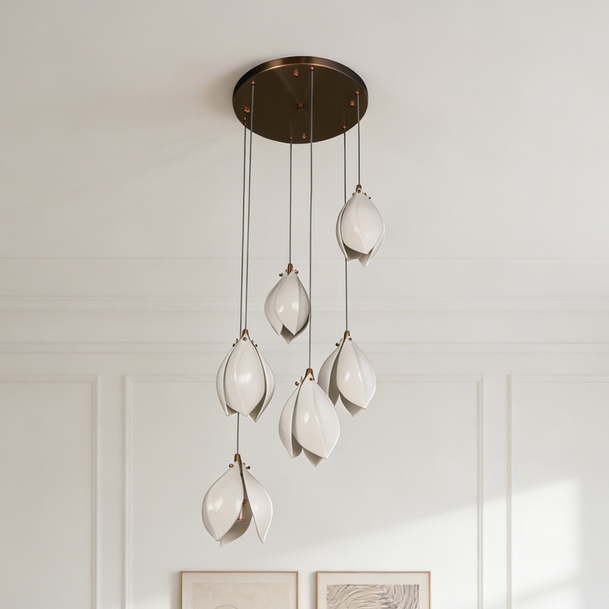 - Organic Magnolia Flower Design: Meticulously crafted into a plump, petal-like silhouette, each white ceramic shade mimics the delicate curve of a magnolia bud. The gold metal canopy and petal connectors add a touch of refined luxury—when illuminated, the ceramic petals diffuse light into a gentle, warm glow that highlights the bud’s smooth contours and natural, floral charm.